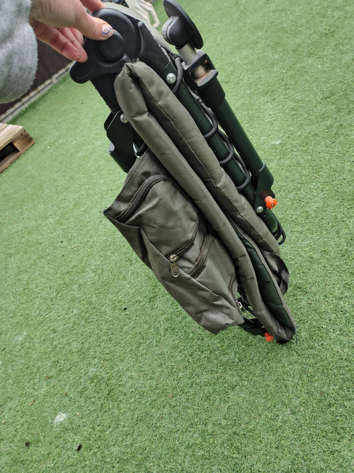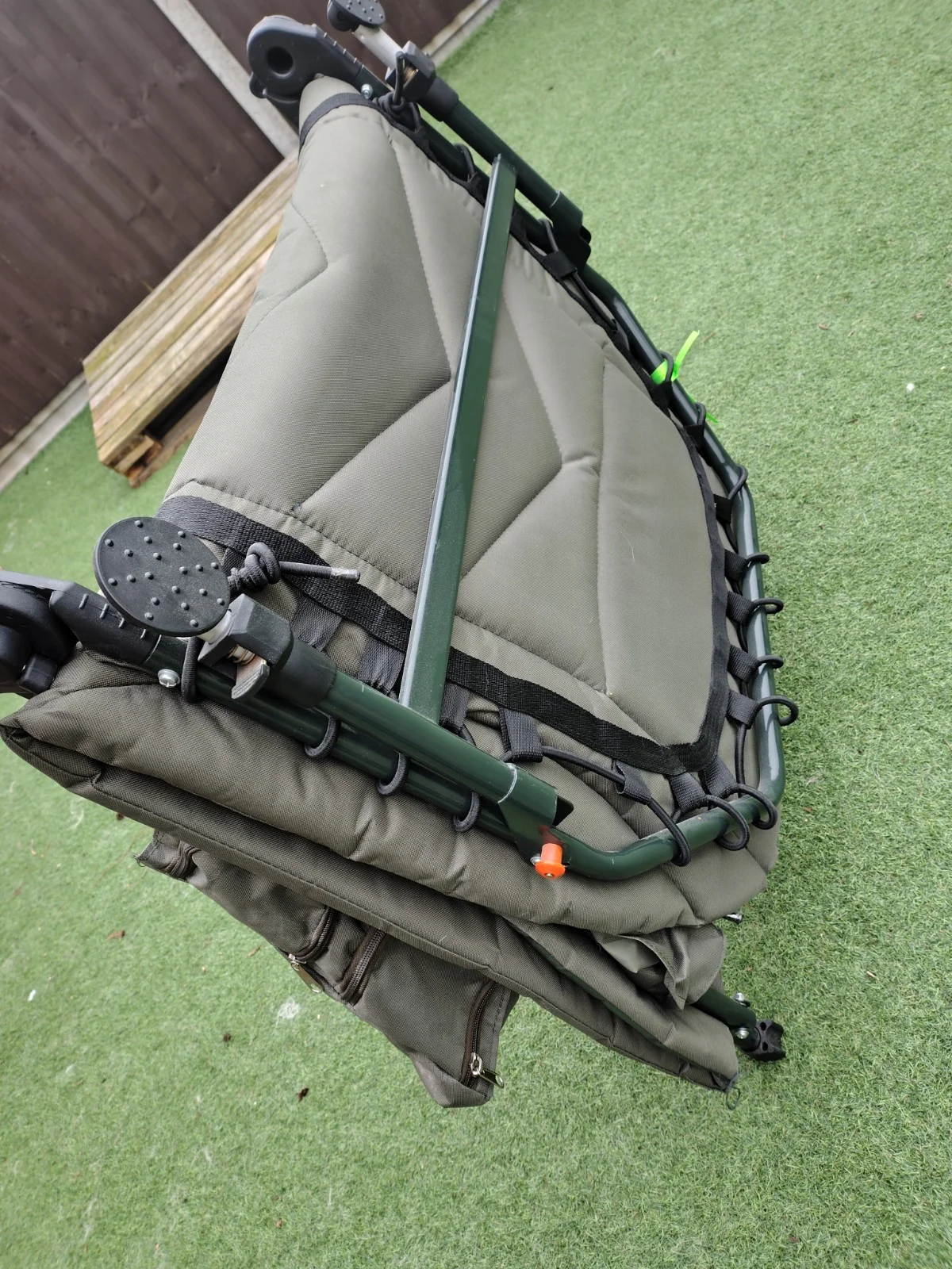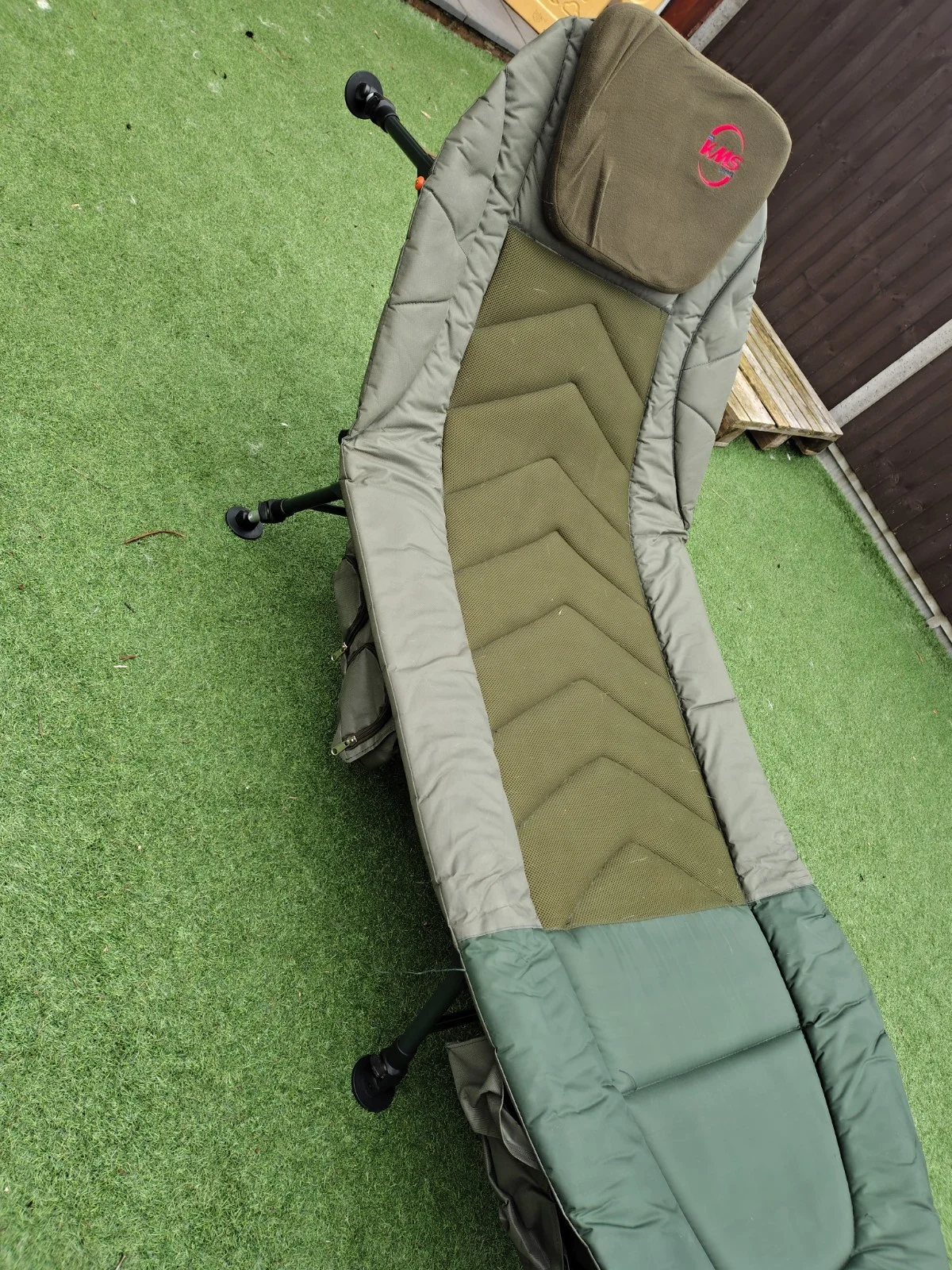KMS direct branded fishing bedBeen used for camping trips mainly so stayed clean and no signs of rust.Very good condition - some traces of dog fur still present.No longer neededCollection only from LN6 0Product Features:* Strong steel frame;* Detachable fleece covered pillow;* Air flow material for padded back cover, good breathability;* Smooth fabric at foot part which is easy to be cleaned;* 6 legs design for stability;* Adjustable mud feet;* Easy Reclining system;* All legs individually adjustable;* Foldable for easy transport and storage;* Great for outdoor activities, such as fishing, camping...Product Specification:* Colour: Dark Green;* Frame Material: Steel;* Top Material: 600D PVC coated Oxford;* Product Size:L210 x W85 x H(30-42)cm;