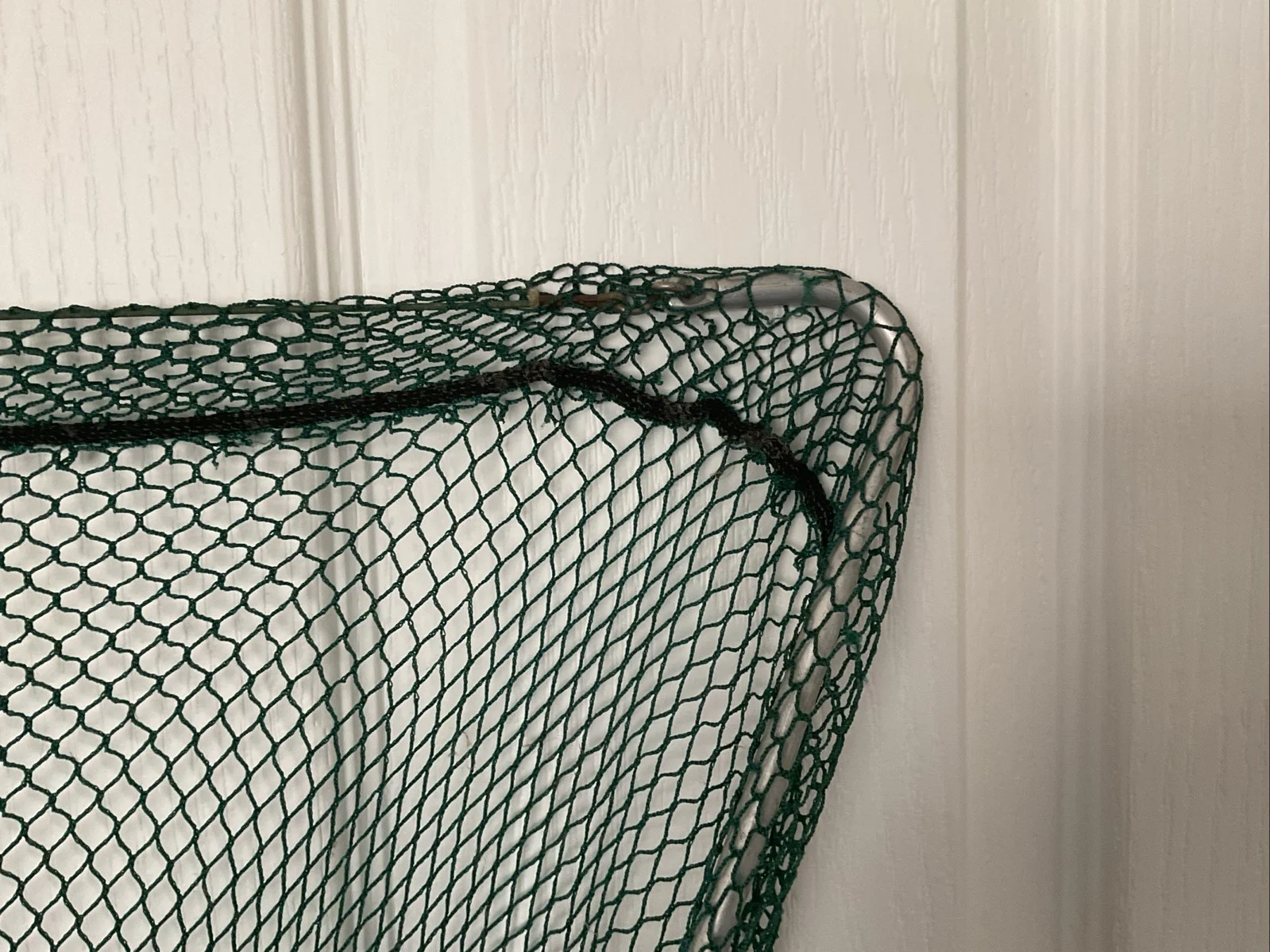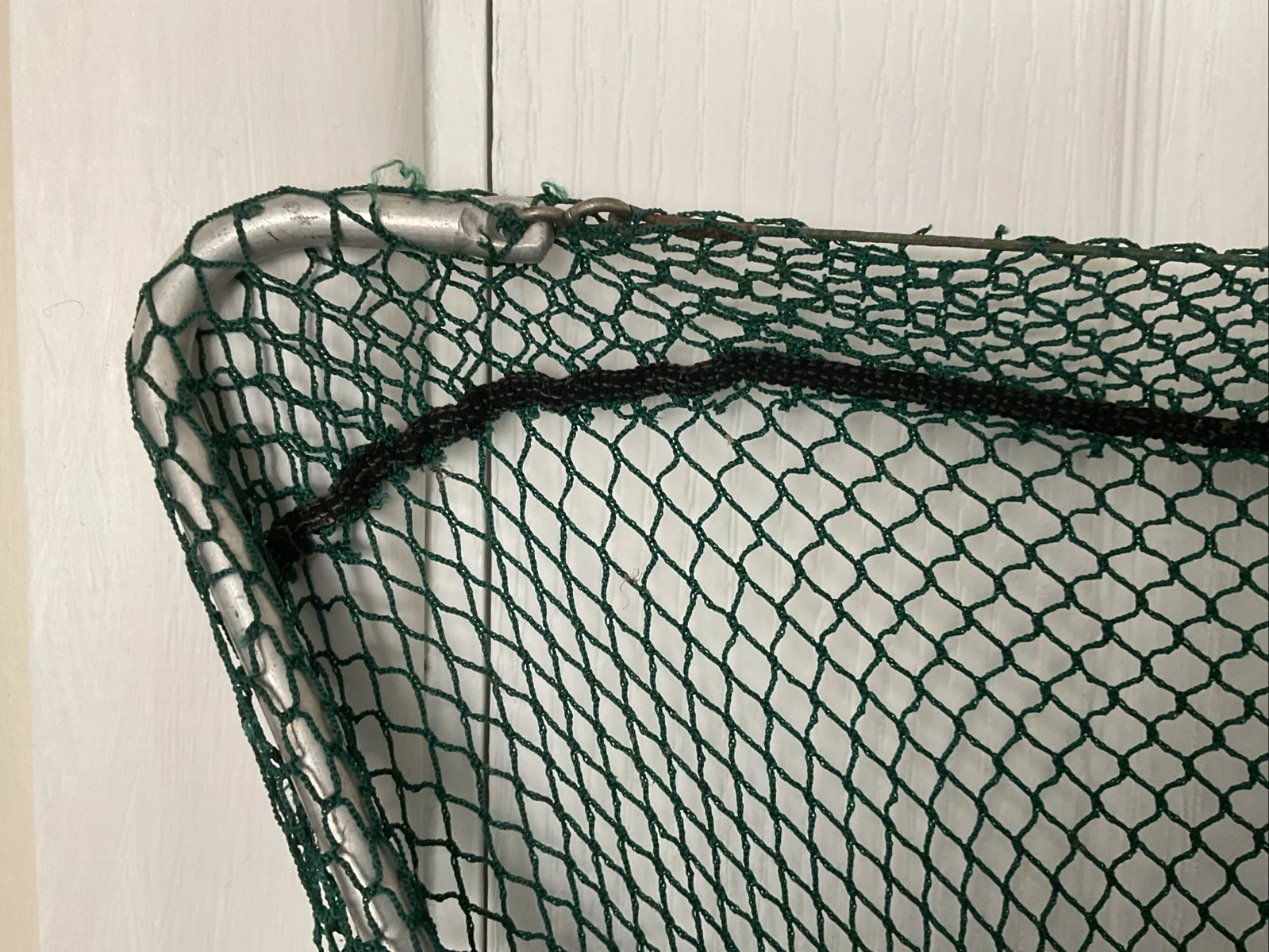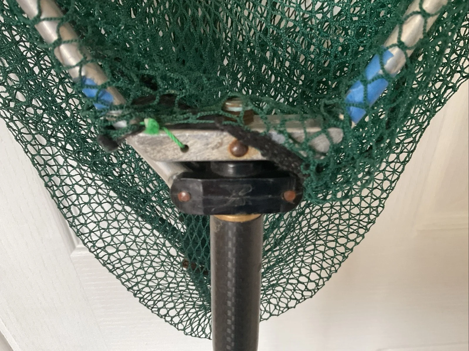 Vintage Efgeeco landing net 24” arms. Knotless net in very good order. with two small snags. (May be others but none that I noticed). The spreader block requires a replacement circlip to keep the threaded block fixed to the frame when folded. They are readily available on the internet. I have used it with a piece of cord to connect it. They are easy to lose on the bank . All in all a very nice example of this vintage net.
