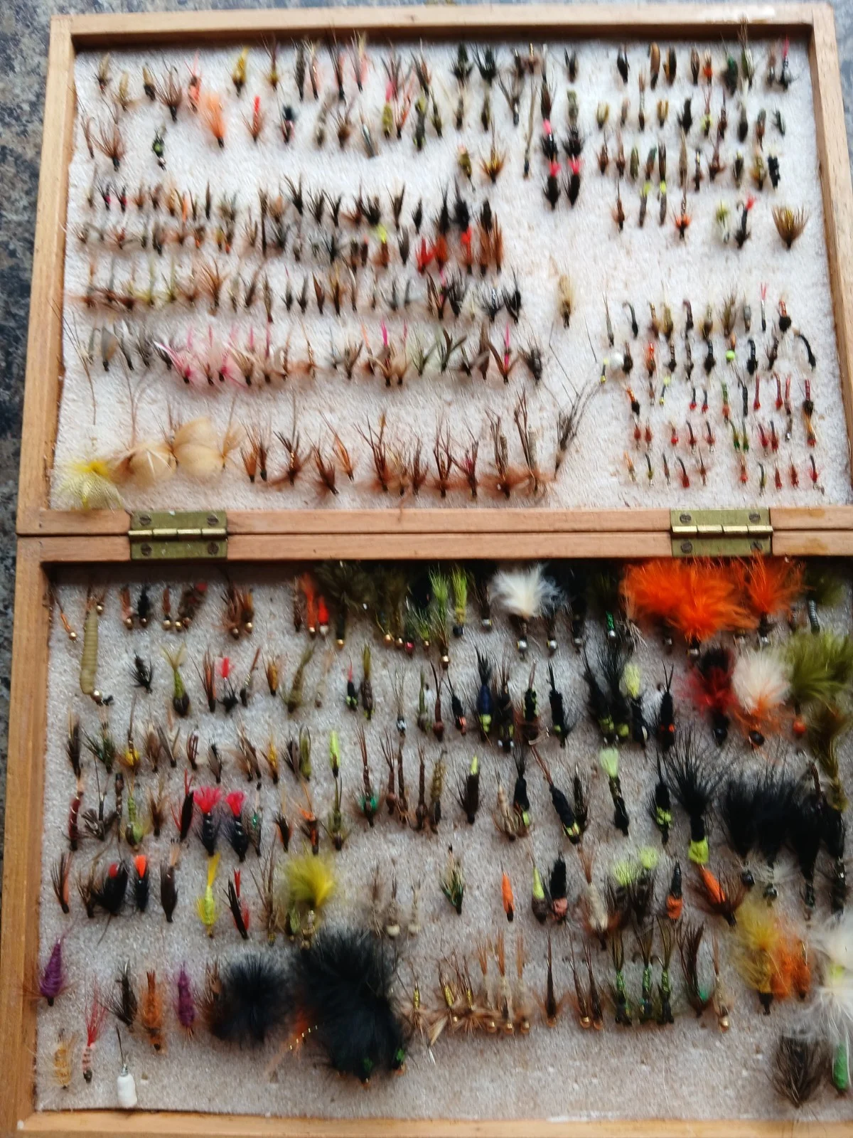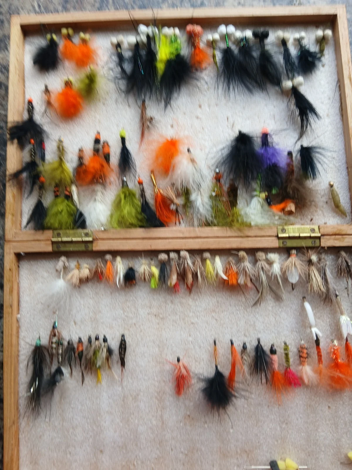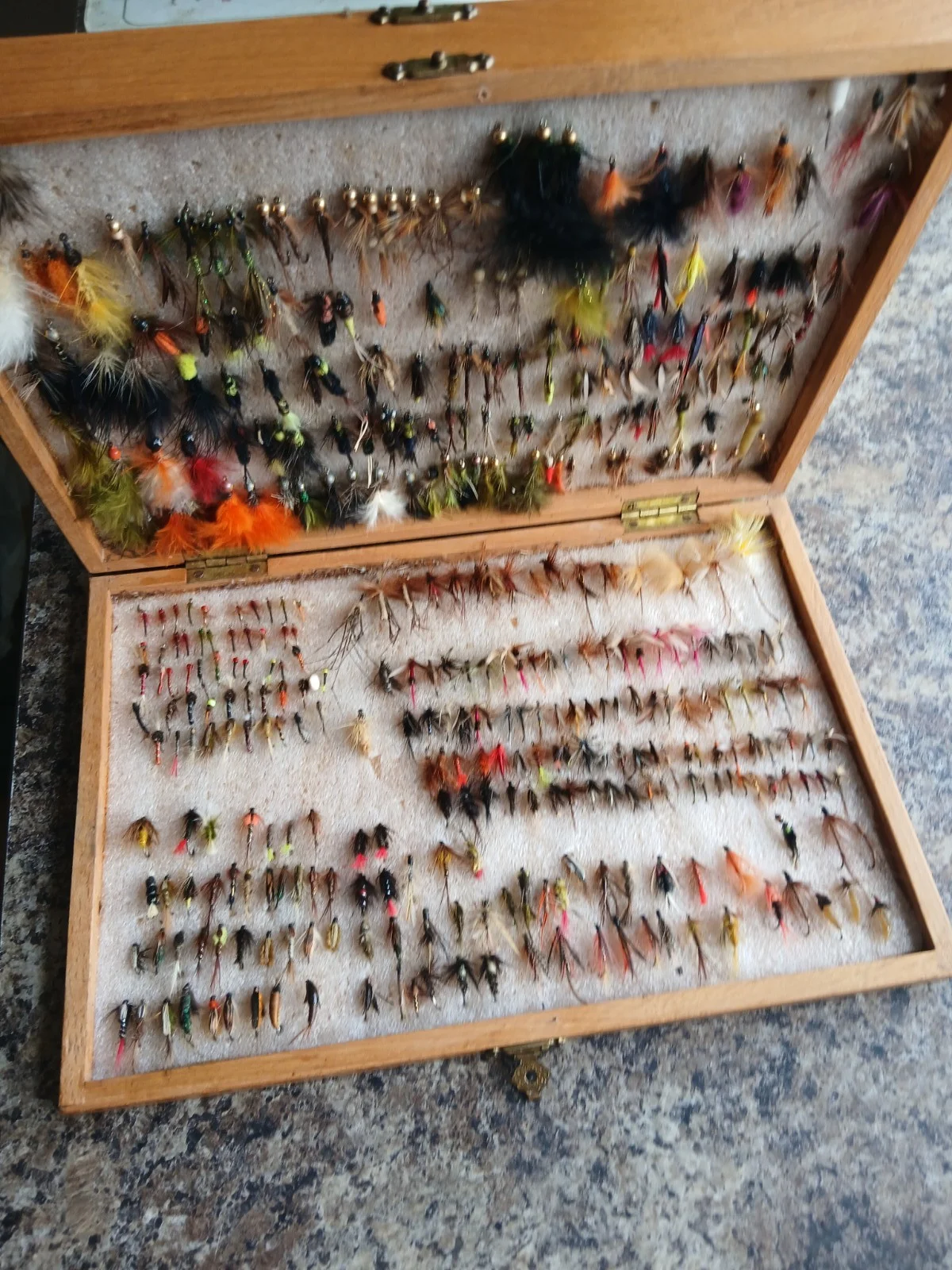 Fly Fishing Flies In Wood Box Vintage 28.5x19.5x5.5cm. No personal expertise, please see pictures.