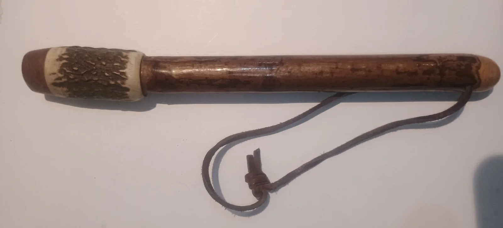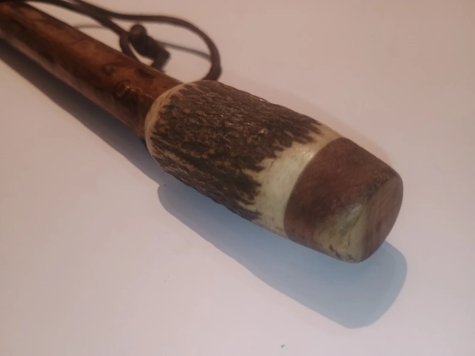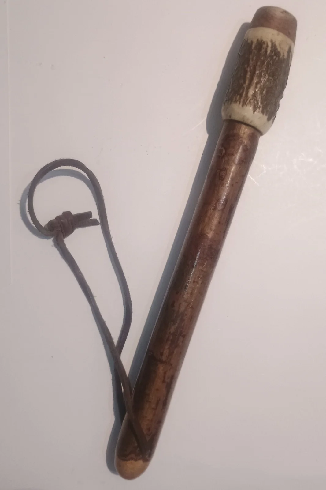 Smart fishing priest in carved polished wood with a weighted end of wood and horn - it actually sits in the hand really nicelyit has a leather loop to one end and is approximately 9 inches long; the horn collar is about 1 ¾ inches long. there seems to be a colouration variation in the wood at the top but seems to be all one pieceplease see all pics for details..........