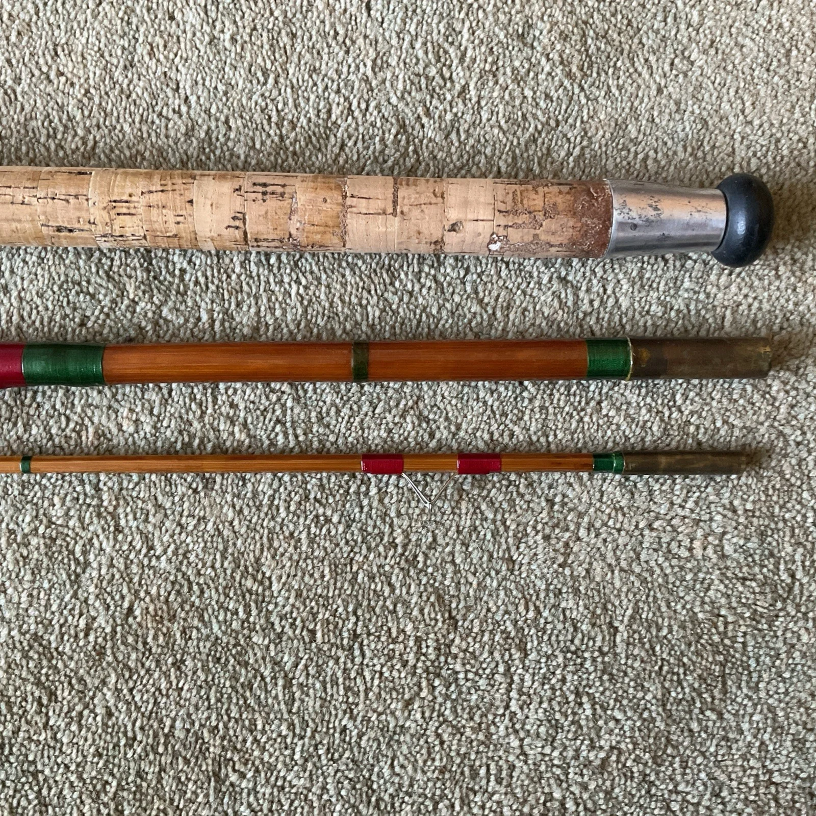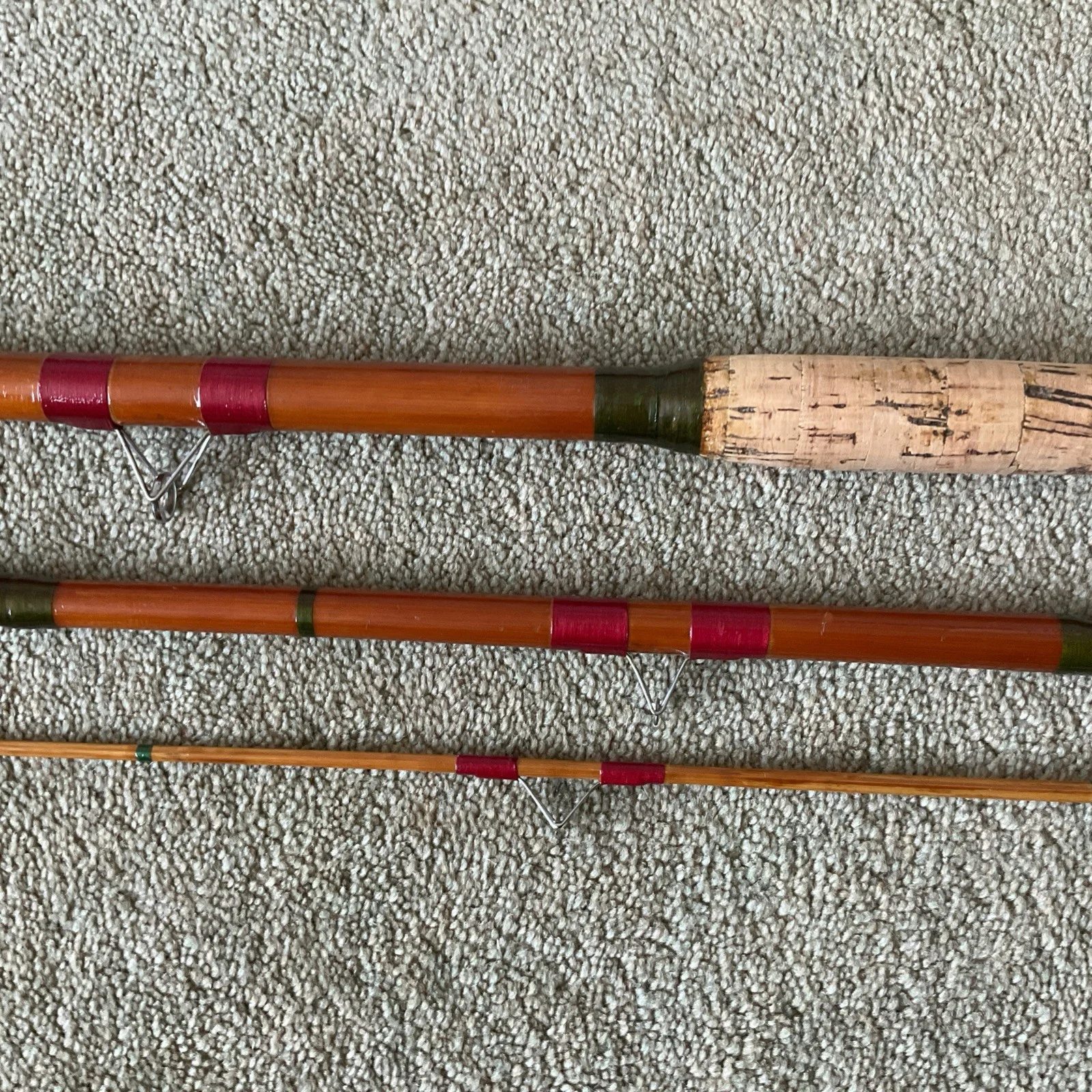 Clayton of Boston. Fenland Float Rod. Butt and mid joint whole cane. Tip joint split cane. 11ft 6in (minus butt cap.I believe this is the correct length judging from the ring spacing on the tip. The first inter was usually about 7 1/2” from the tip . I replaced the chrome intermediates. The lined butt and tip rings are original. The rod is straight and has a tIp action. More flexible than a rod with a spliced tip . The 23 in cork handle is in good order. The ferrules are a good fit. The female ferrule on the butt joint has knock and would benefit from being refitted. The varnished finish is in good order. The varnish is light brown . (I have never been able to replicate it. )The rod would have been made in the late 50’s early 60’s. Comes with a twill bag . In good clean condition and requires new tape to middle of bag. All in all a nice example of Fenland float rod of that era.