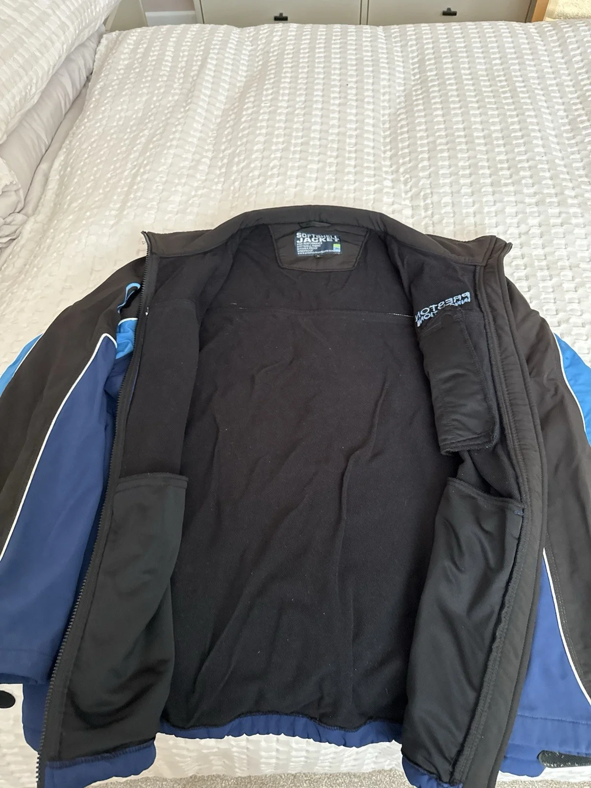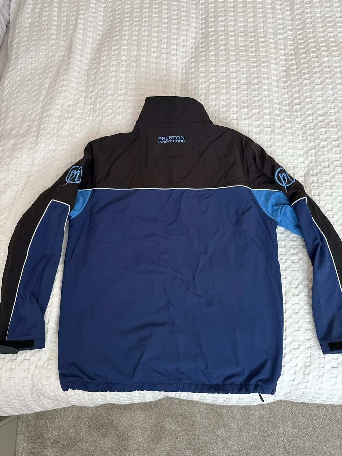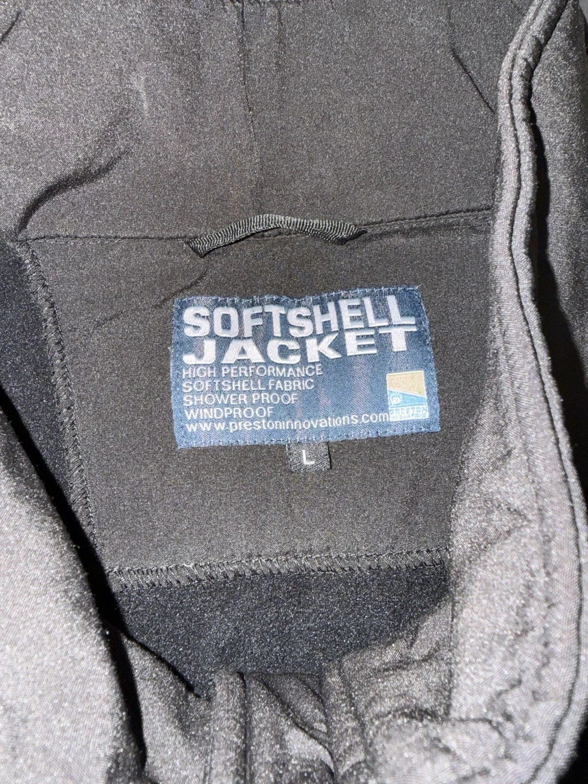 Preston Innovations Soft Shell, shower and wind proof Jacket , size large. Item is in good condition and has only been worn a few times. All zips on pockets and main front working, excellent, all year round jacket for typical British weather. Warm inner fleece lining and soft shell shower proof outer layer.