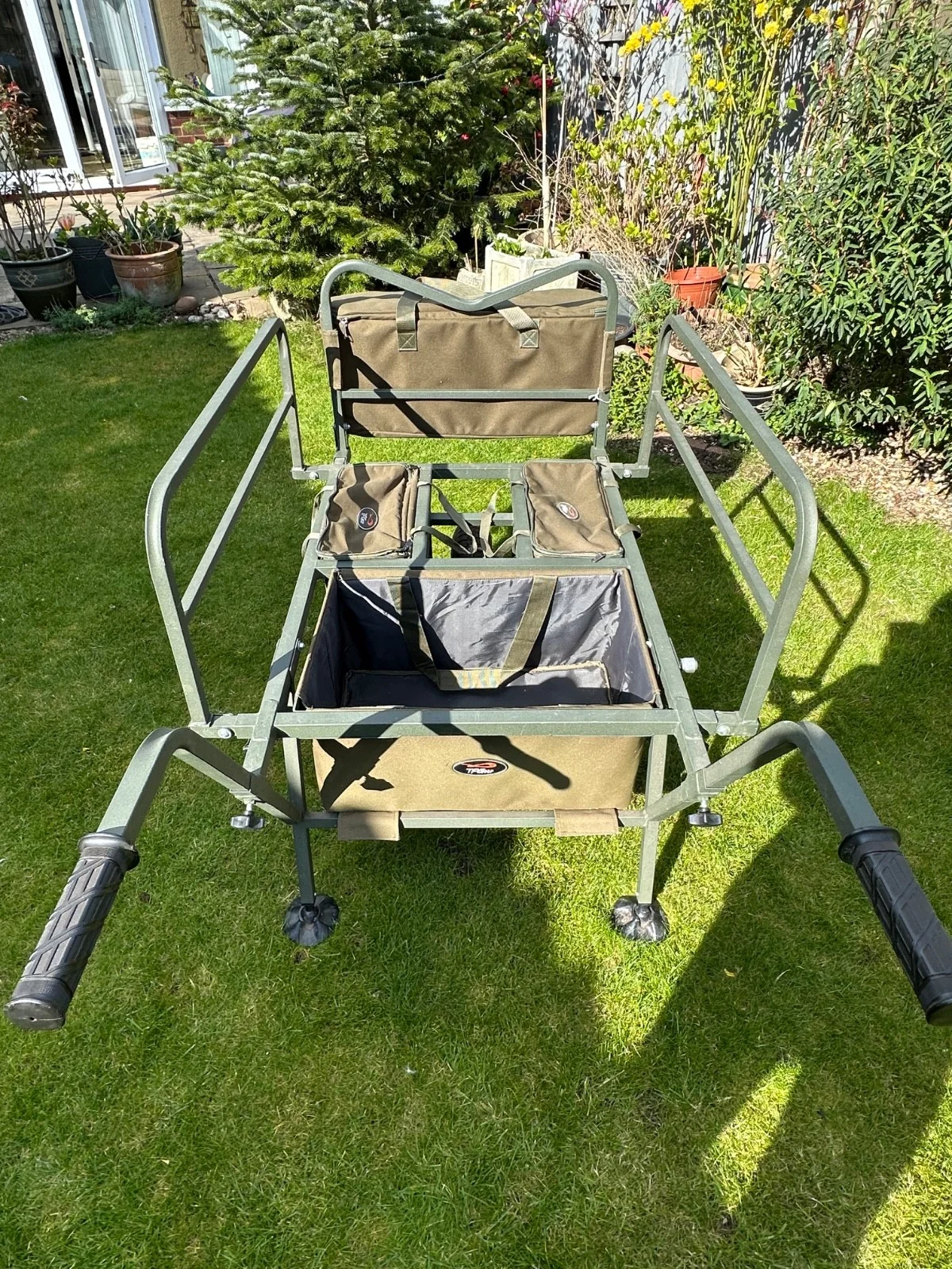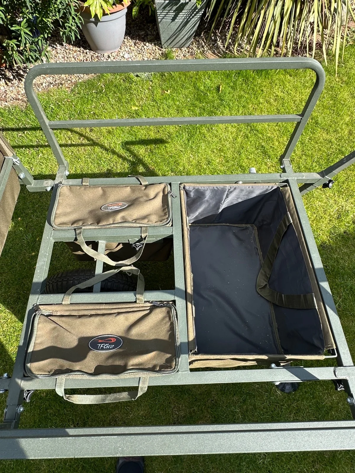 This TF Gear fishing barrow is in very good condition. It includes four useful barrow bags, one of them insulated. It has adjustable sides to increase the carrying capacity and adjustable handles for various heights.