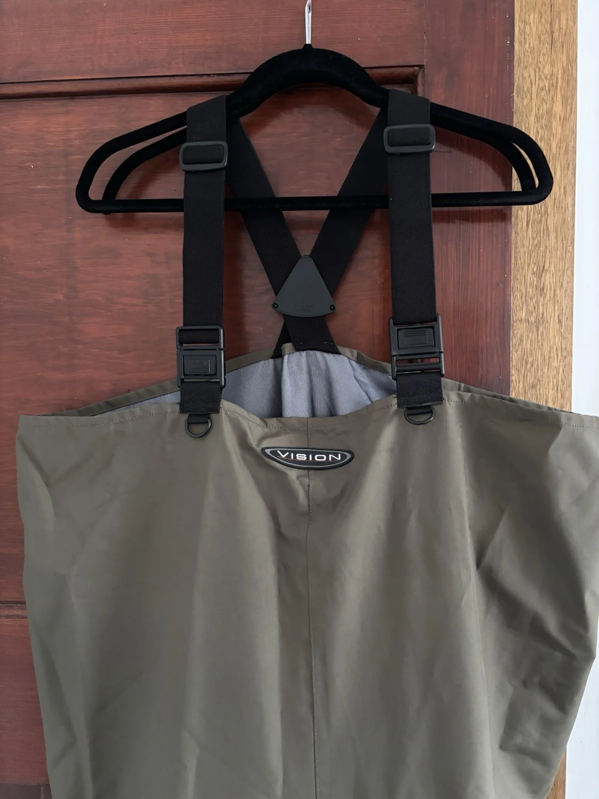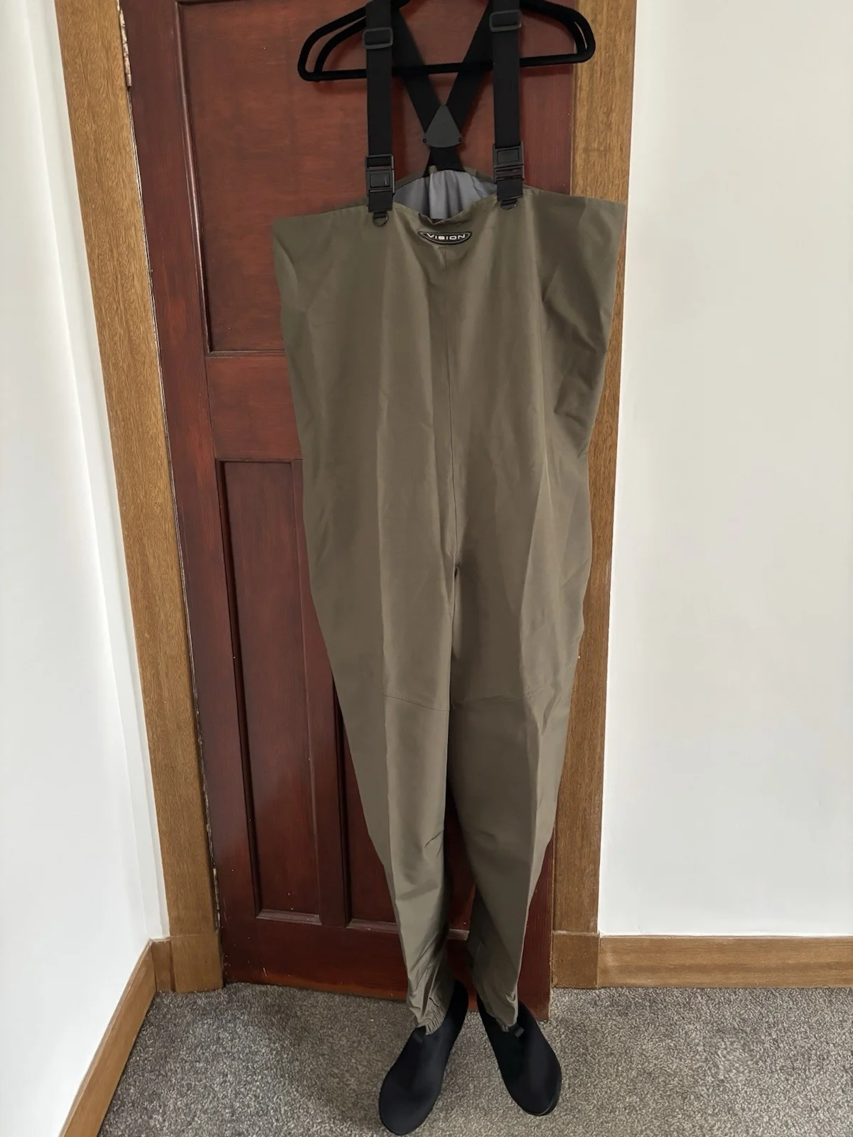 The Vision fly water stockingfoot chest waders in size XXL are designed for men who enjoy fishing in a challenging environment. Made from neoprene, these green waders offer excellent insulation and flexibility, making them ideal for colder waters. The stockingfoot feature provides extra protection for the feet and ankles, while the chest wader style offers a comfortable fit. With the Vision brand known for quality and durability, these waders are a reliable choice for any angler looking for a high-performance fishing outfit.There are a couple of small marks on the body, otherwise in excellent condition.