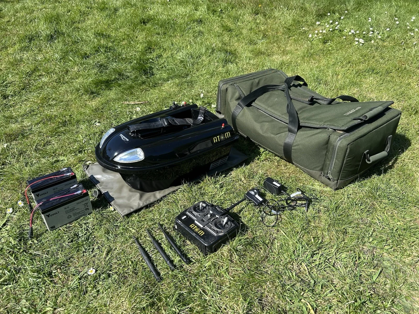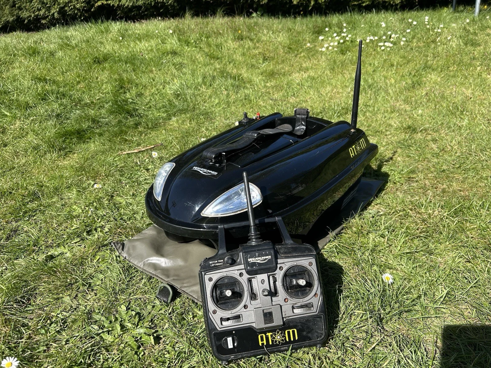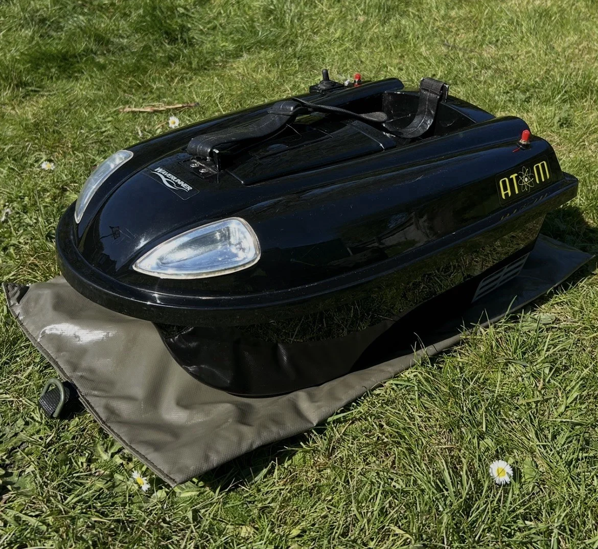Waverunner Atom Mk1 (original 2.4ghz version)Used a good few times. Reliable little workhorse of a boat. I’ve had new metal handle brackets made especially to upgrade the original plastic ones which weren’t always that durable. Comes with 3 aerials (1 x brand new one and 2 others which have been damaged and then repaired over the years). Features a hook release mechanism on the back also as well as being able to place the rig in the hopper. Also comes fitted with a fish finder aerial socket (although fish finder is NOT INCLUDED) Key Features of the Waverunner Atom 2.4GHz:Capacity & Performance: Features a 1.5kg, magnetic, single hopper that can be used for both bait and hook release.Radio System: Operates on a 2.4GHz digital system, reducing interference.Operating Range: Effective range of approximately 400 meters.Propulsion: Two independent, maintenance-free motors allow for precise steering.Lighting: Front headlights and rear navigation lights for night-time operation.Run Time: Approximately 1.5 to 2.5 hours at maximum speed.Components & Included Accessories:Handset: 4-channel remote control.Batteries: supplied with 2x 12V boat batteries, and 8 x 1.5V AA rechargeable batteries for the remote. Accessories: Includes a charger for both boat and handset, and a Saber carry case.