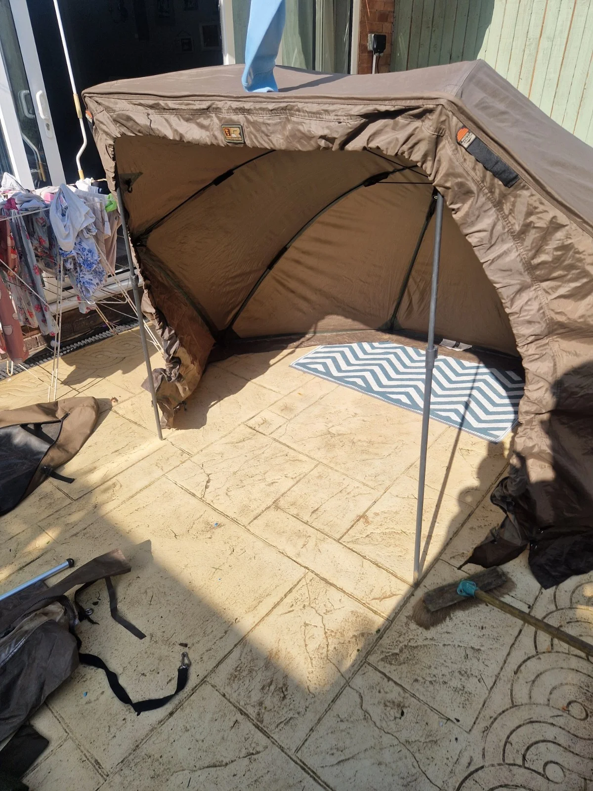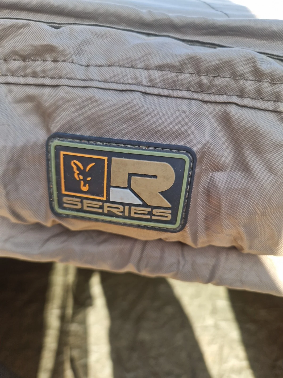 fox r series brolly system in decent condition and full working order ,selling due to upgrade, slight hole as pictured in side and door but doesn't effect use, only ever used mozzarella mesh insert and hole on bivvy doesn't let in water