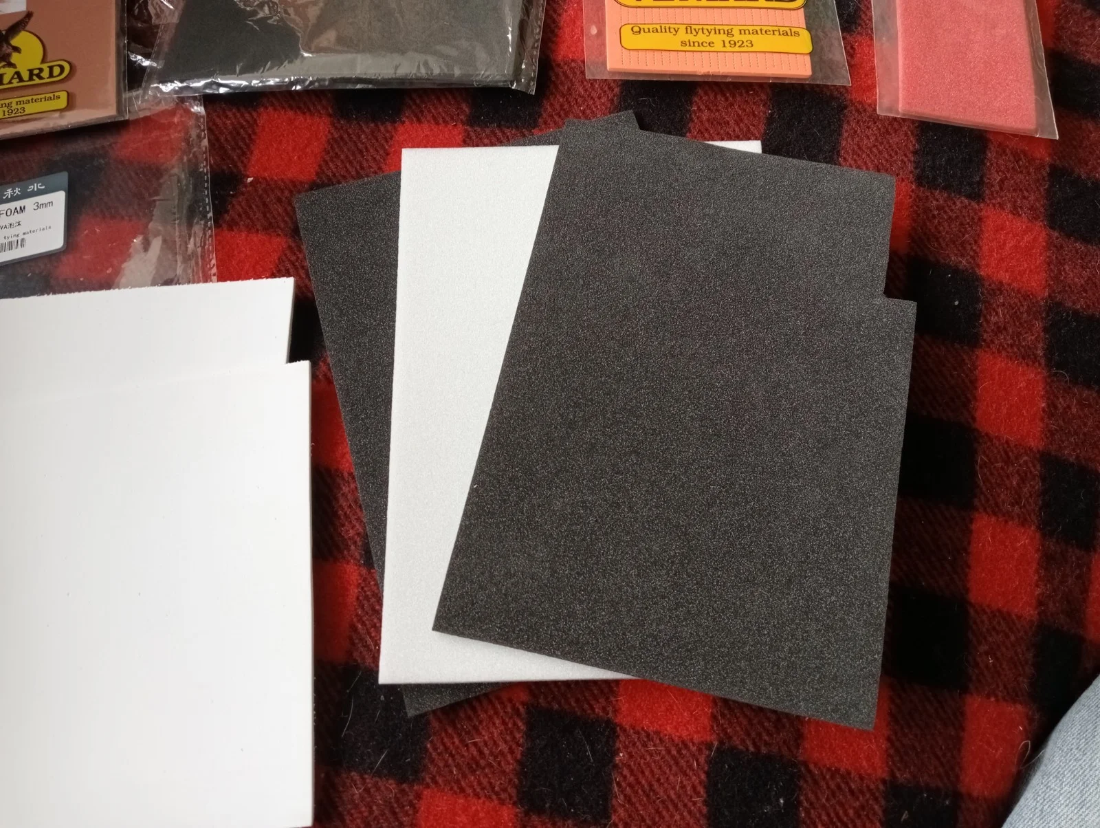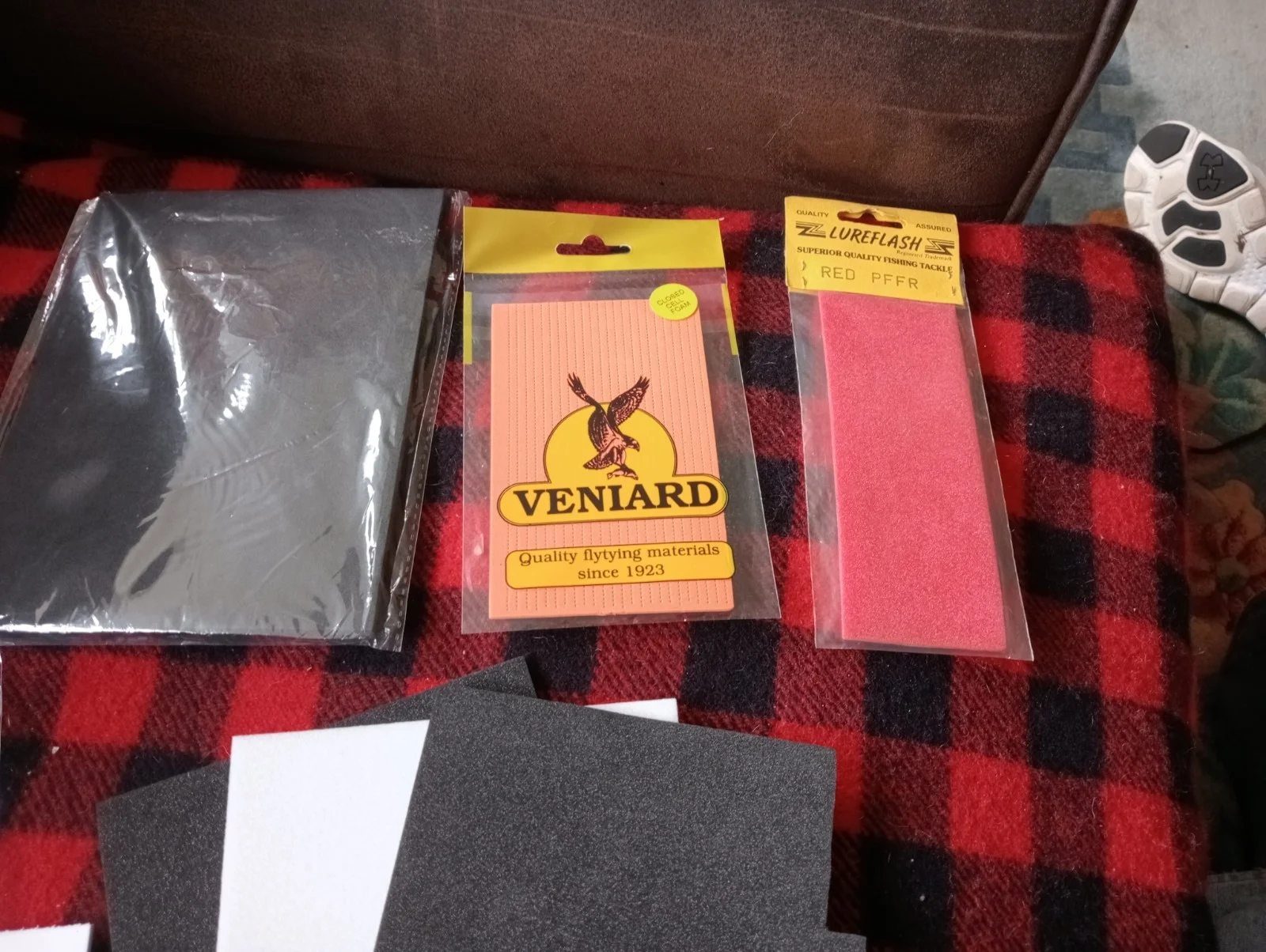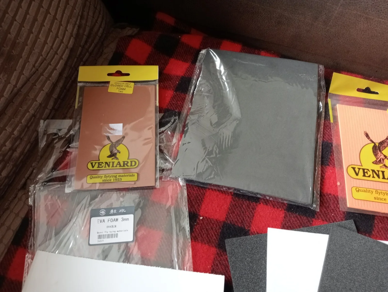 Job lot of fly tying flat foam. The unopened packet of black foam has two sheets in it as does the packet of white. The packet of assorted glittery / flashy foam is adhesive backed as is the lure flash packet. Please see all photos as they form part of the description.