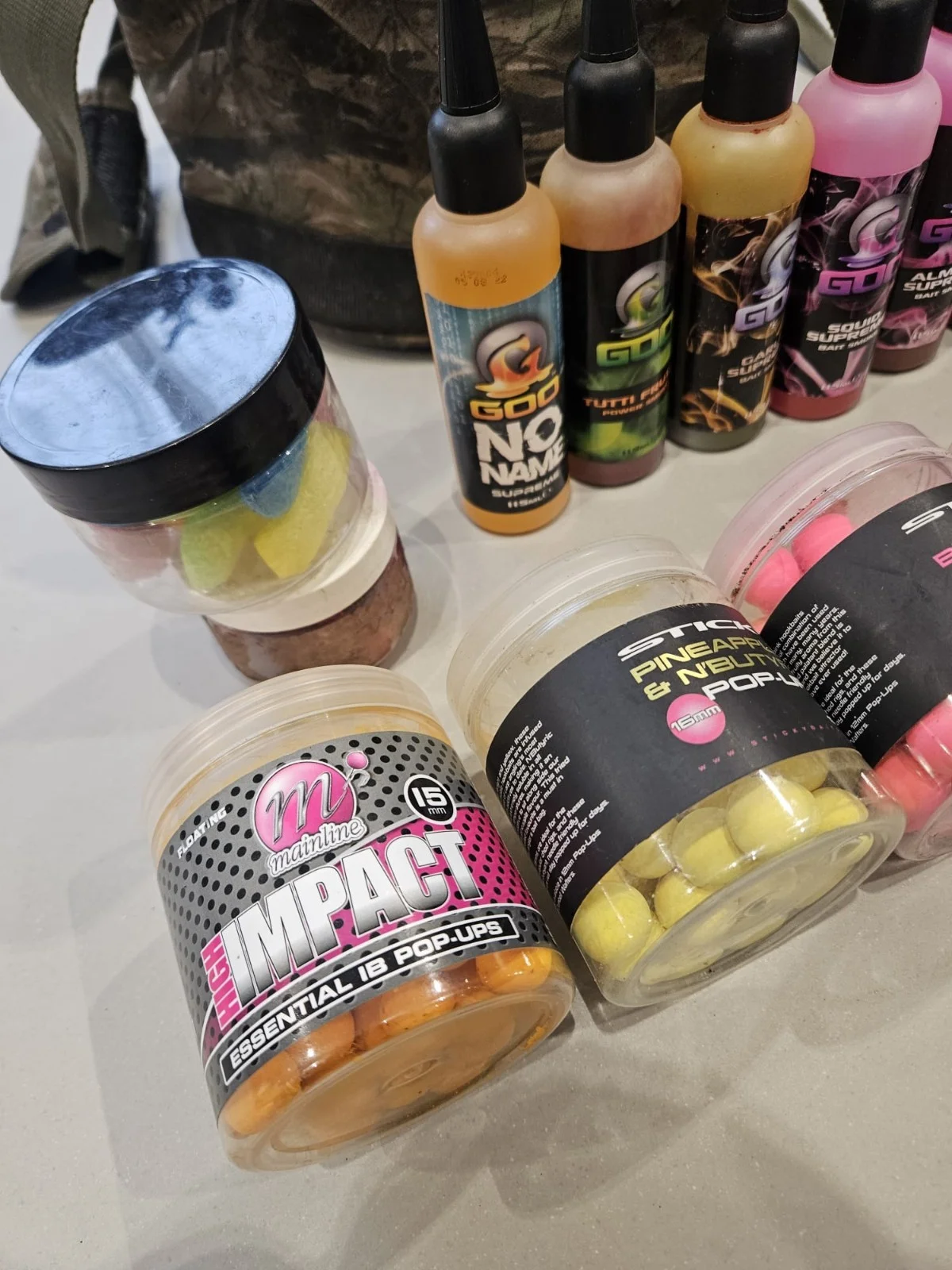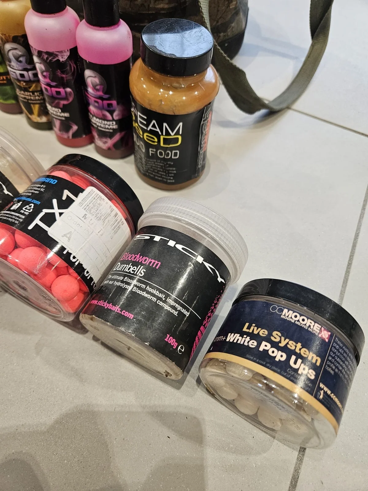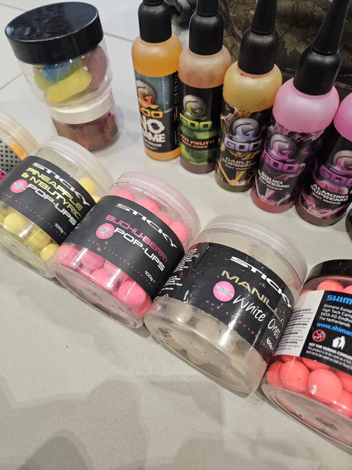 carp fishing hook bait bundle.×5 korda goo's plus tubs of hookbaits some used some full including mainline baits, sticky baits, shimano, cc moore. see pictures.*almond supreme* half full*squid supreme* 1/3 full*garlic supreme* 2/3 full*tutti fruity* 1/3 full*no name supreme* full.all comes in a camo bait bag as seen.
