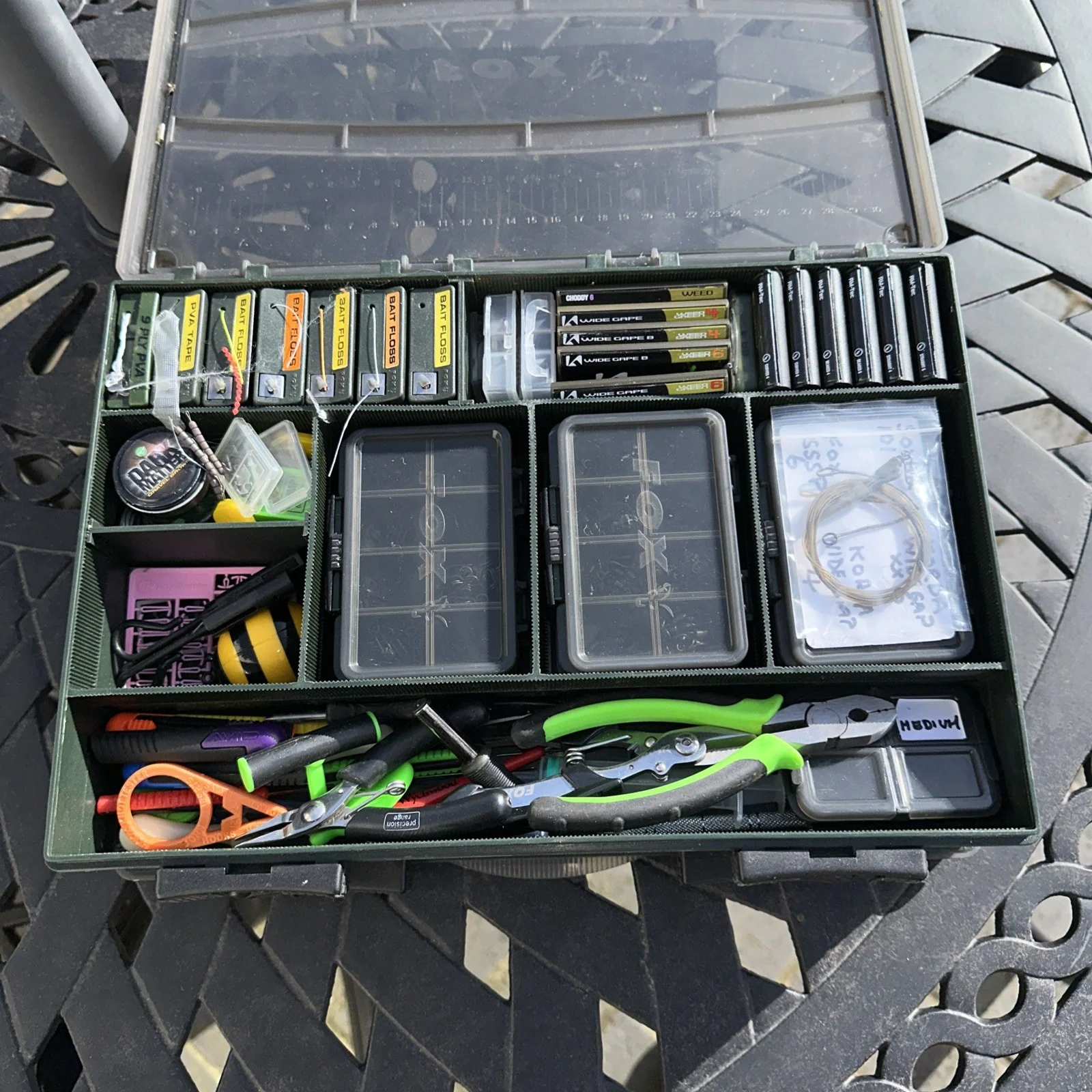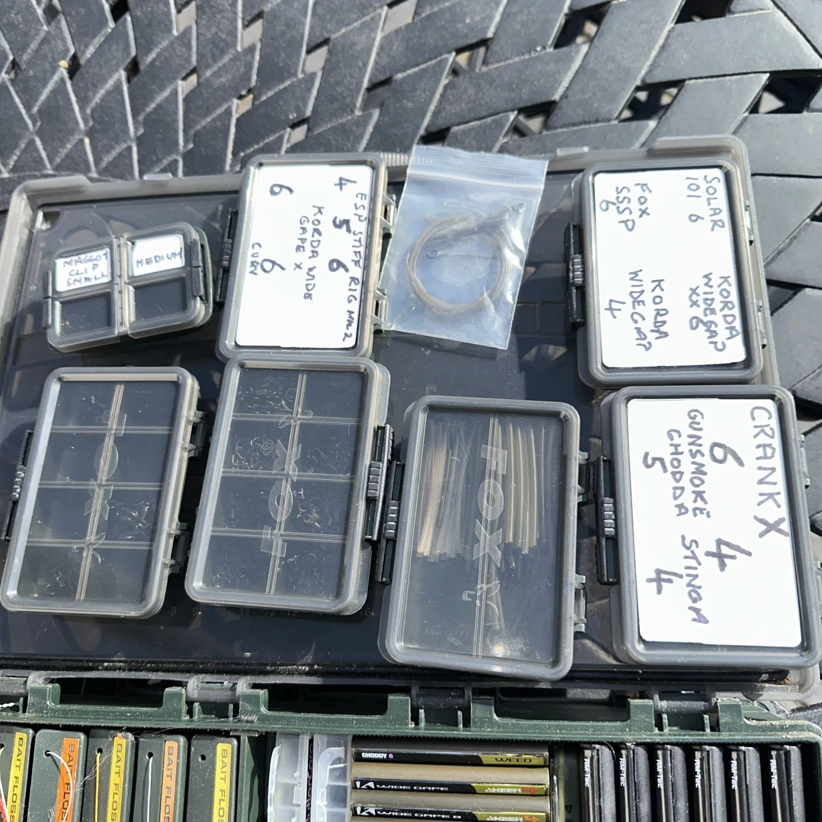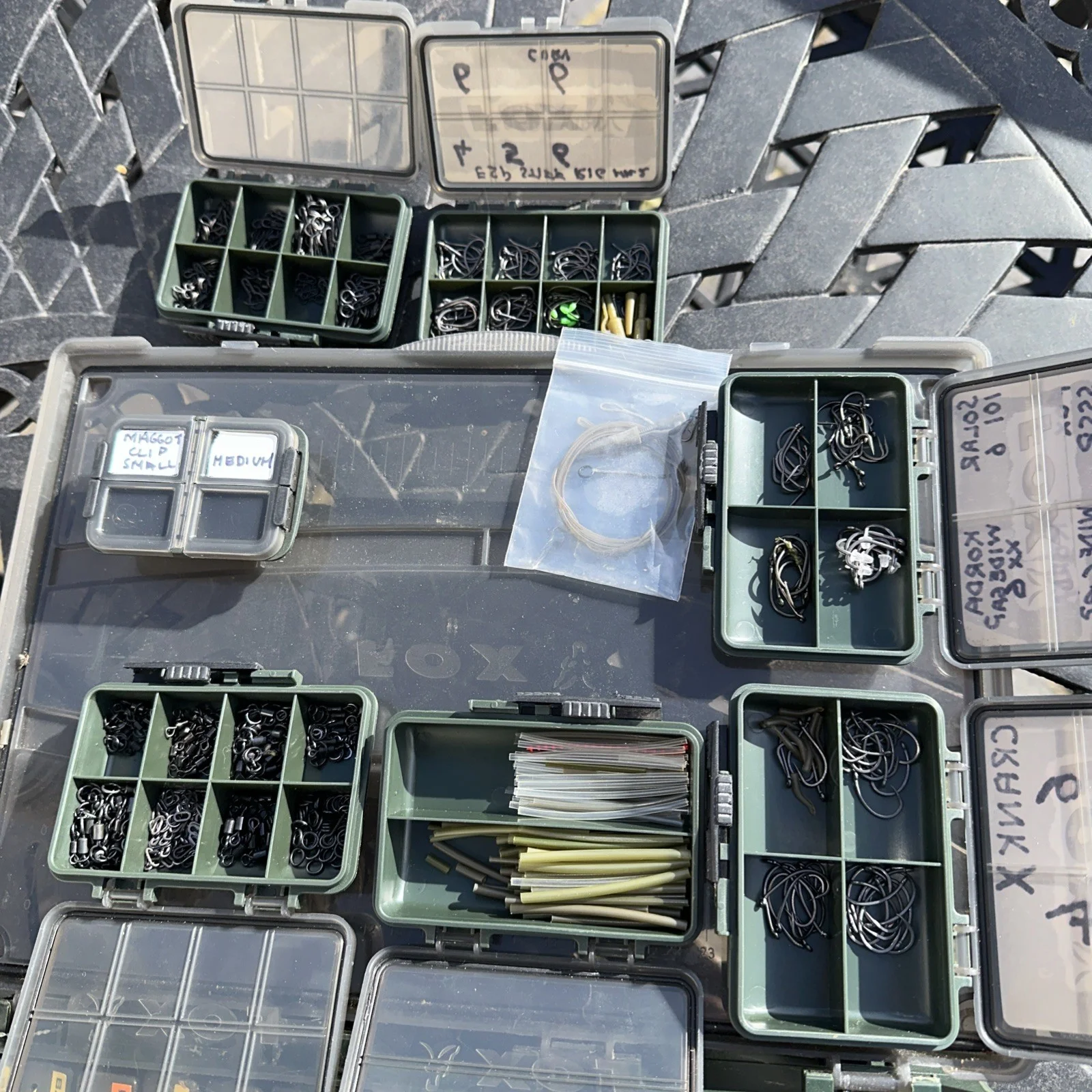 Large double fox tackle box absolutely stuffed full with carp terminal tackle, the accessories boxes are all loaded as well, hundreds of pounds worth of rig making bits and tools.