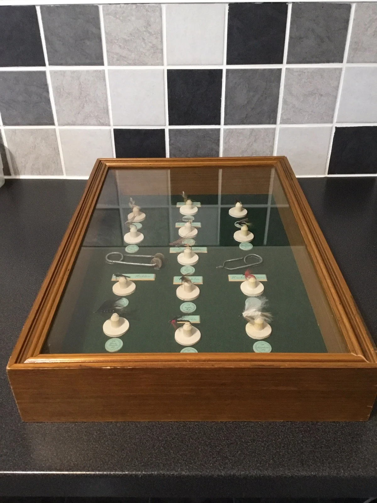 Vintage Collection Various Fishing Flies Display CaseVintage style wooden framed display case containing of fishing flies and accessories and others on small white stands with there names attached with a glass topPlease view photos for more details Thanks for looking Next day dispatched