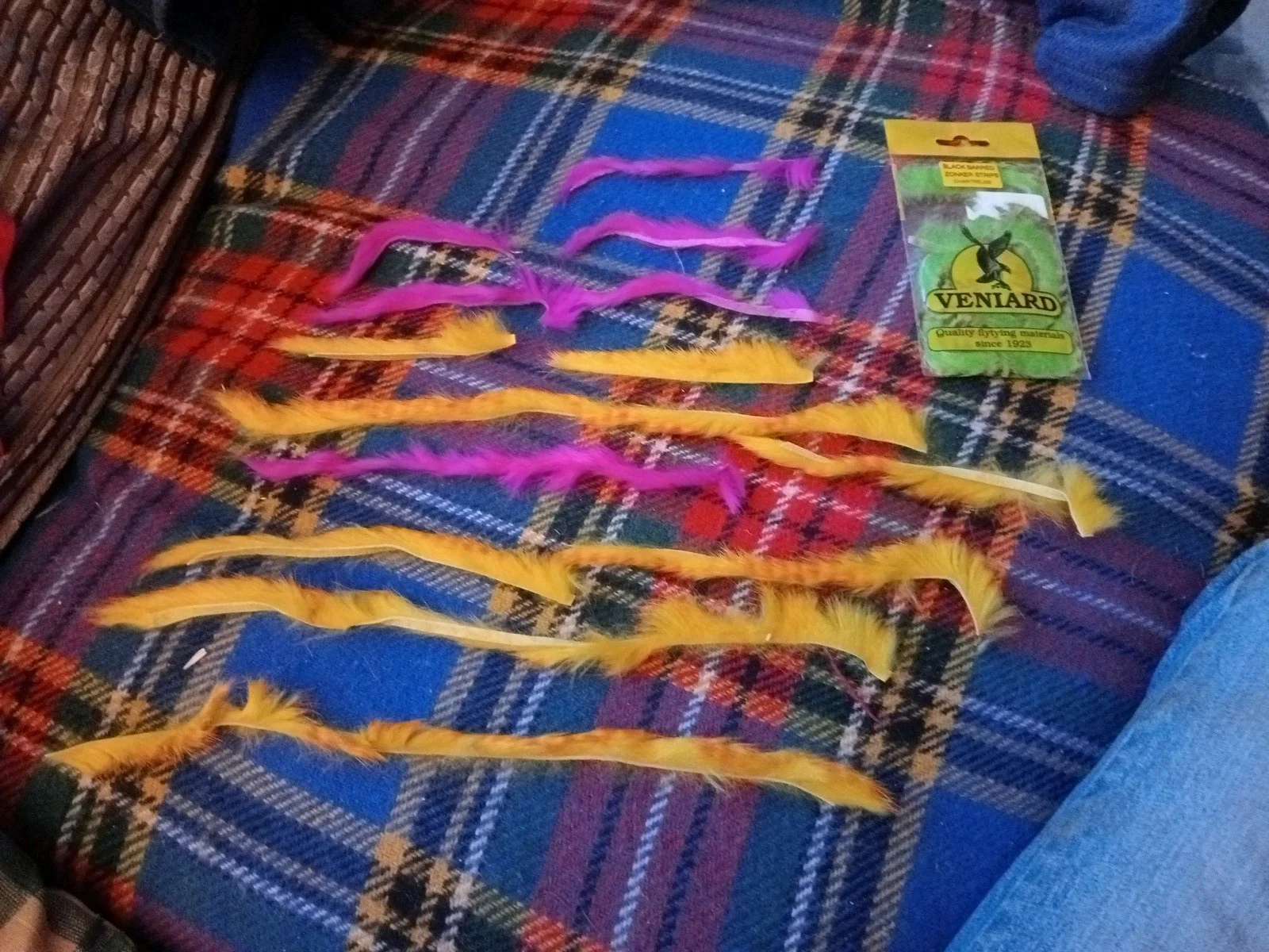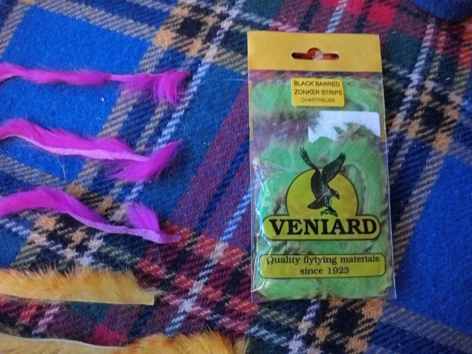 Pack of mixed rabbit zonker strips. Some are barred. Some are cross cut. The Veniard chartreuse packet may have been opened. At any rate it is almost a full packet.