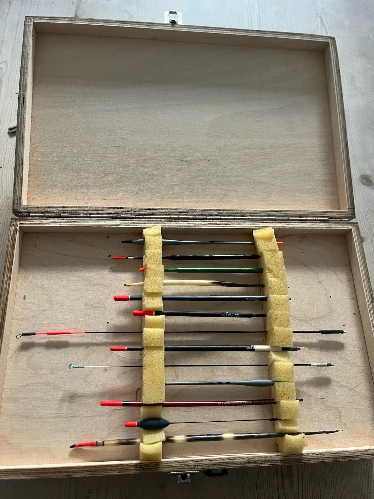 Wooden fishing tackle float boxComes with floats - mix of accessories Tracked pp 48