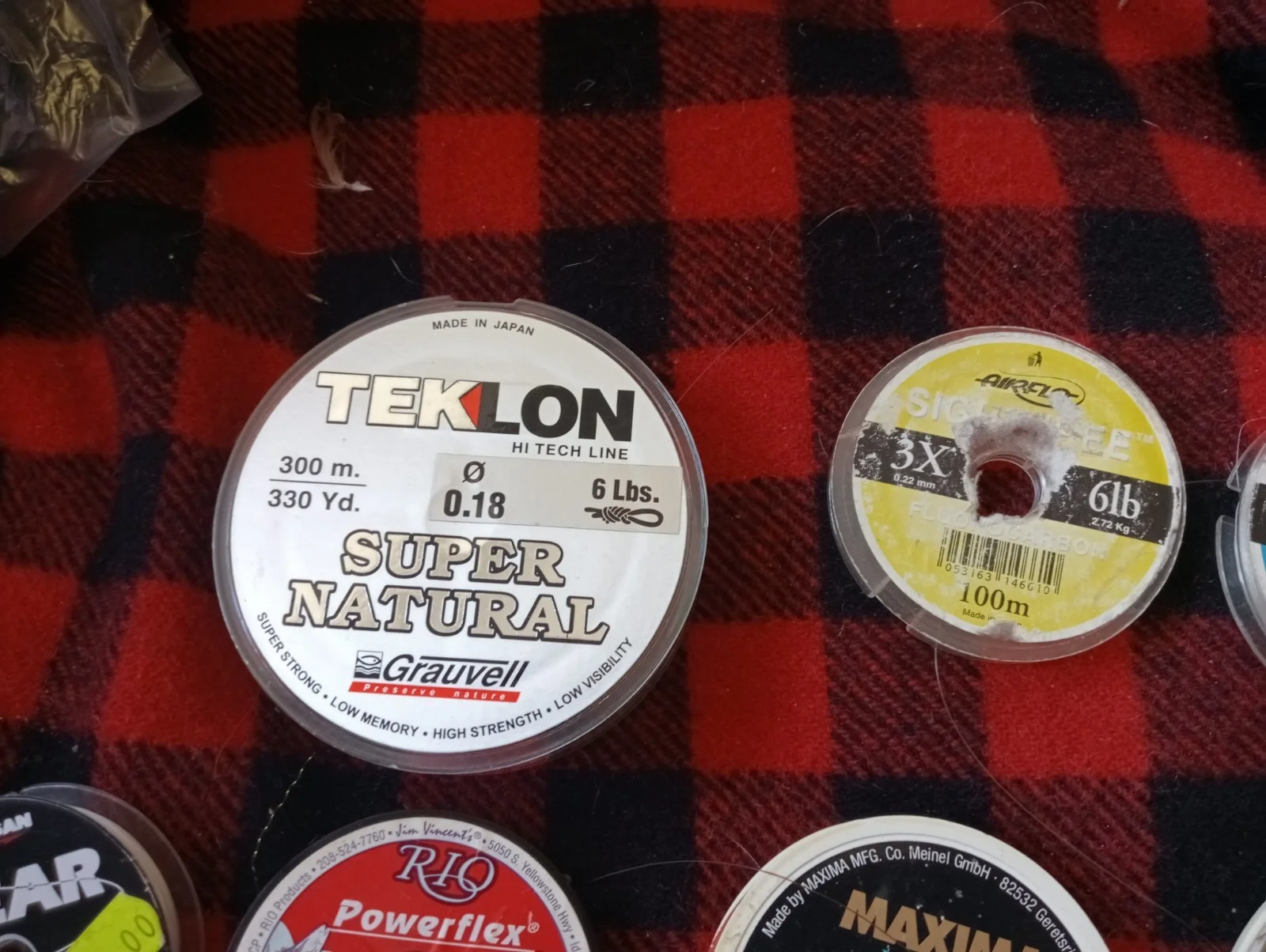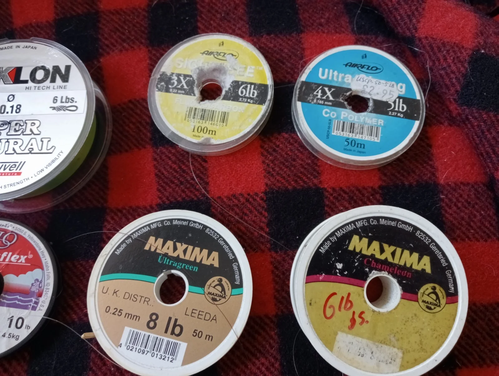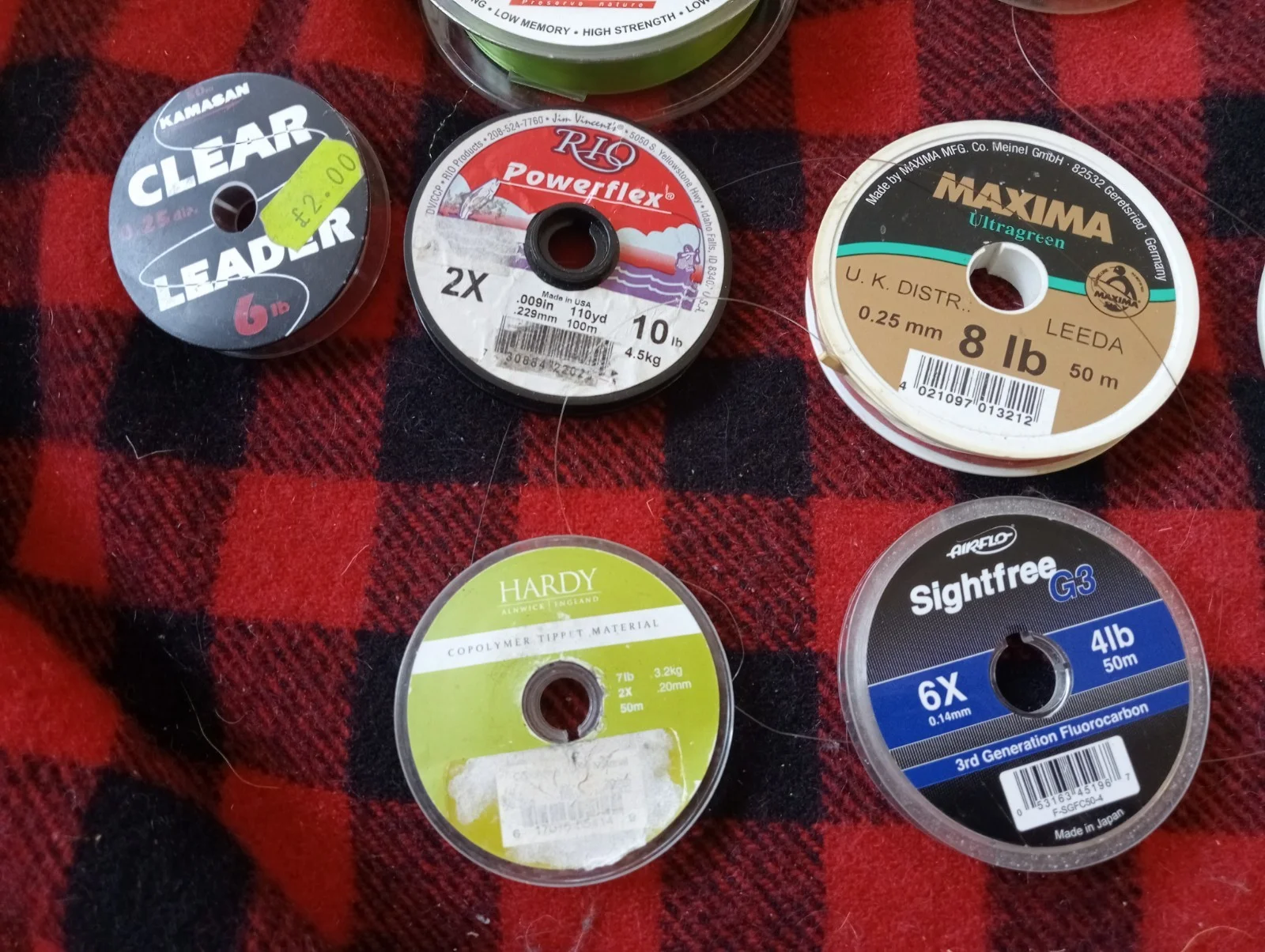 Job lot of fly fishing leader material as per photos. All started spools but lots of line remaining on spools. Please see photos for a good idea of how much line each spool has left.