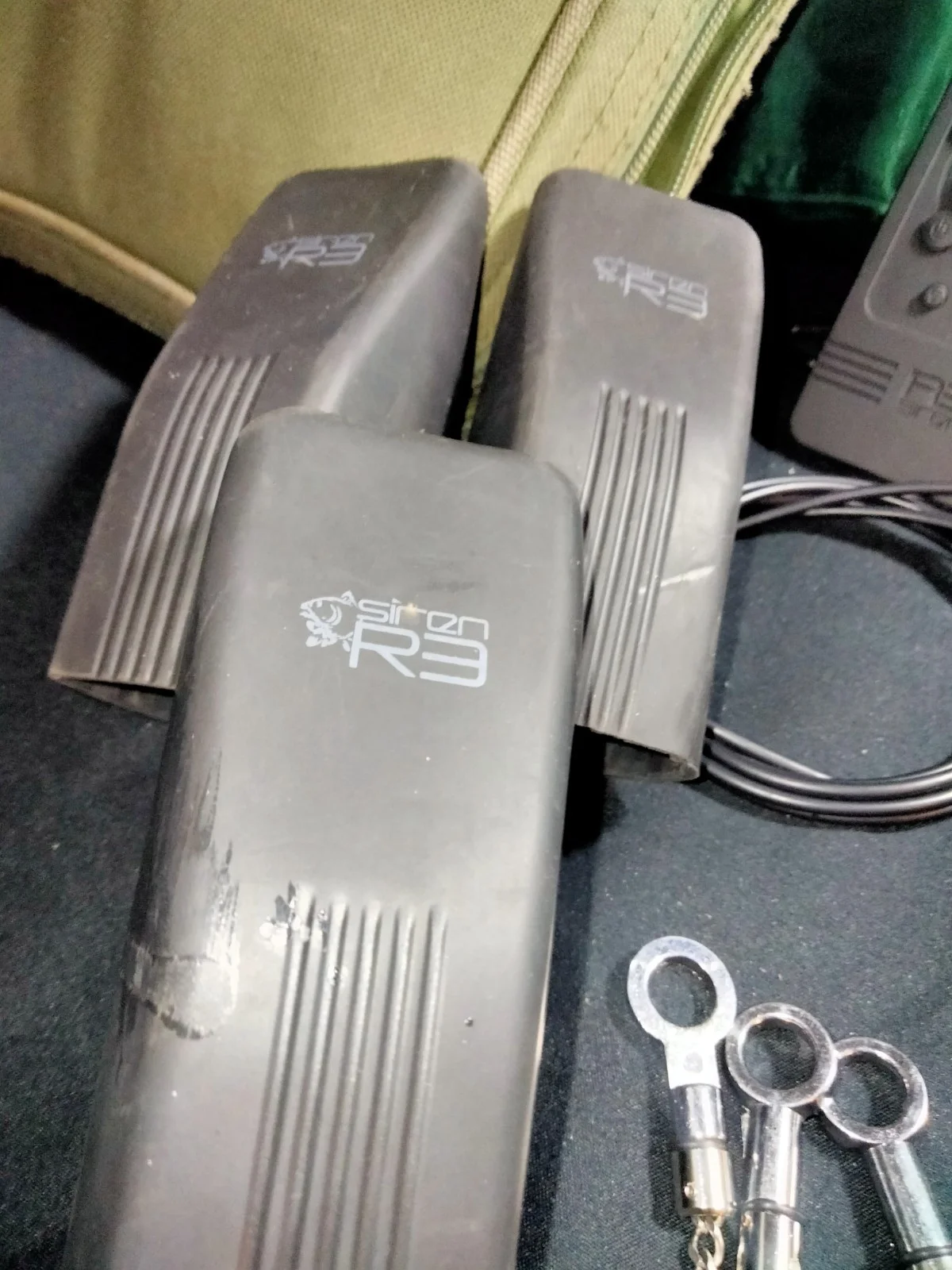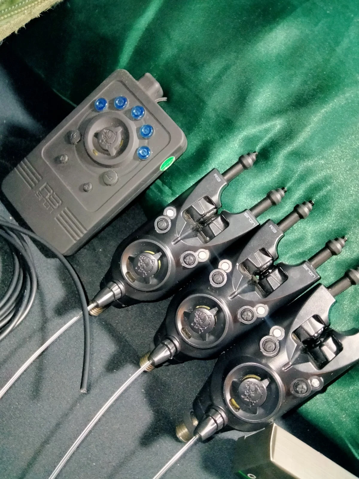 Excellent condition alarms, generic chains, spare batterys, hockey sticks, weights, including X2 other branded buzz bar carry pouchs to store the alarms in. Thicker upgraded optic cable for a stronger glow with a spare roll included.Never used bobbins, bomb proof alarms. Everything in pic is included. Including optic fibre pipes. Includes buzz bar pouch X2 to store them.No out of auction offers, everyone gets a go.
