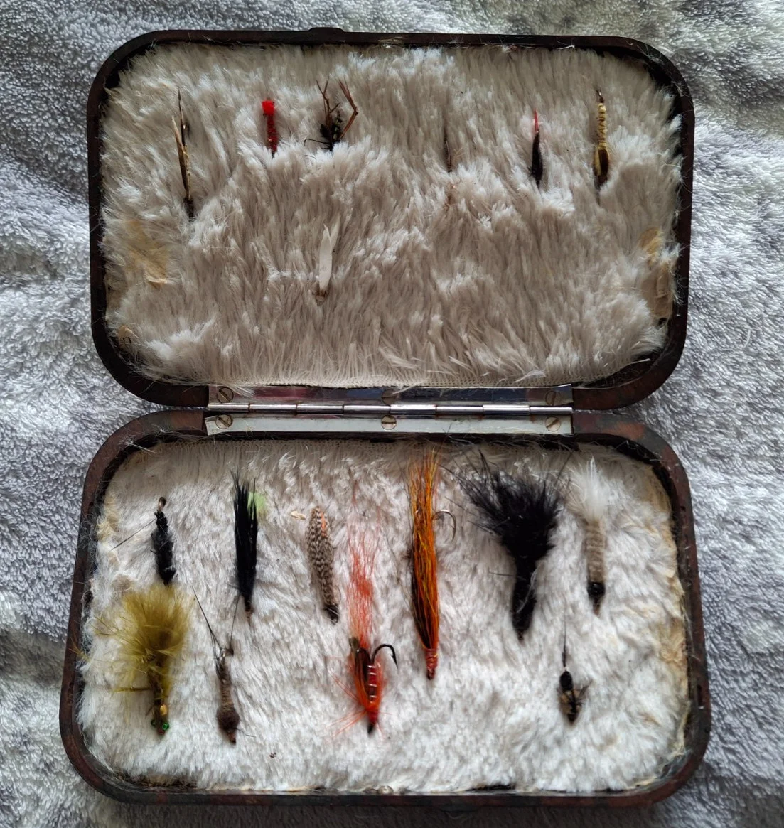 Hardy Neroda Fly Box, wool lined. Approx. 6 1/4 x 3 3/4 x1" it's a lovely fly box, perfect for Salmon size and wet flies.I have included a couple of Alex Martin marked Fly Tins in this auction. These have been used and are in differing conditions. (Just an extra as not for me)Thanks