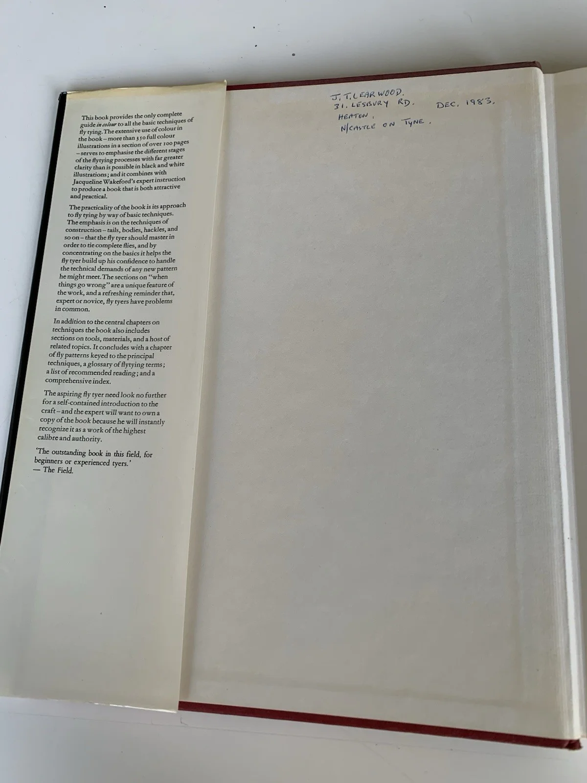 "Fly-Tying Techniques: A Full Colour Guide by Jacqueline Wakeford is a vintage 1982 2nd edition book that is a must-have for fishing enthusiasts. This comprehensive guide provides detailed instructions and illustrations on how to tie flies for fishing, making it a valuable resource for anglers looking to improve their craftsmanship and techniques. With a focus on the art of fly tying, this book is a timeless piece that captures the essence of this classic sport."Inscribed