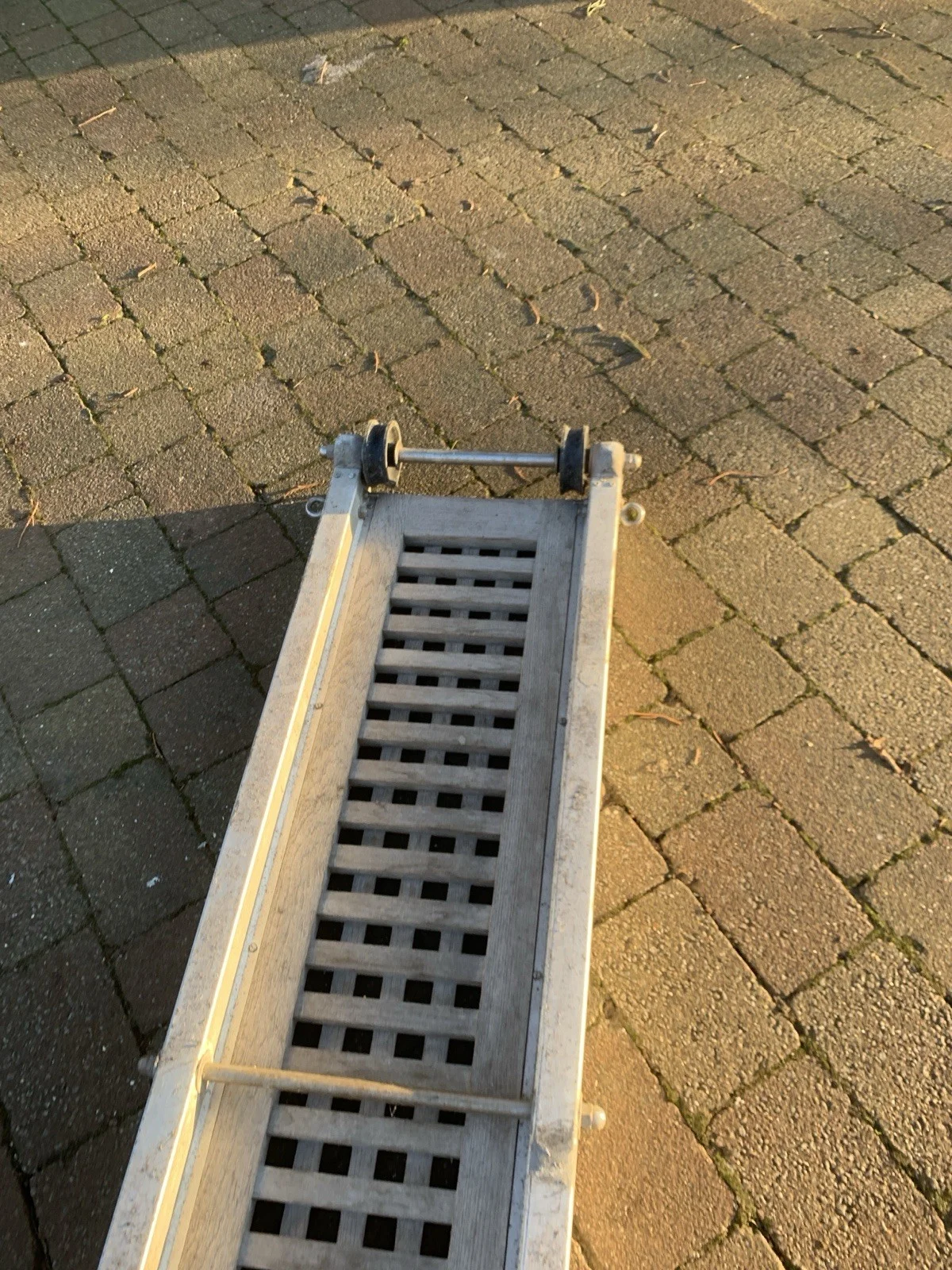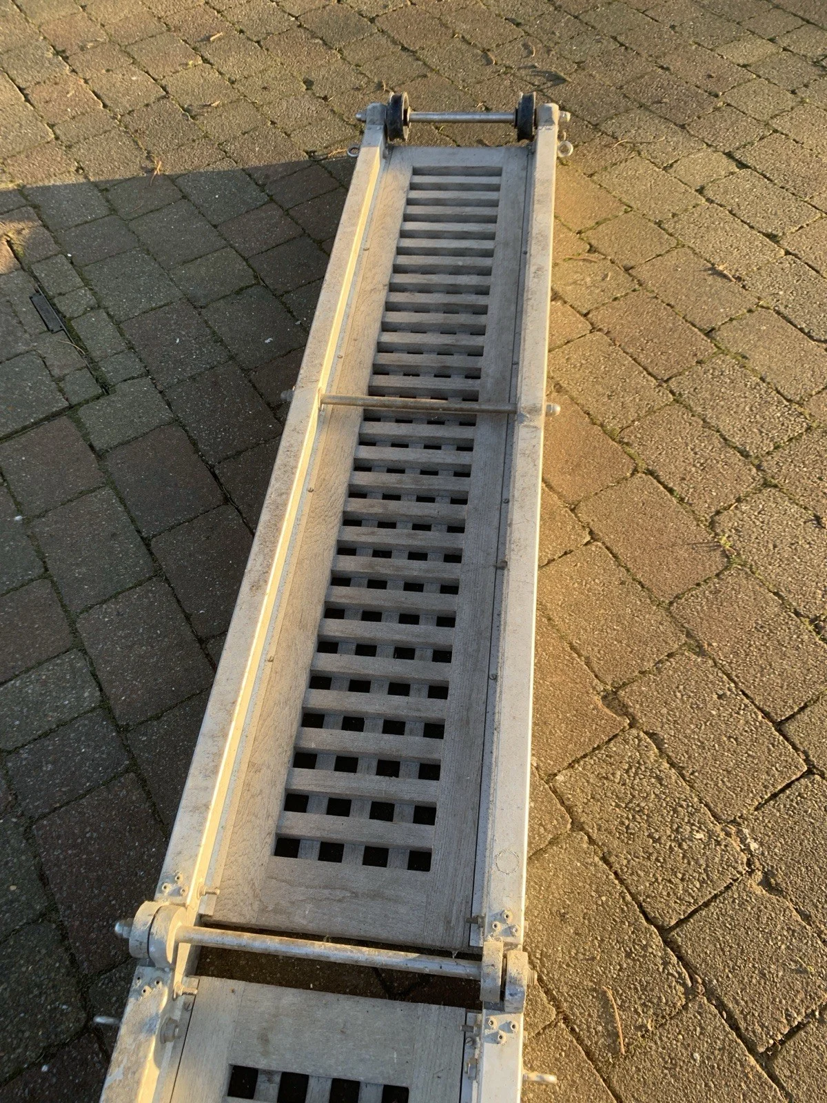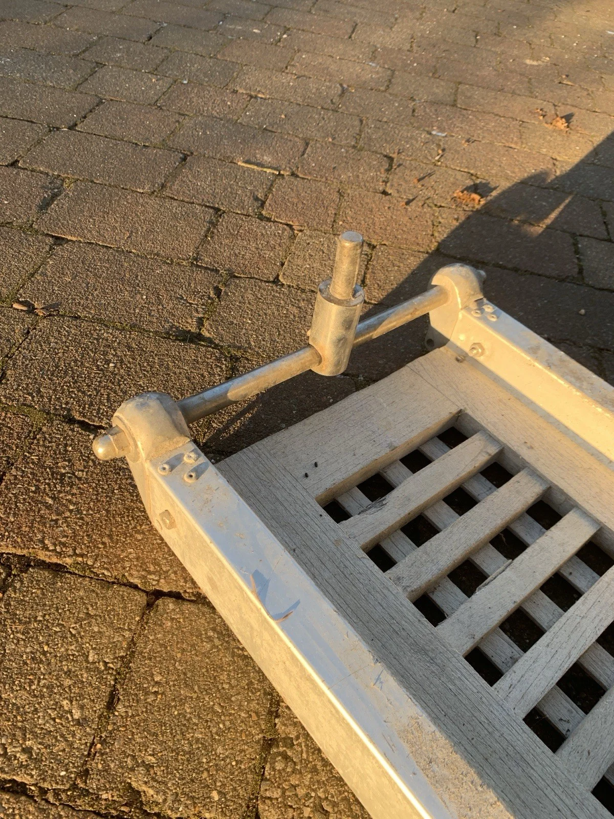 Gang Plank That Folds In half, and 1.5 metres. Extended it is 3 metres. Has a nice teak platform to walk on and also some holes in the metal sides into which you could put a handrail. On the boat end is a stainless steel pin that would go into a fitting on your deck and on the pontoon end there are wheels allowing to move on the pontoonCollection only on account of its size and weight