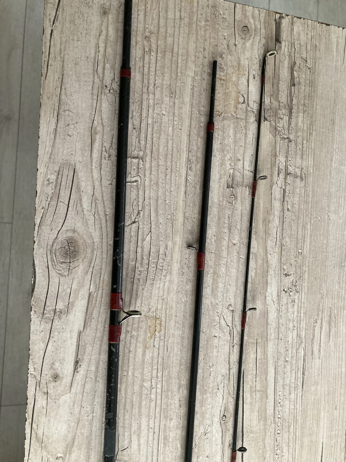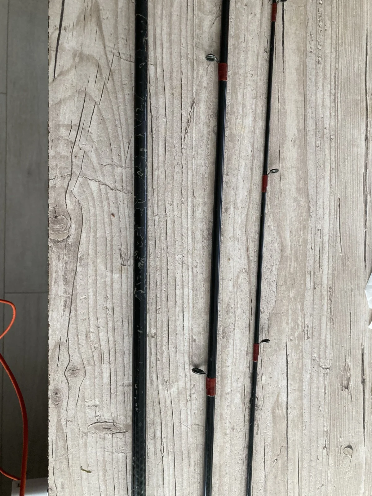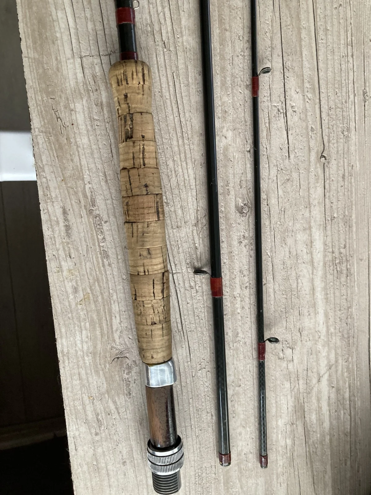 fly rod,no makers name on the rod but probably made by Sue Burgess only because thats the rod bag it came to me in . it wieghs 106 gm and has 3 sections . It comes in an aluminium tube with a screw top , Ive never seen one before . All rings good as you can see on the photos .