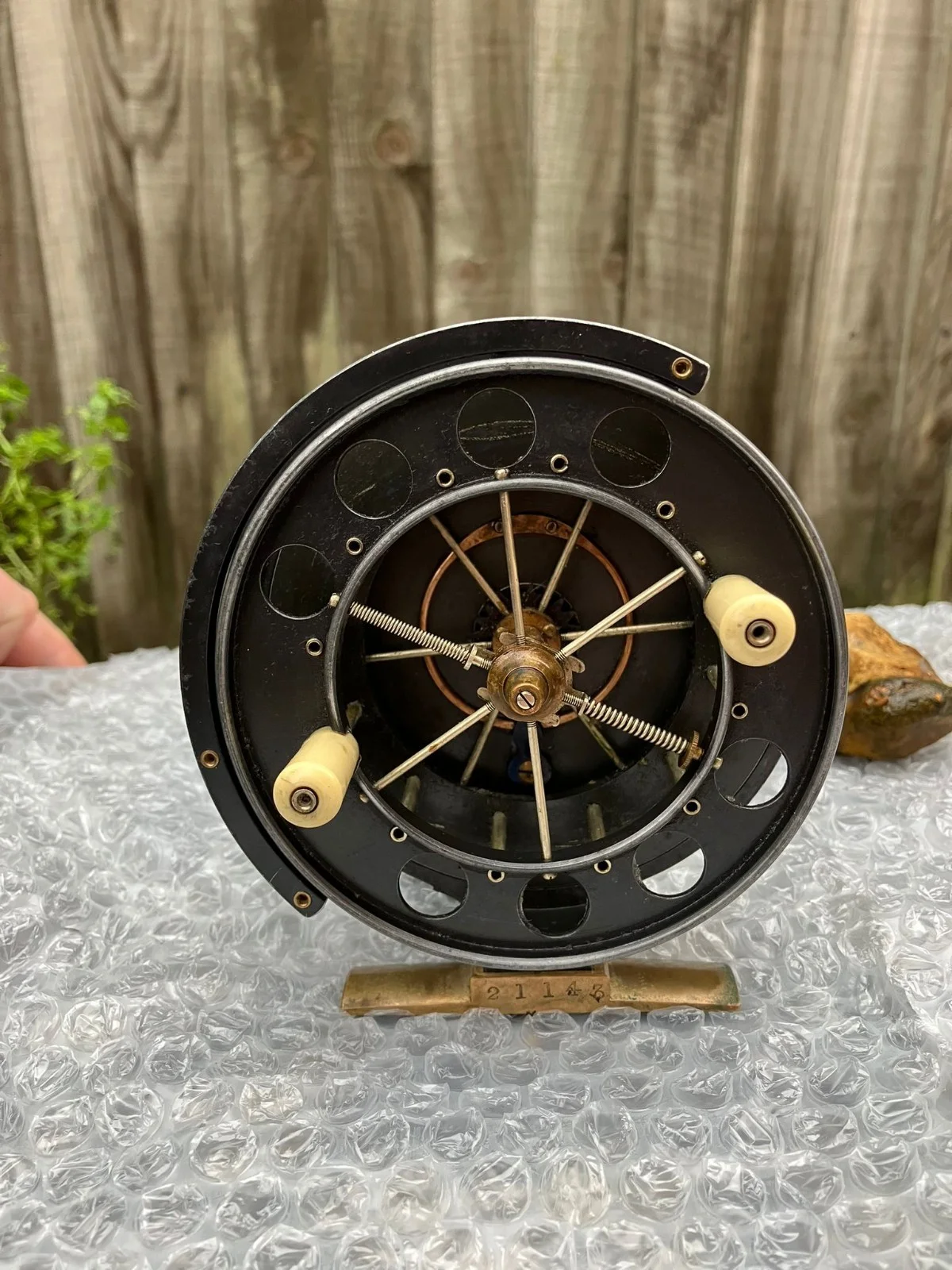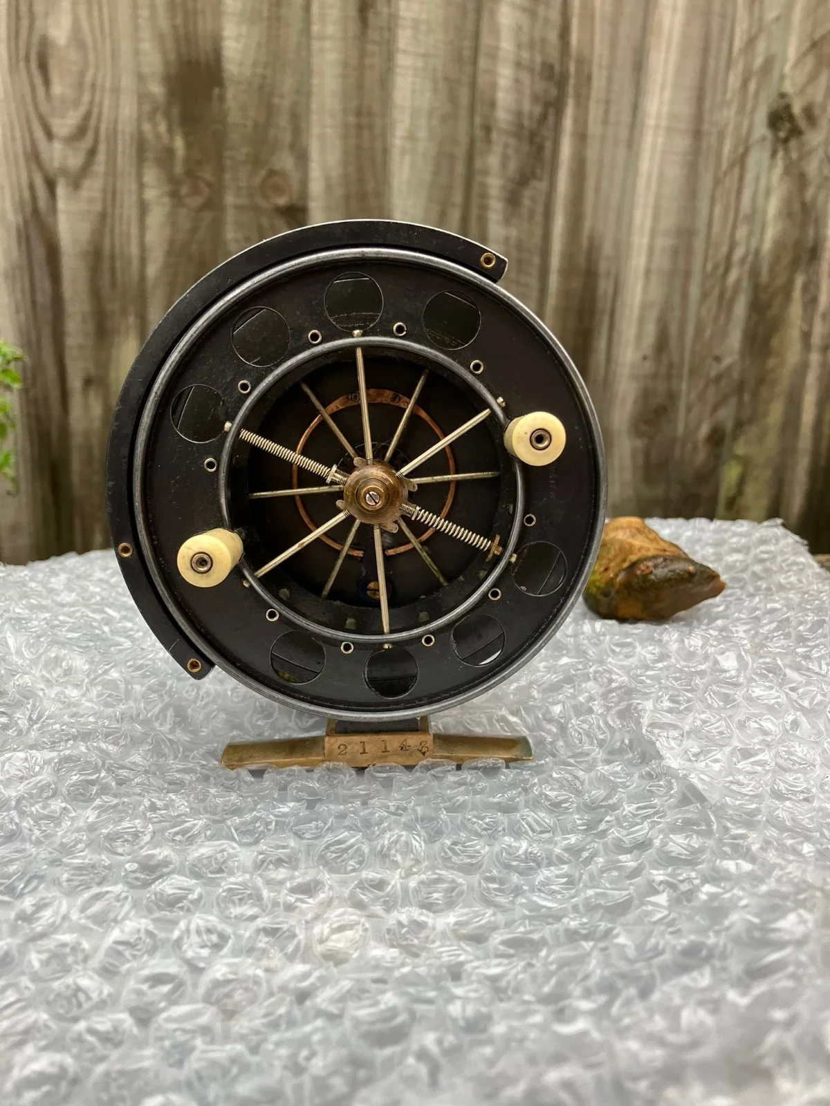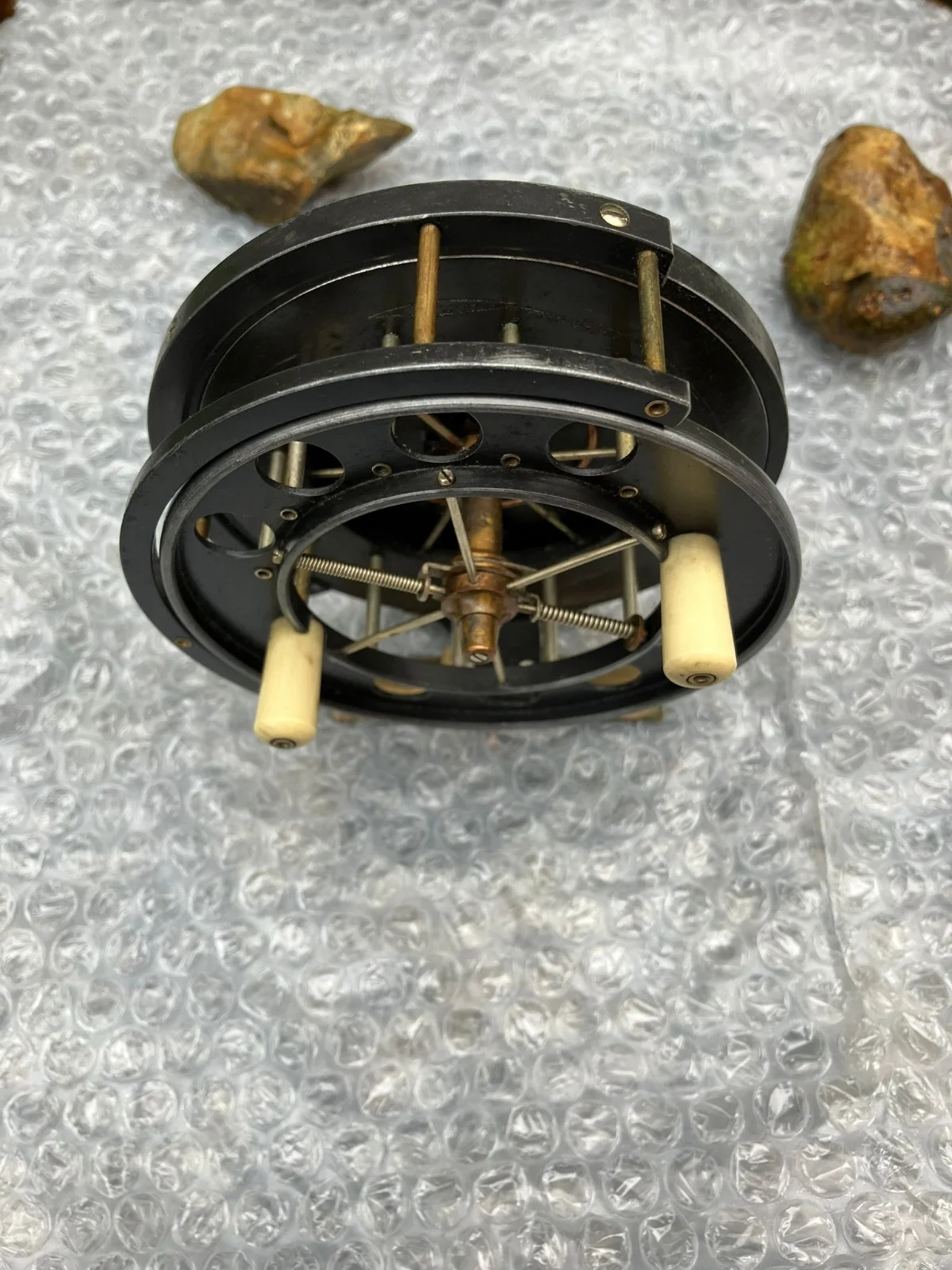 A recent purchase from a auction house, it needed a mild clean up with a bit of oil. Over a hundred years old and bearly been used, lovely reel to use as like new. Spins beautifully, handles have no crazing, hollow line lays which make it pre1921/22. BP line guard is mark free, rollerbar rotates fine, strong caliper check, & unmolested foot.Lovely example, personally narrow drum models are nicer than the common wide drum models. Any questions please, will take a day or so to reply as fairly busy.