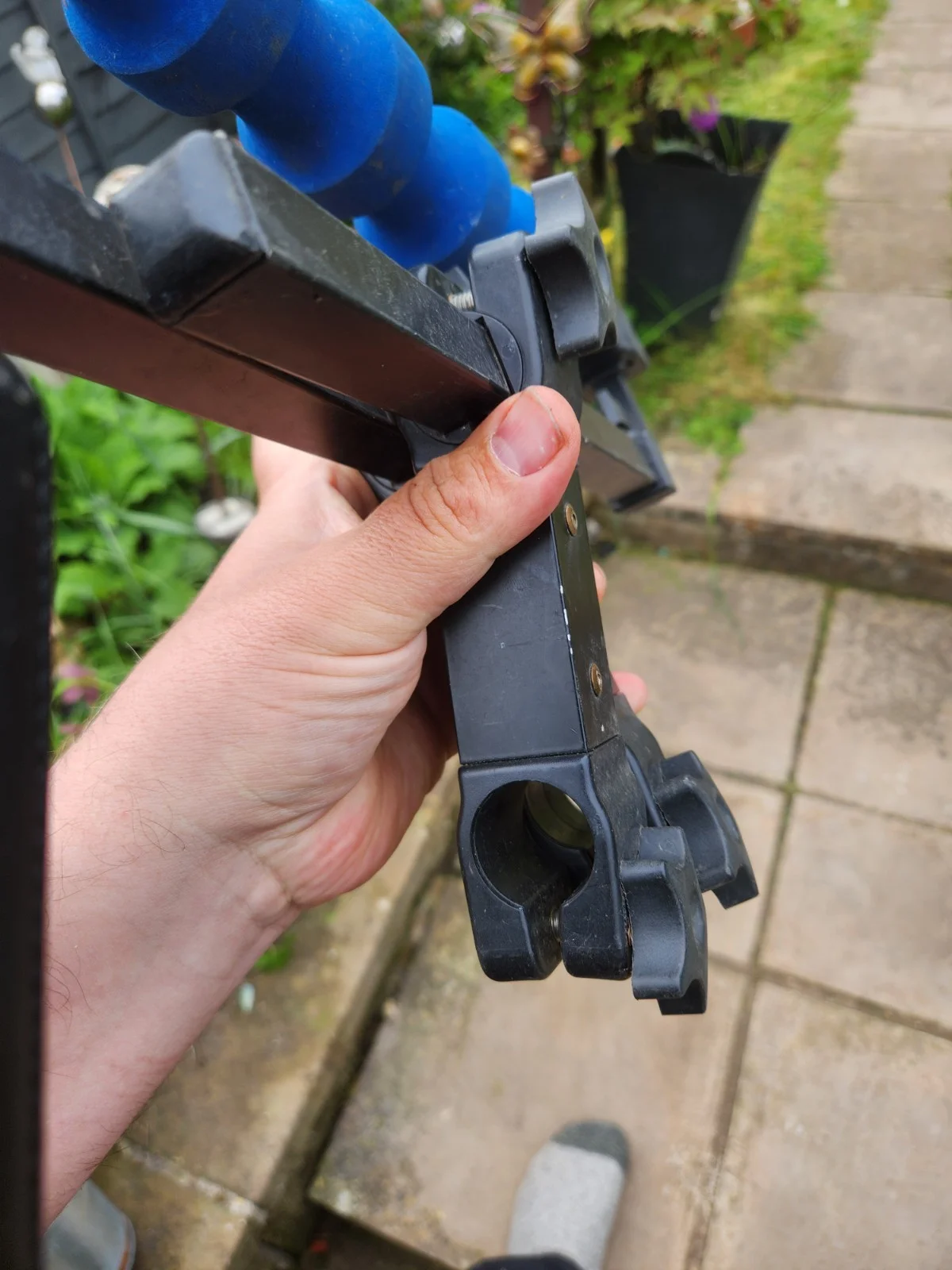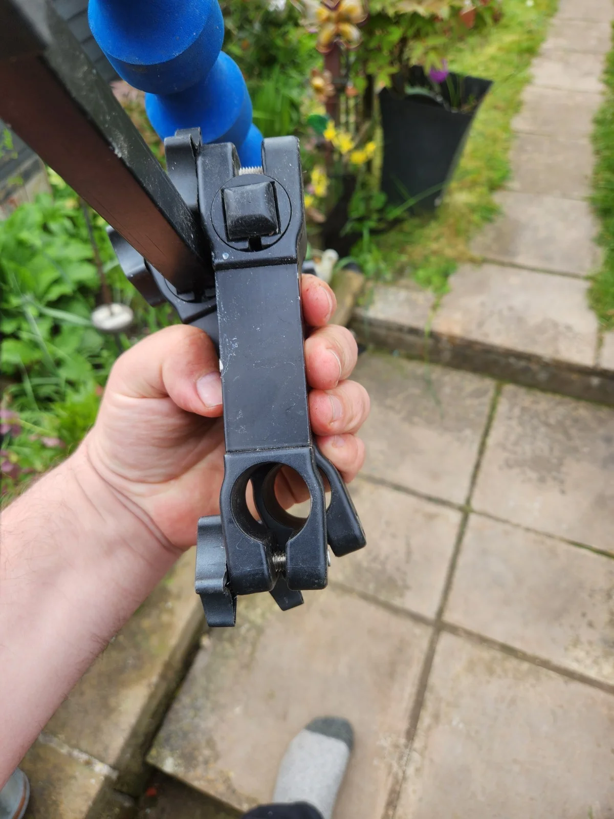 prestonpole supportoverall 60cm wideovrall 37 - 64 x 14cm extending bracketoverall 17cm bracket - box leg to supportbrackts can be angled to reduce or widenmax fitment 30mm dia leg can add inserts if you let m know what size you wantused surface marks from use / age some metal exposed oxidisation / minor rust to knob threads by work fine