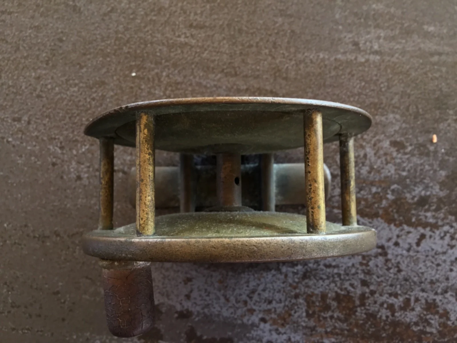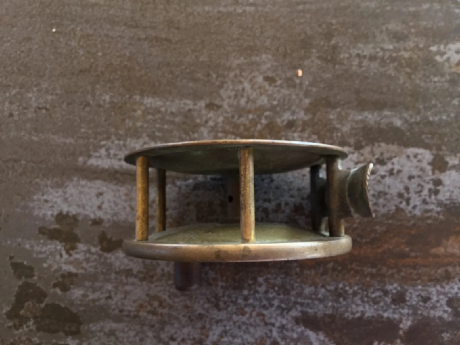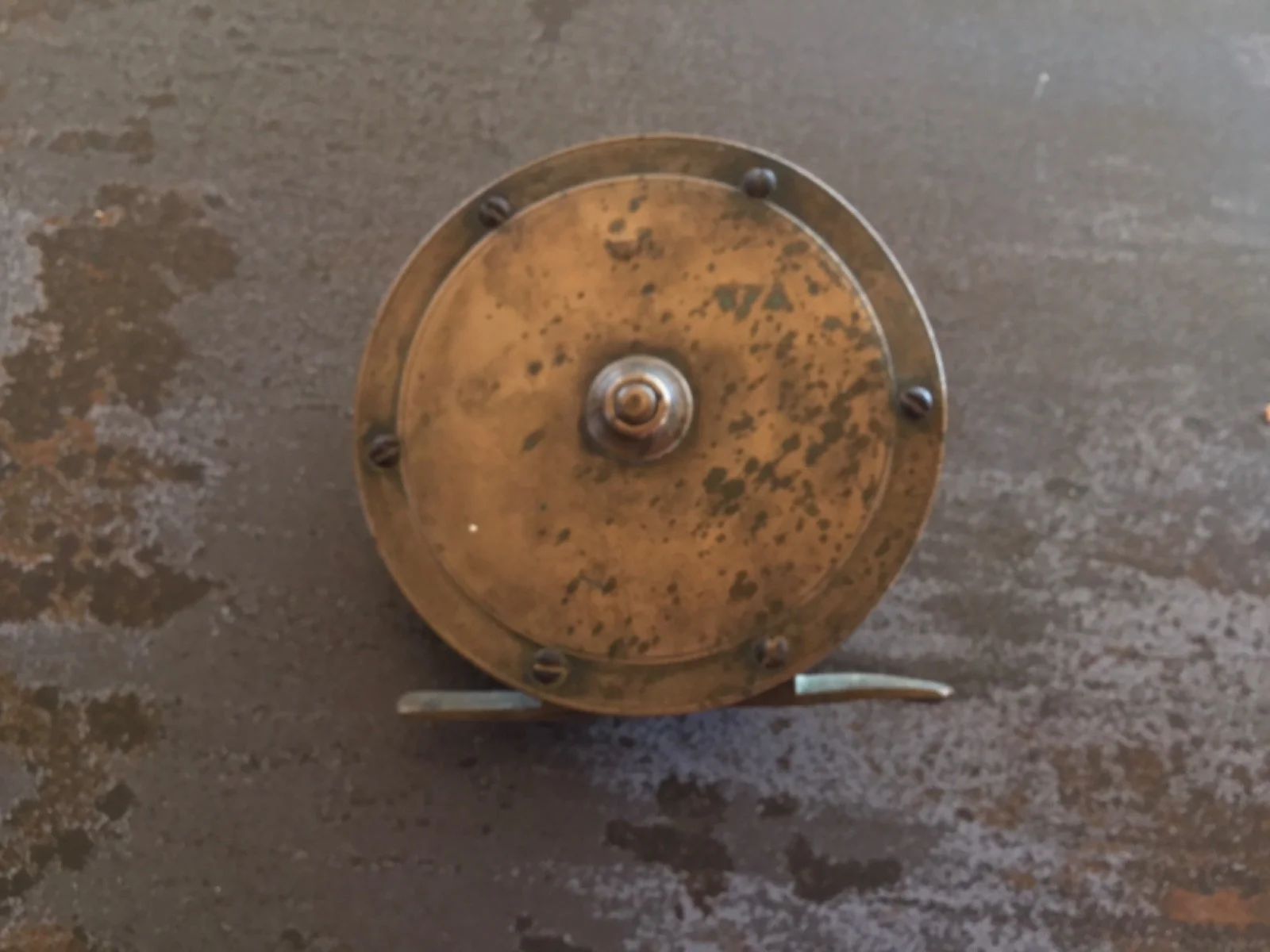 ANTIQUE CIRCA 1890,S HARDY BROS OF ALNWICK BRASS REEL.3.5 INCH.EBONY WINDER.MEASURES 1.5 INCH ACROSS.HAS THE "ROD IN HAND" MARK.NO OTHER MODEL MARKS.IN "AS FOUND" CONDITION[HAVE NOT CLEANED].GOOD RATCHET MECHANISM ALTHOUGH A LITTLE STIFF.MAYBE A SLIGHT DENT IN ONE AREA THAT NEEDS TO BE STRAIGHTENED.A COLLECTORS REEL.