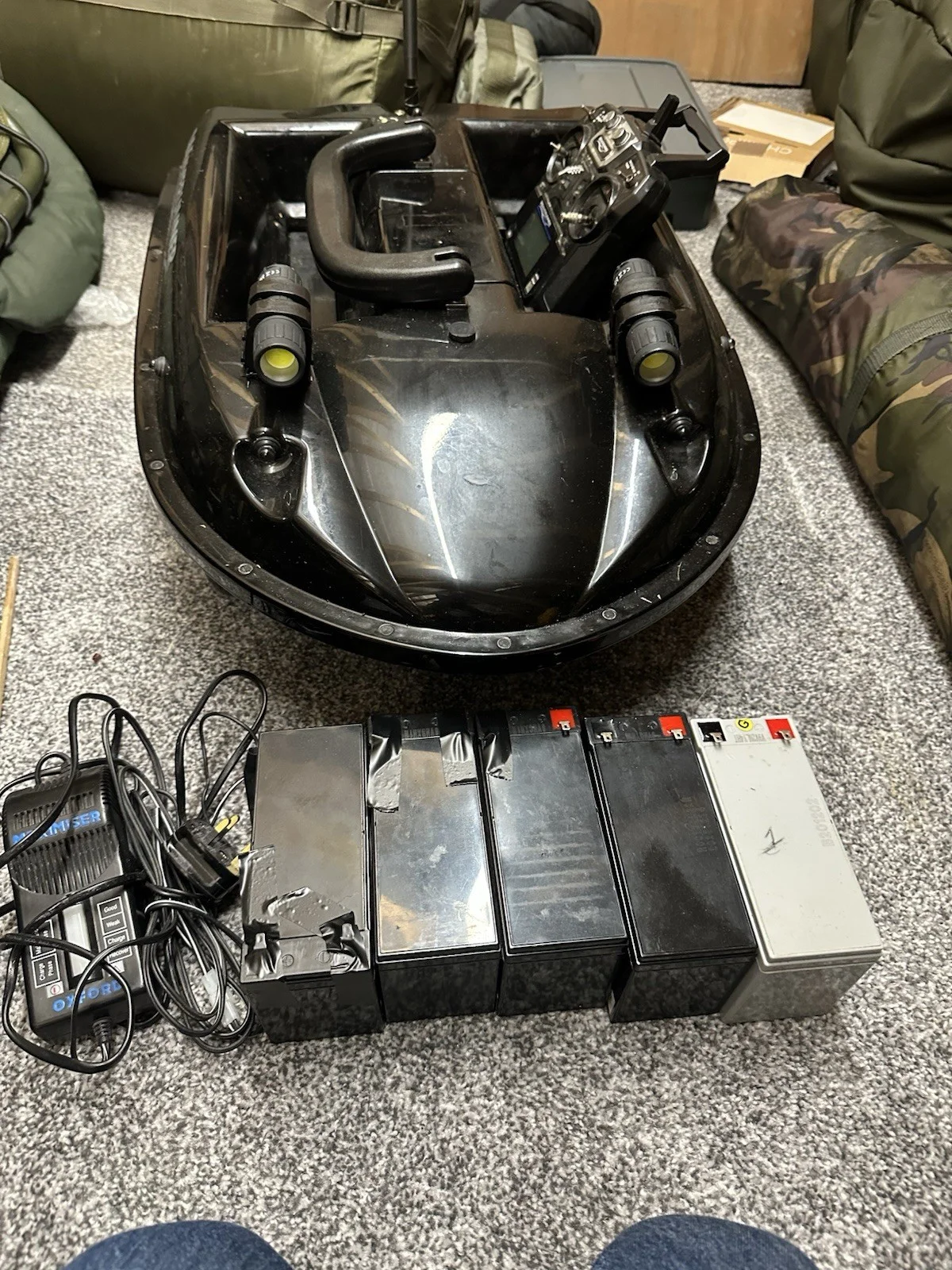 Bait boat in good condition comes with 5 batteries all motors are good also has some sort of fish finder on it dont no anything about them or if it works bit of a dinosaur that way lol it does have 2 aerials but i cracked one under some trees and i cant find the other i have used this in france 3times and never had any problems just the cracked aerial could do with a replacement easly sourced on ebay happy bidding