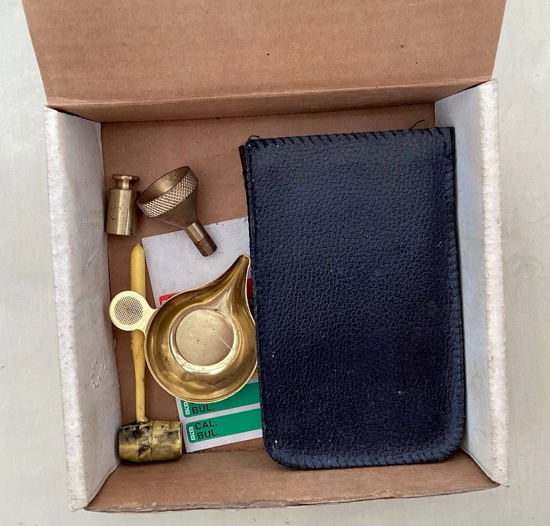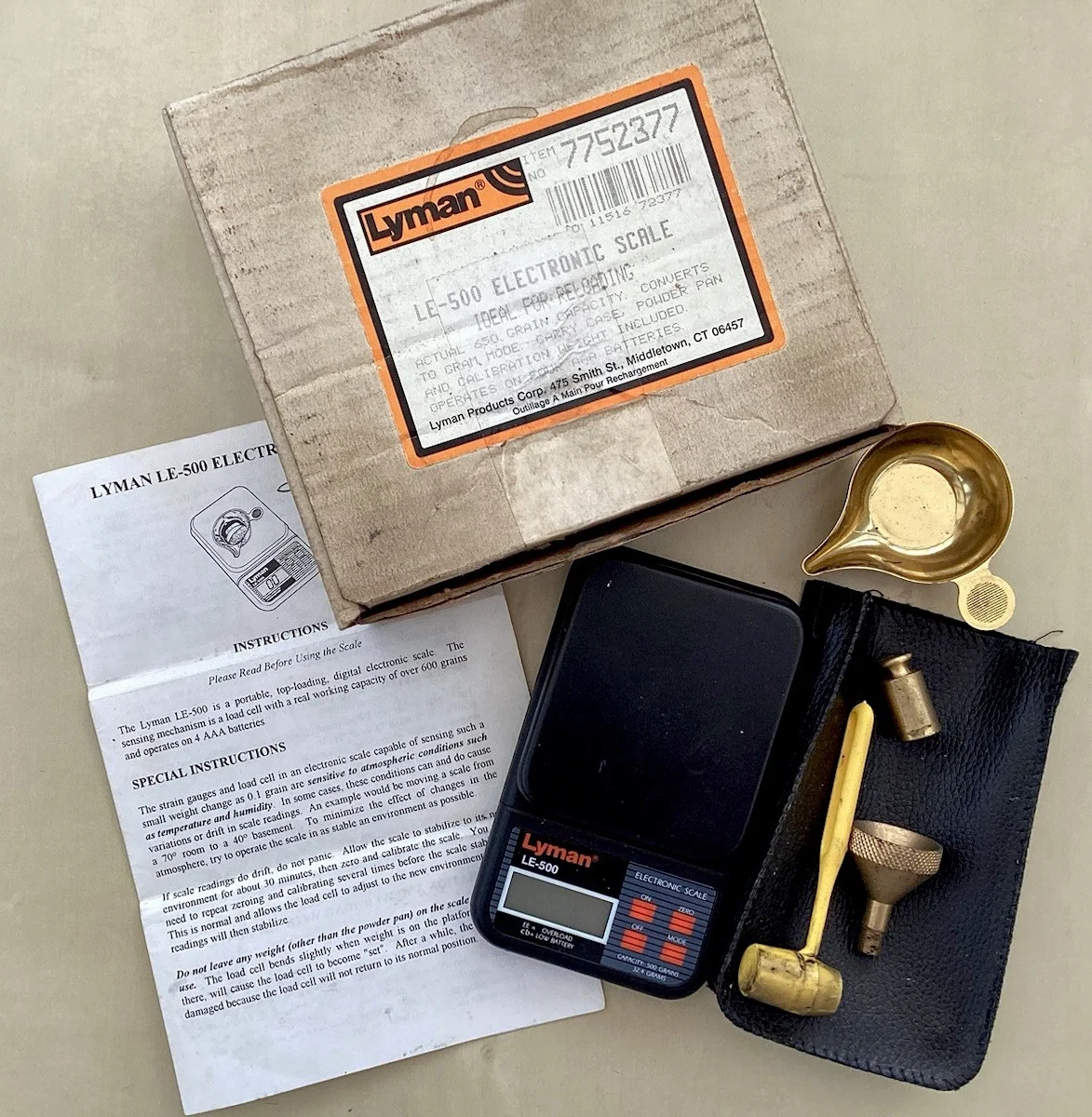The Lyman LE-500 is a portable top-loading, digital electronic scale. The sensing mechanism is a load cell with a real working capacity of over 600 grains and operates on 4 AA batteries. Needs replacement batteries. In original box. Manufactured by Lyman Products Corp. Connecticut. Powder pan and apparatus intact. Complete with instructions.