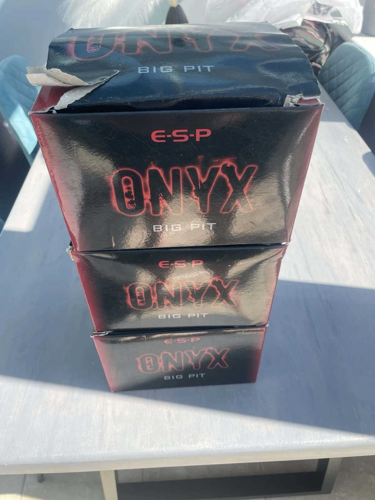 For sale three esp onyx big pit reels, complete with spare spools and matching boxes. Main spools are loaded with Korda 15 subline only put on last September, so loads of use left in it. The reels are well used with some minor cosmetic damage ( paint chips on handle) but still brilliant smooth reels, boxes are worn but ok for storage.