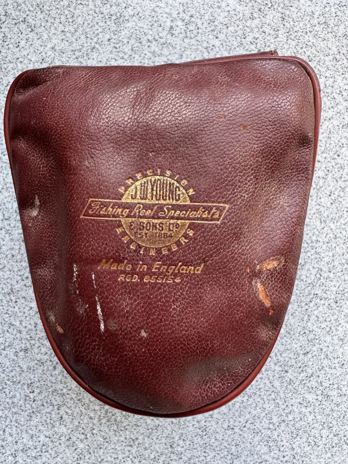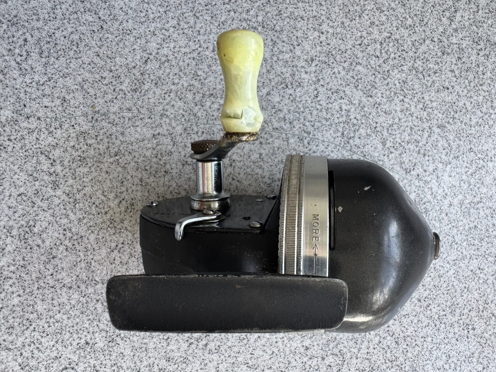 Closed face fishing reel. Good working used condition with adjustable line drag and removable handle (for case storage). Included zip up case. Chrome cone in decent condition for year. Small amount of damage on reel handle see photo. Nice functional collectors piece.
