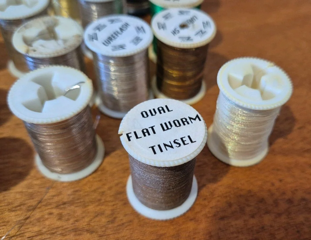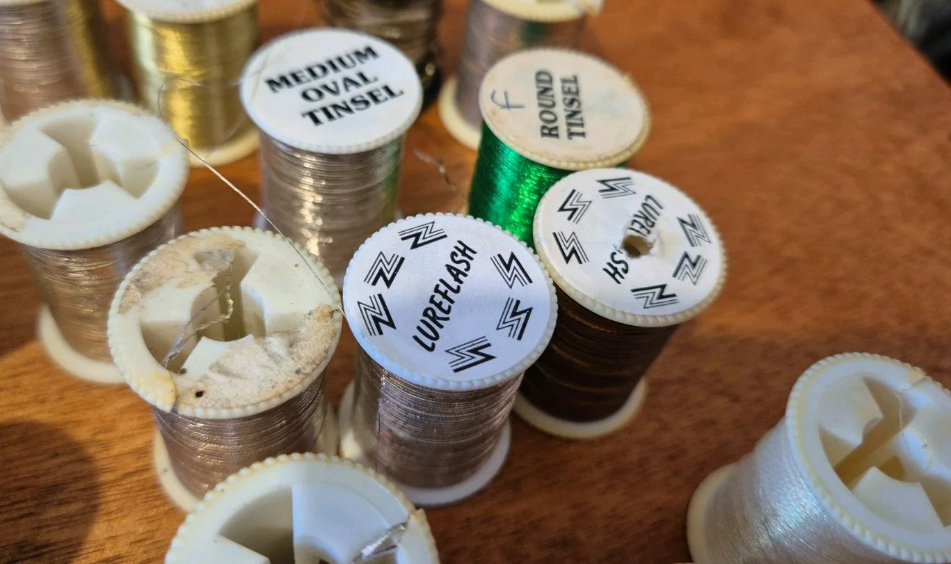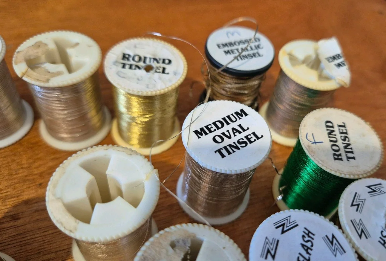 FLY TYING 32 SPOOLS OF TINSEL THREAD AS PICTURED SOME UNUSED GOOD LOT