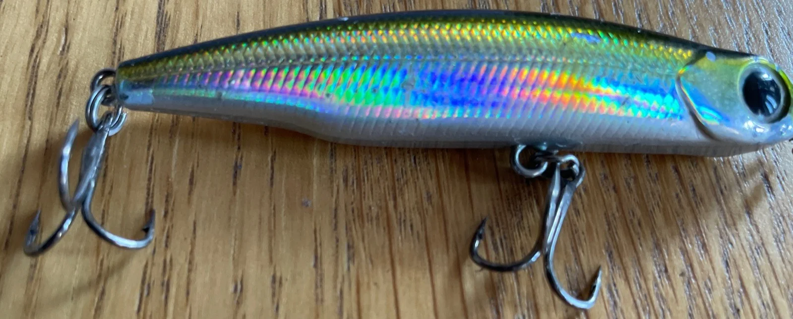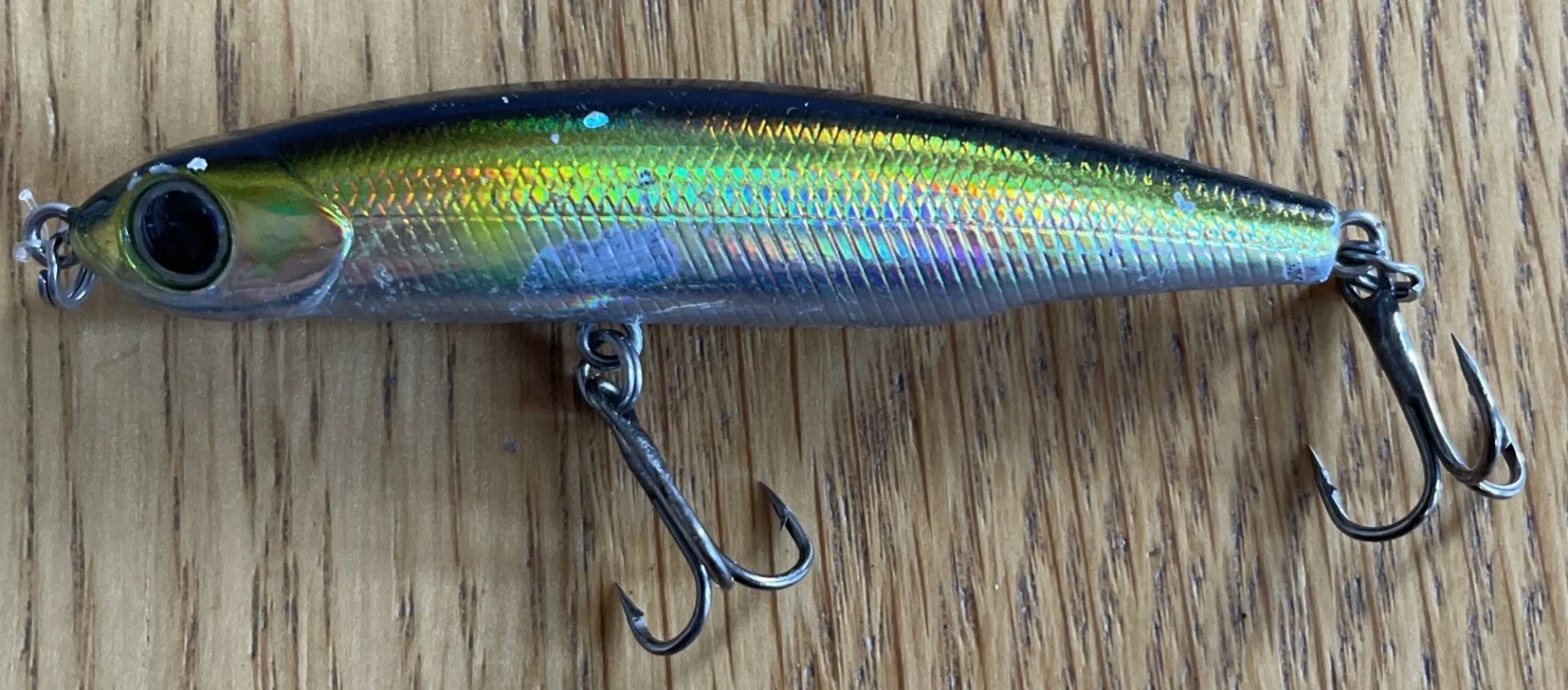 This product is a set of 2 rainbow coloured fishing lures, suitable for both freshwater and sea fishing. The lures are 3.5 inches in length and are shaped like fish. Made from plastic, these lures are designed to attract and catch a variety of fish species. Perfect for sporting goods enthusiasts looking to enhance their fishing experience with high-quality, visually appealing bait.one in need of repair (see scan)Royal Mail only