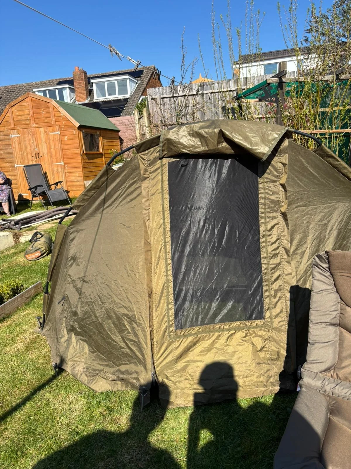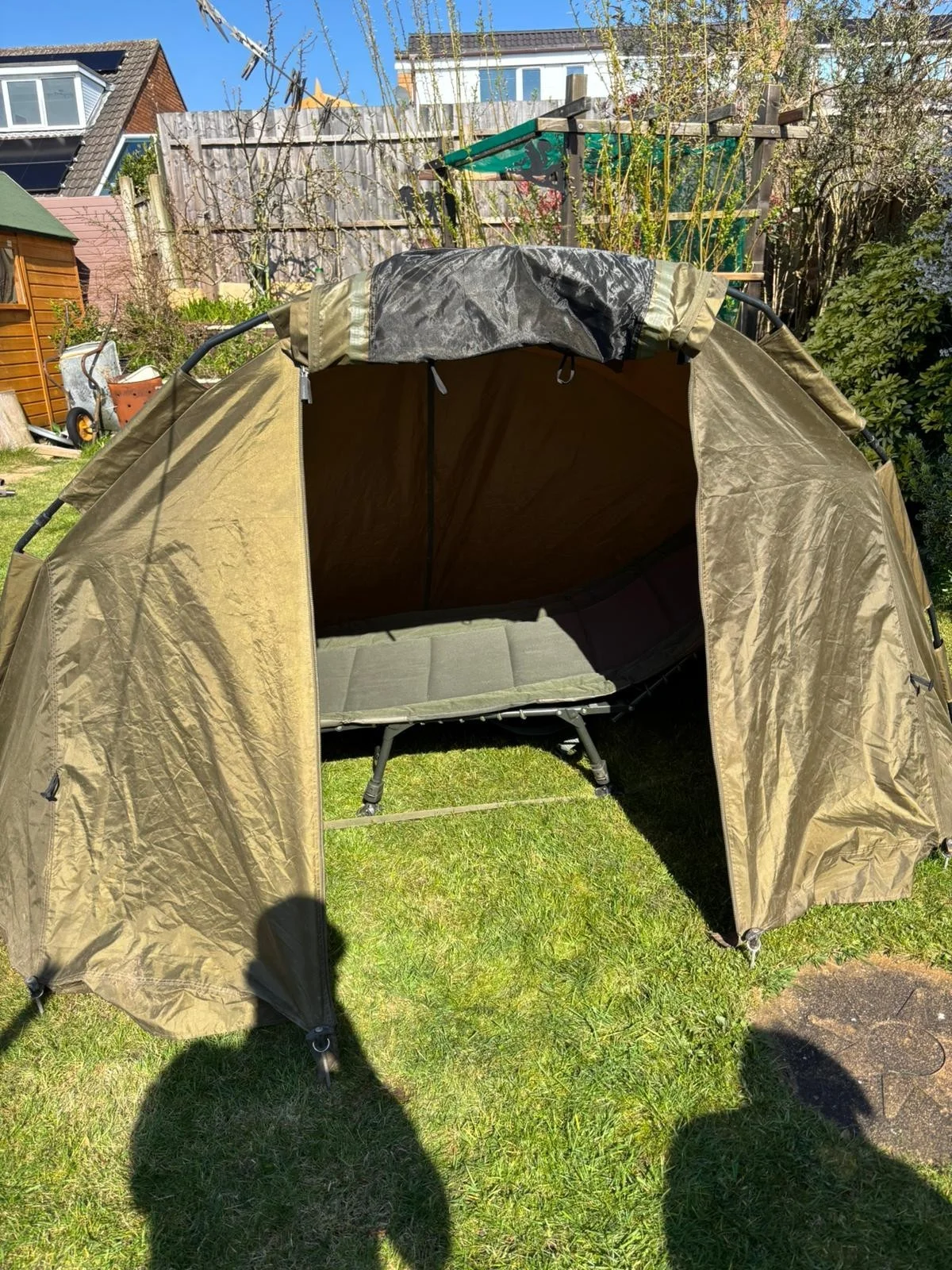 The Advanta Protector MZ Fishing Bivvy 1 Man is a high-quality, lightweight bivvy designed for one person. Made from durable polyester material, this bivvy features a waterproof design and a mesh screen for ventilation. It also includes a carrying case for easy transportation, making it perfect for anglers looking for a reliable shelter while out fishing. The green colour adds a natural touch to the overall design, making it blend in with the surroundings. The bivvy has been used many times and is still in very good condition with no holes or anything. Comes with all pegs but no groundsheet. selling due to upgrading to a bigger bivvy.