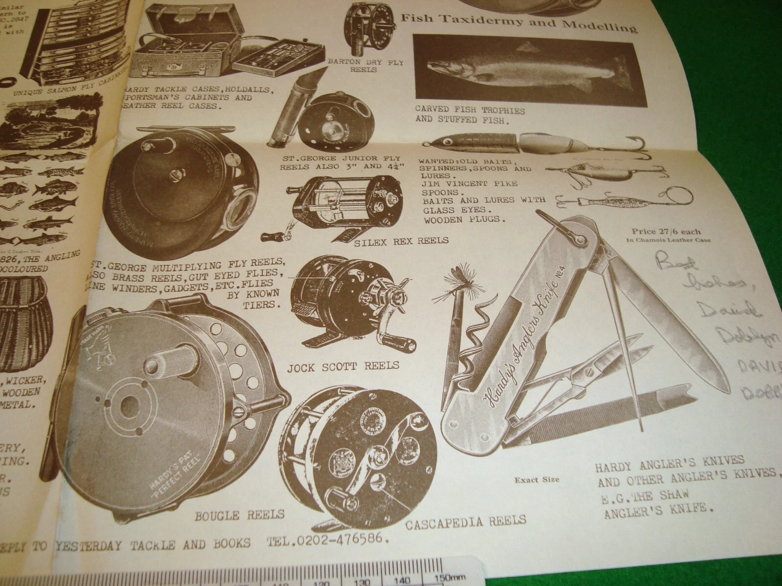Hi and welcome to the Barnabas factor.This listing is for an old Yesterday Tackle and Books promotional photocopied (at the time) sheet. I estimate that it dates from around 1992.The telephone number does not include the 01 introduced for this number in April 1995so from before that date.To the bottom right hand corner area is written and signed in pencil : Best fishes, David Dobbyn (joint proprietor at the time).Inscribed and signed later.Please see the other listed Yesterday Tackle and Books items.In very condition. Two creases to the top and bottom. Folded horizontally and vertically.Have many other items to list. Please save me as a favourite seller if you would like to.Also listed flies, lures and a plug.Please see also the other listed items including two Yesterday Tackle and Books cataloguesfrom 1992 (the same issue) with one on ebay.com-the USA site and the other on the UK site, Yesterday Tackle and Books photographs by Ray Walton from this catalogue, a rare Lo-Mass float display, a vintage float or bobber, two unusual Hardy Byers Leak Tackles, unused in their respective original packets, Bruce and Walker,Richard Walker Carp Hooks, vintage gut eyed flies and original Winfield (Woolworths) flies, Sowerbutts hooks unused in their original holders, other packets, vintage gut, lures, ephemera, packets, postcards, photographs, items from the late Peter Peck, four very old UK postal history front covers, a boxed Lledo Fox's Glacier Mints model, two watercolours which are signed V.S.Addison and two watercolours by Brian Brogan of Sheffield. Combined shipping on request. Zero extra delivery for multiplelight, slim items when sent together unless a signed for deliveryis required.Money back guarantee on all items if deemed unsatisfactory including auctions The buyer pays the return delivery.