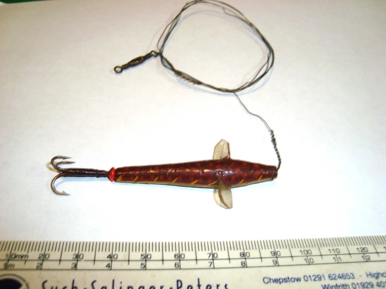 Hi and welcome to the Barnabas factor.This listing is for an old looking vintage minnow on a steel trace with a barrel swivel.The body measuring approximately 5.5cm.excluding the mount.Looks to have been homemade/handmade. Quite well madegenerally although the twin fin edges which look to be of celluloid orsimilar are unevenly cut. One of these has the word 'Made' incorporatedinto it which suggests that it came from something else and the other finhas a few letters of which looks to be the original mark of P.Wadham Newport.A mount has been added.In very good condition.Please see also the other listed items including two Yesterday Tackle and Books cataloguesfrom 1992 (the same issue) with one on ebay.com-the USA site and the other on the UK site, Yesterday Tackle and Books photographs by Ray Walton from this catalogue, a rare Lo-Mass float display card, a vintage float or bobber, two unusual Hardy Byers Leak Tackles, unused in their respective original packets, Bruce and Walker,Richard Walker Carp Hooks, two Sowerbutts hooks unused in their original respective holders, other packets,vintage gut, lures, ephemera, packets, postcards, photographs, Winfield Woolworths flies and other flies, items from the late Peter Peck, a Lledo Fox's Glacier Mints boxed model, four very old UK postal history front covers, two watercolours, which are signed V.S.Addison and two watercolours by Brian Brogan of Sheffield. Have many other items to list.Please save me as a favourite seller if you would like to.Combined shipping on request. Zero extra delivery for multiplelight, slim items when sent together unless a signed For serviceis required.Money back guarantee on all items if deemed unsatisfactory including auctions. The buyer pays the return delivery.