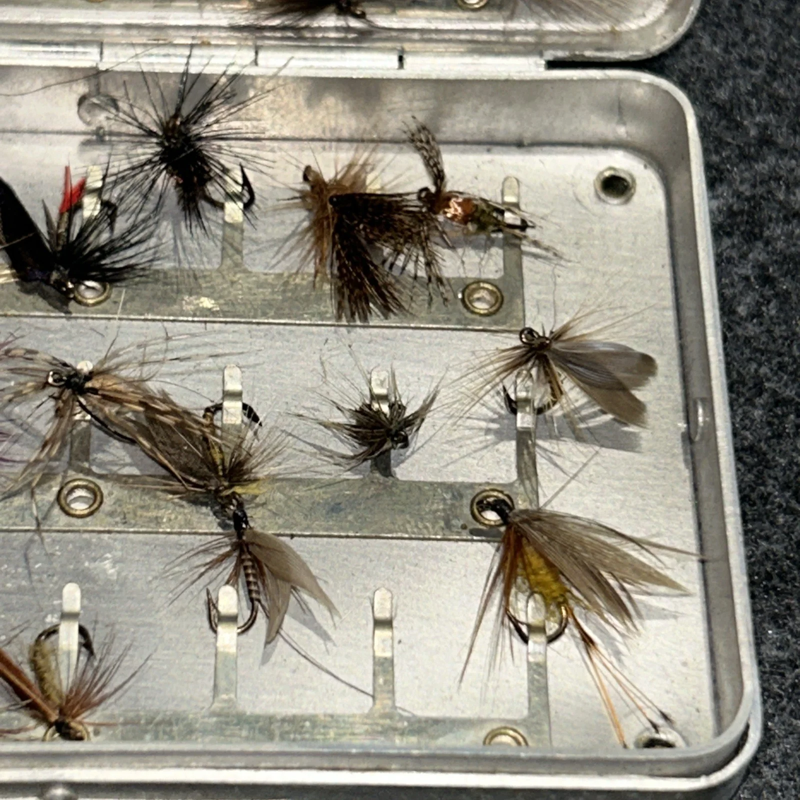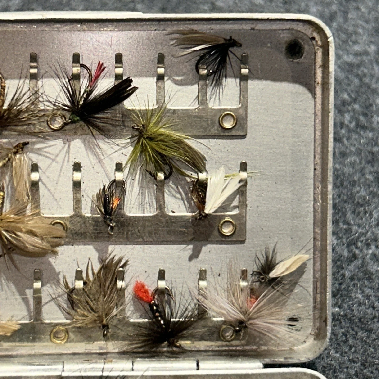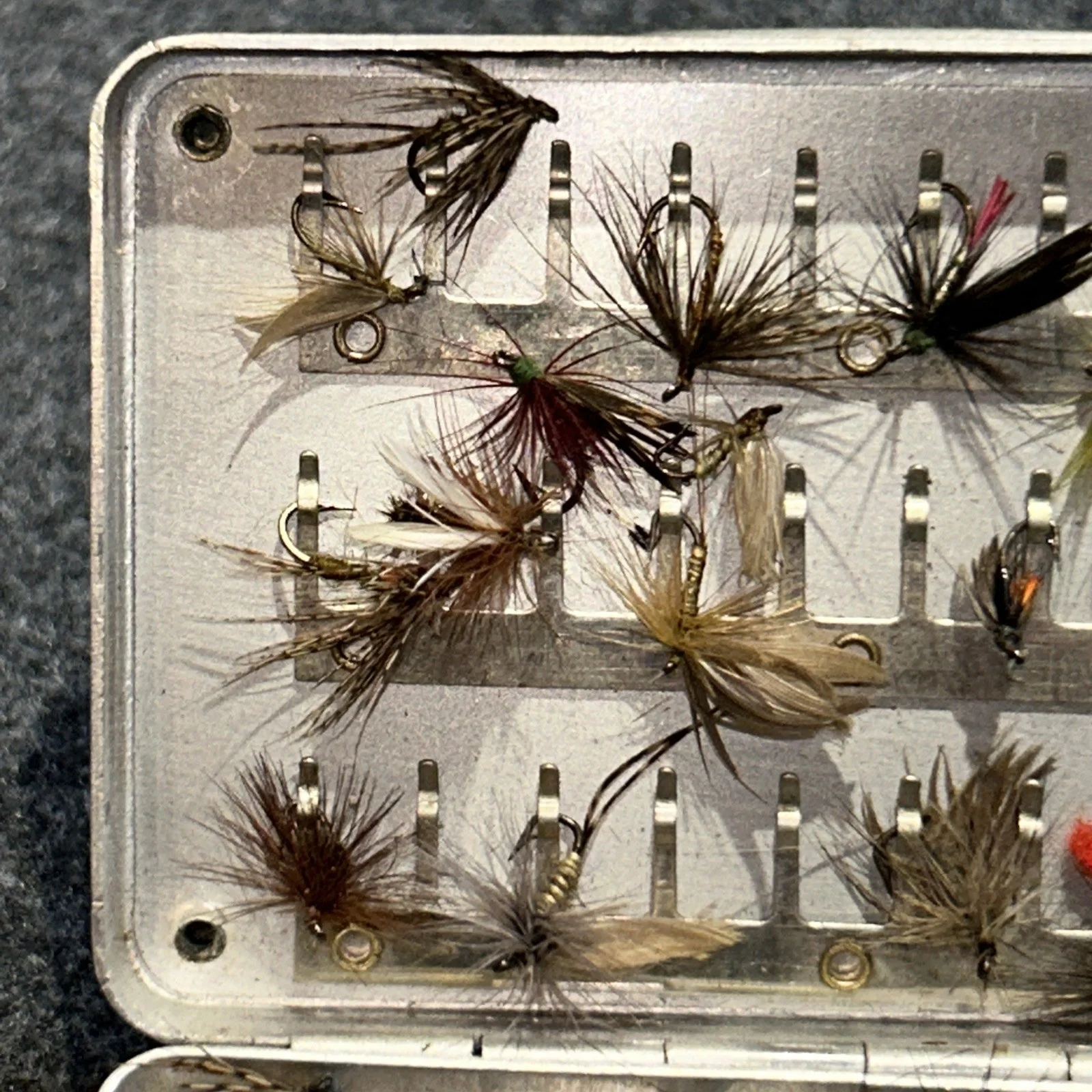 Very handy pocket fly fishing fly storage tin Richard Wheatley with few flies Measures 3.5” x 2.5”Please check out my other fly fishing listings