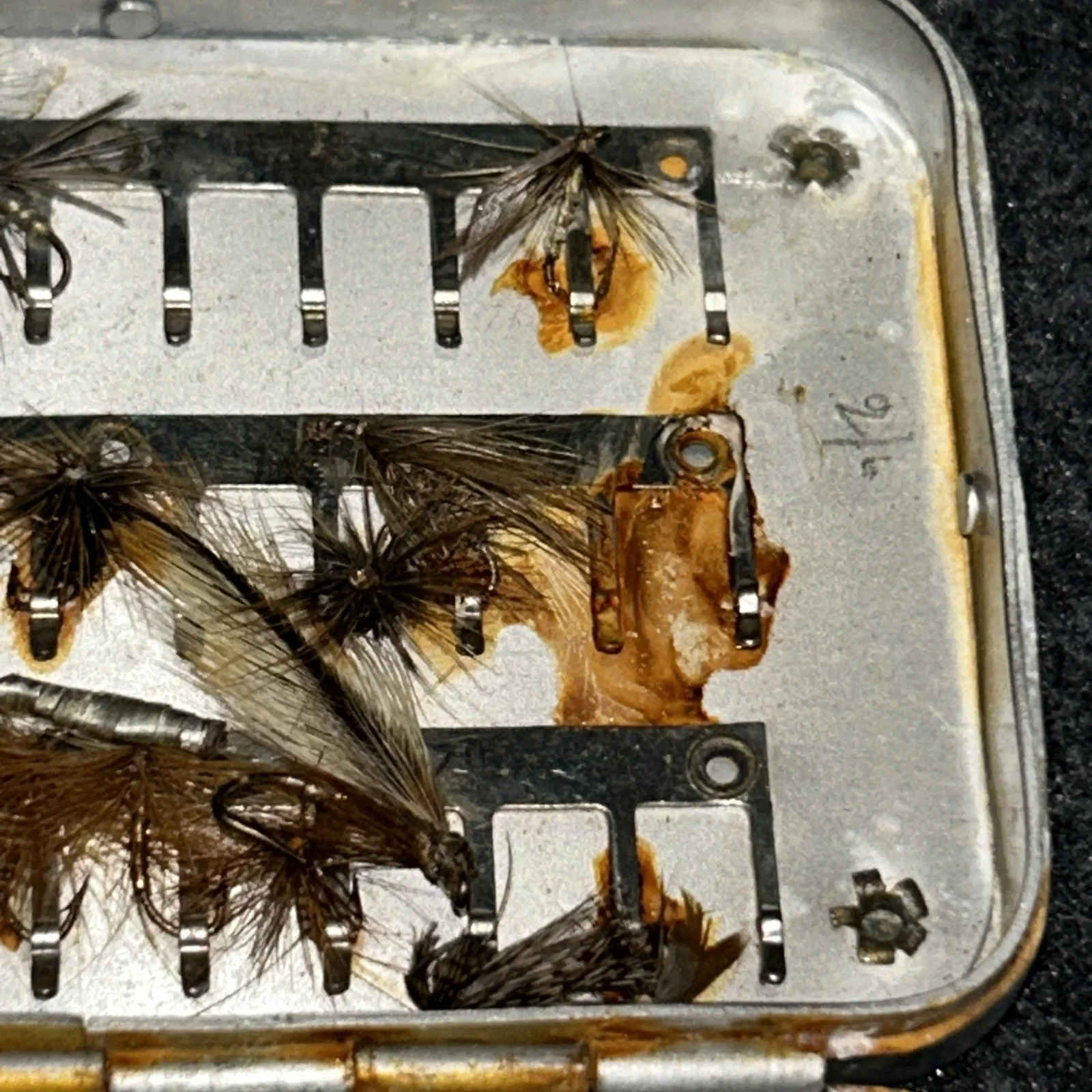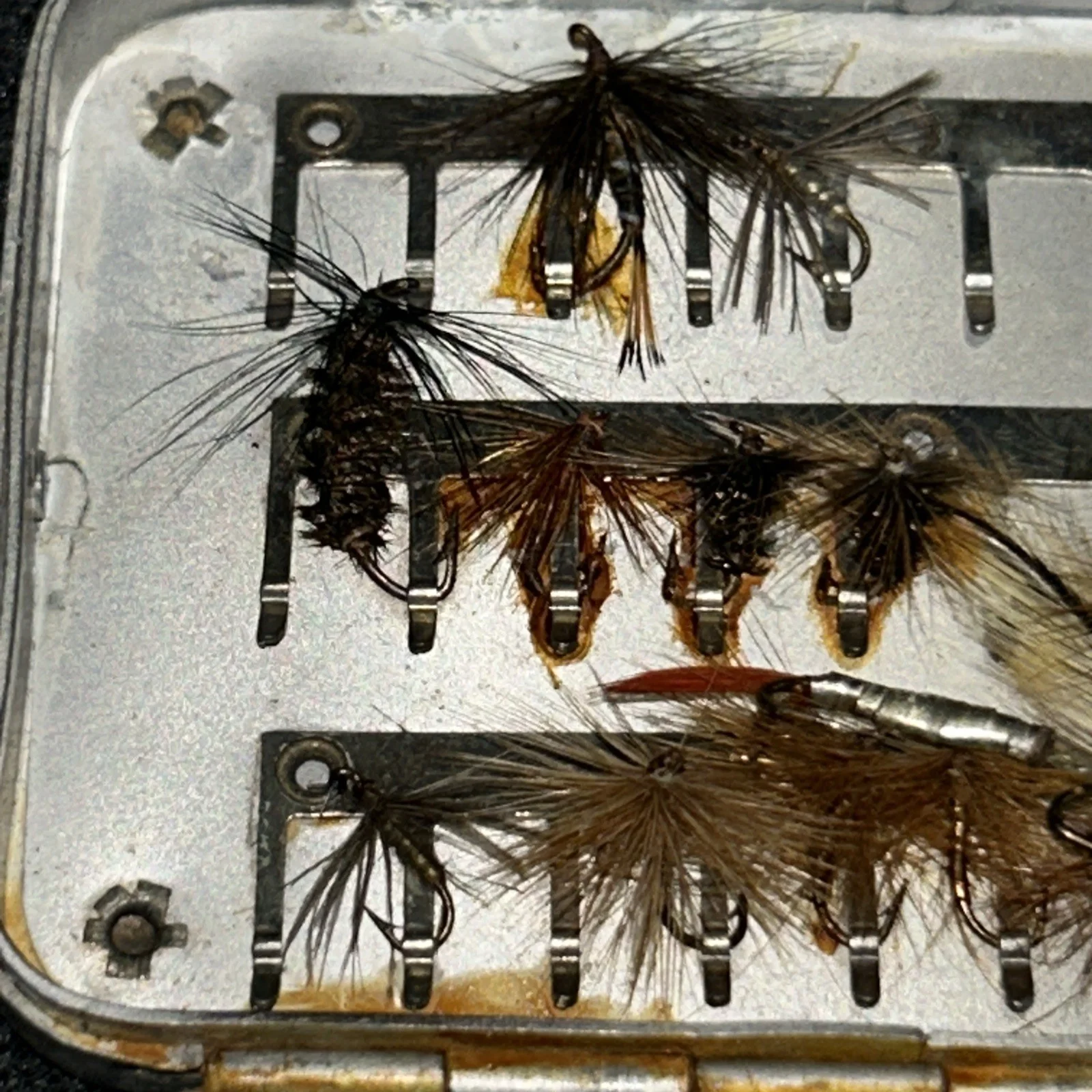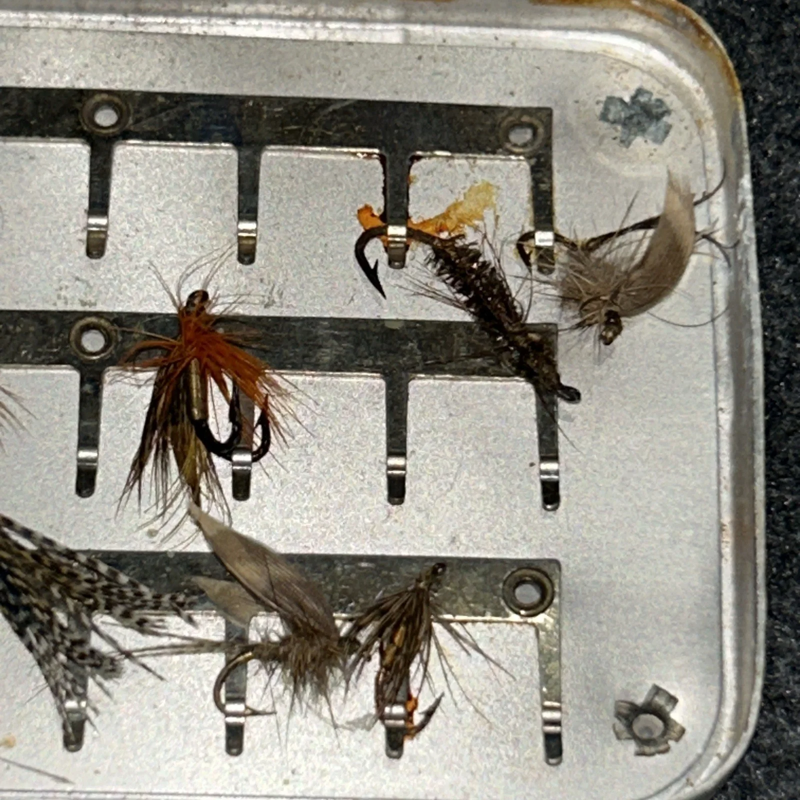 Very handy pocket fly fishing fly storage tin Richard Wheatley with few flies Measures 3.5” x 2.5”Please check out my other fly fishing listings