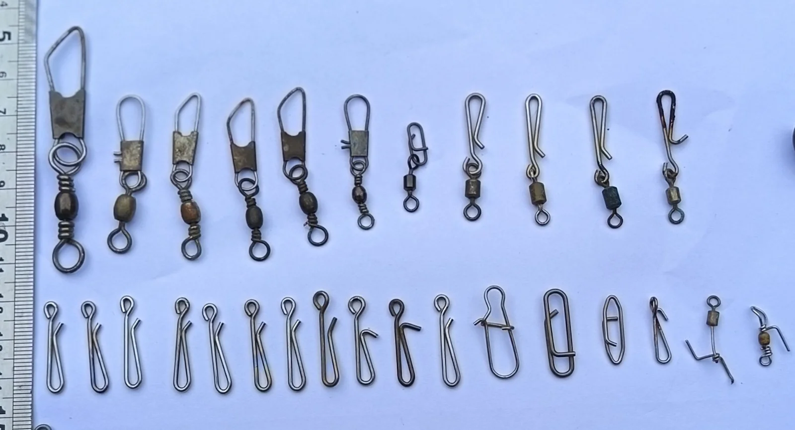 A pack of 100 used angling bits & pieces, including barrel swivels, snap link swivels, clips, slider booms (6) and swivel beads (3). Essential components of terminal tackle. These items have been used so some show slight signs of corrosion (see photos).