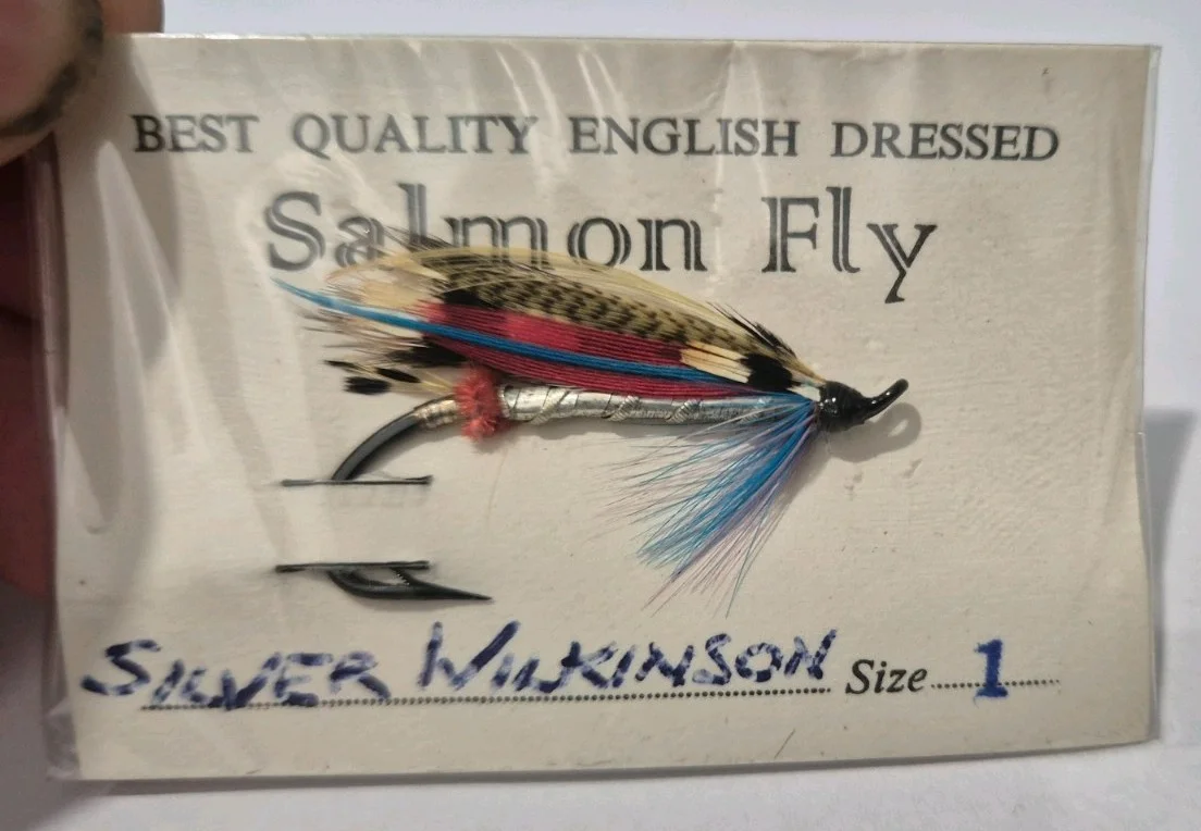 HERE I HAVE A VINTAGE SALMON FLY AS PICTURED .UNUSED SEALED IN PACKET.NICE COLLECTORS PIECE