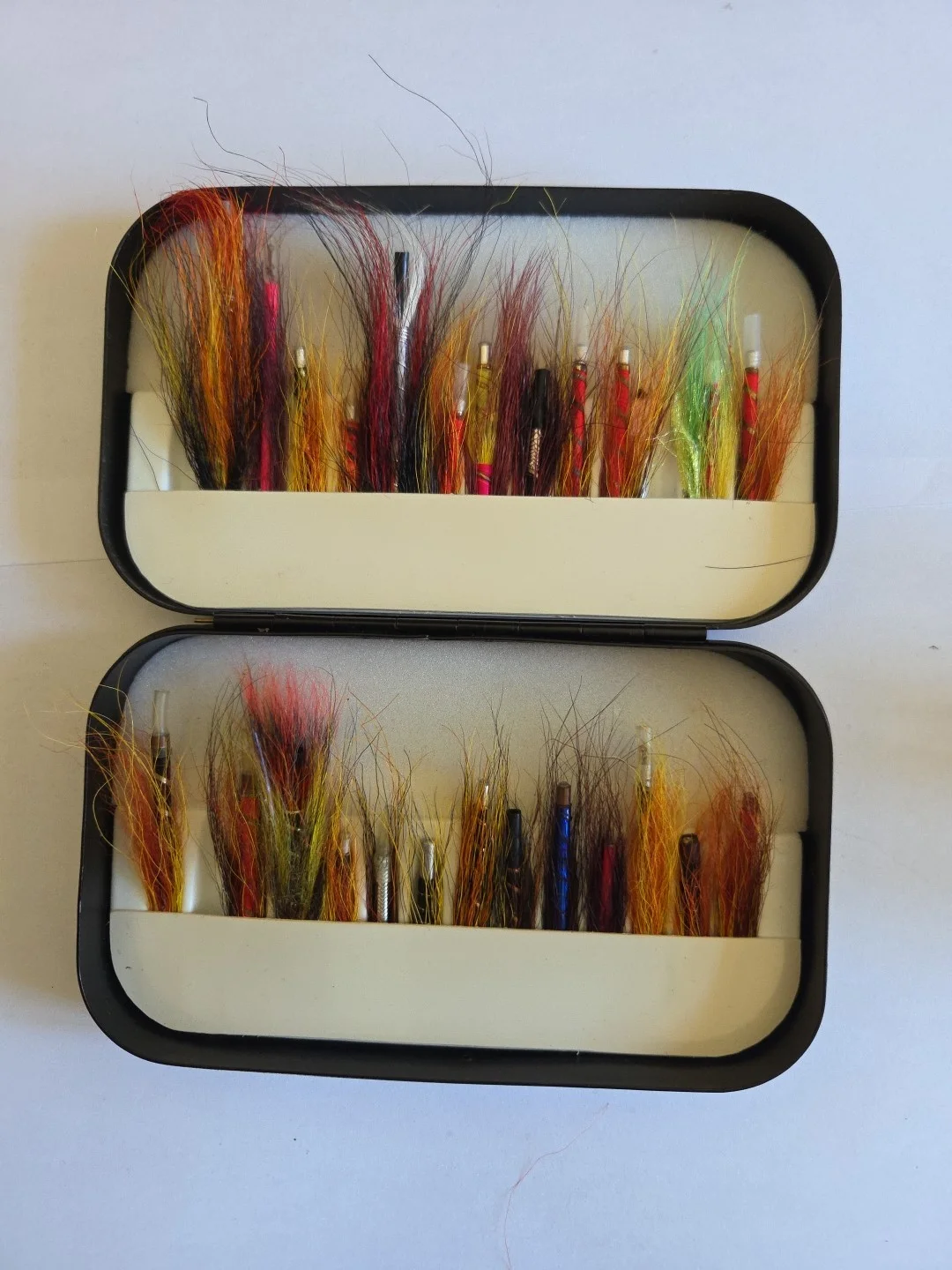Richard Wheatley Aluminium tube fly box finished in black.Complete with a selection of aluminium annd copper tube flies.Box is used but in good condition.