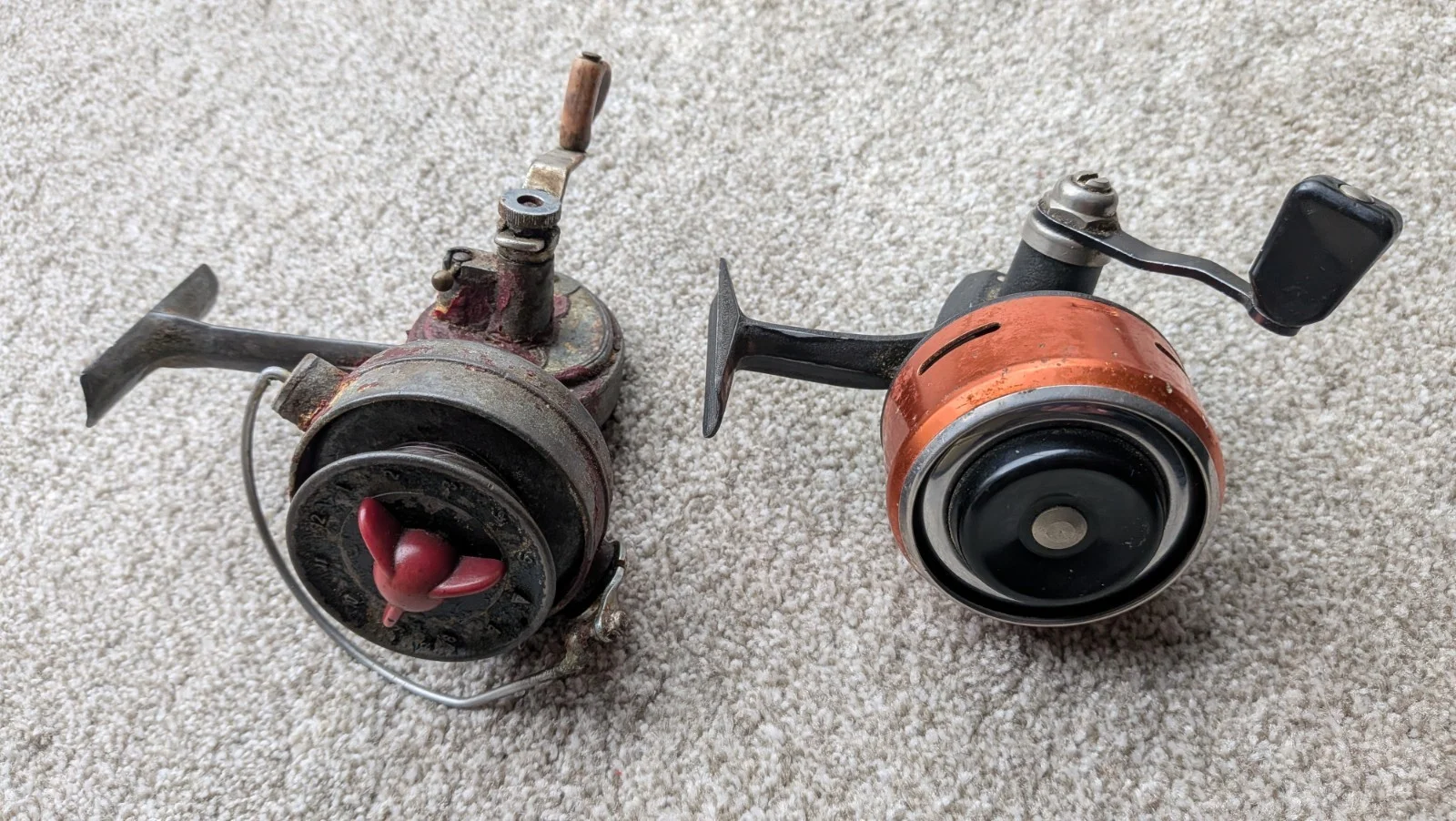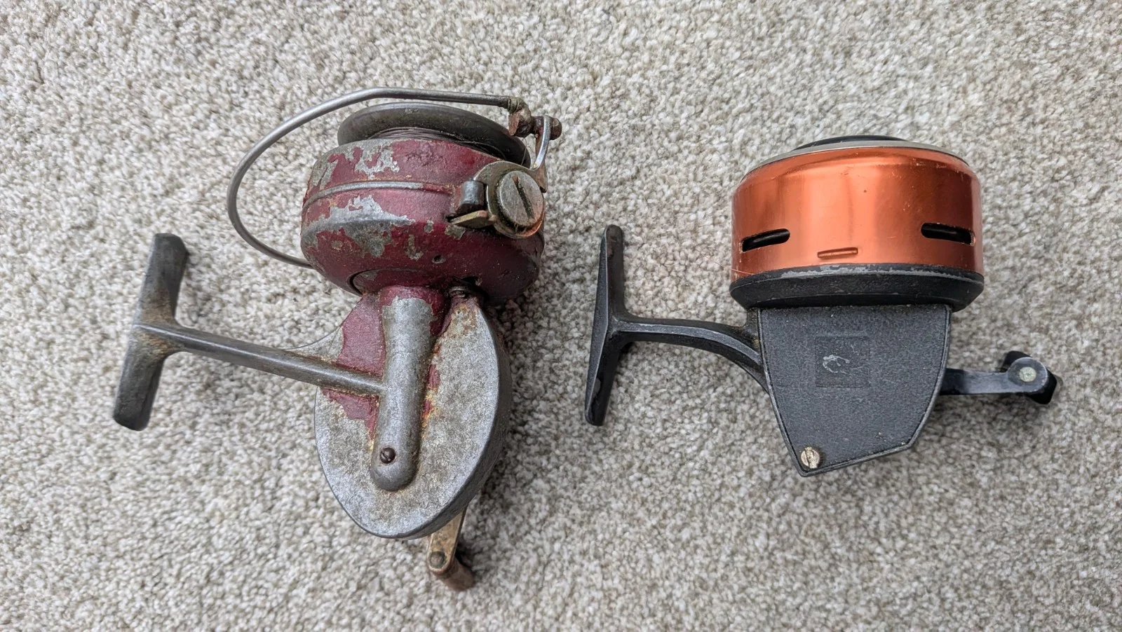 two vintage working fishing reels. one made in Germany. closed face reel made in Sweden, think may be early abu.