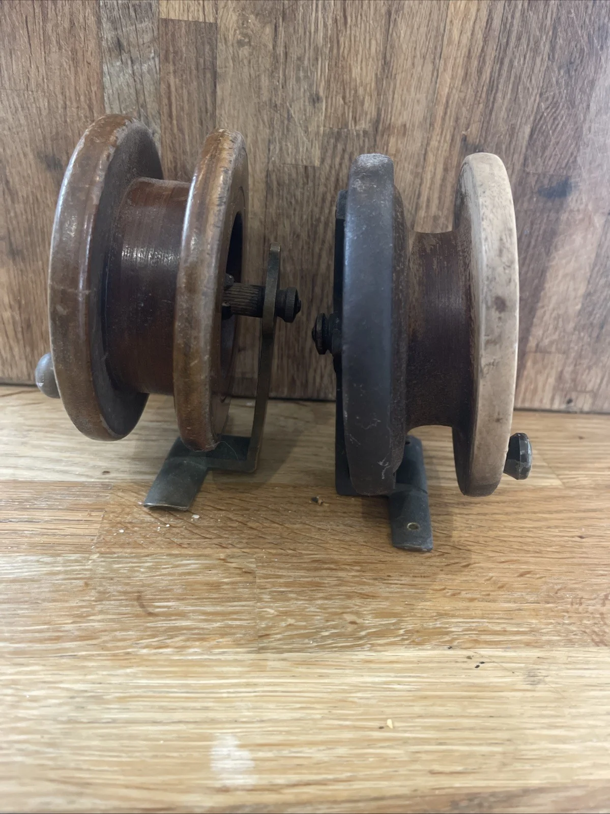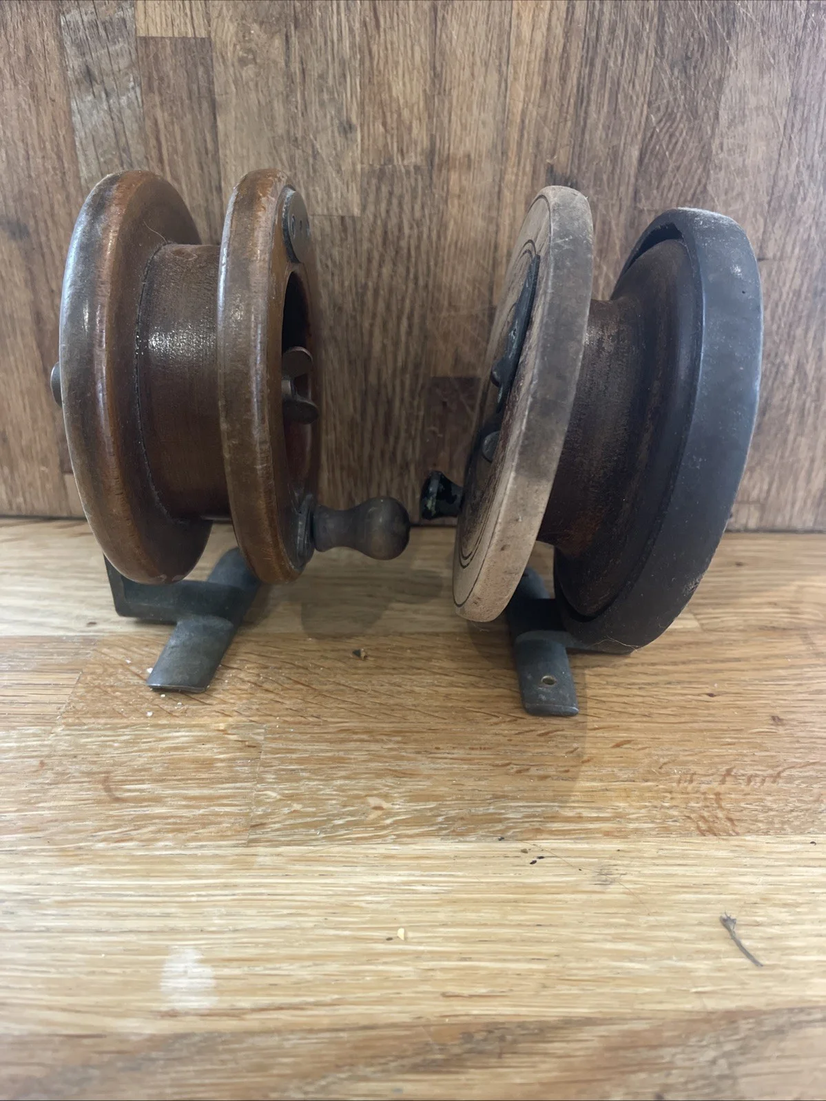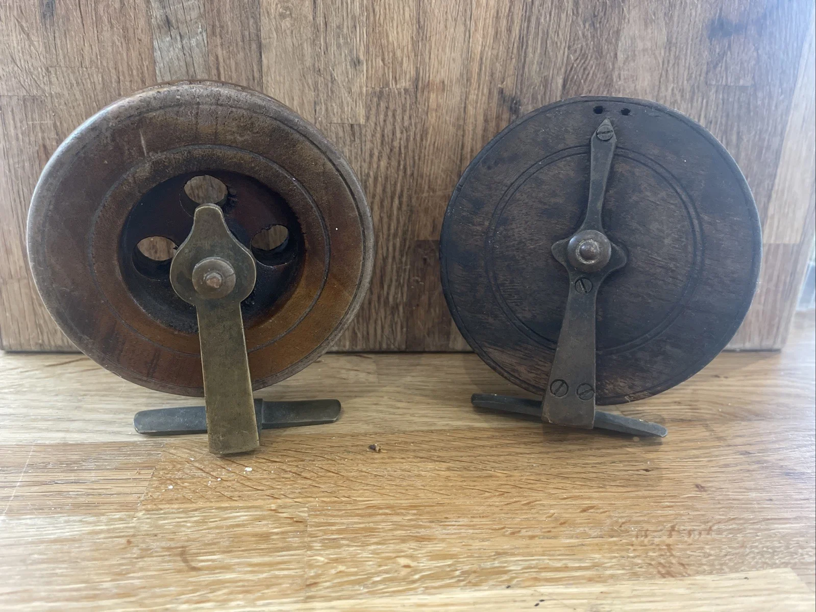 2 antique fishing reels. I used this as decoration in my aquatically themed cloakroom. I can’t tell you mush about them as I’m not a fisher man but I do find them rather attractive for a man cave etc. Made of dark wood and brass. I think they could look really special polished and waxed.