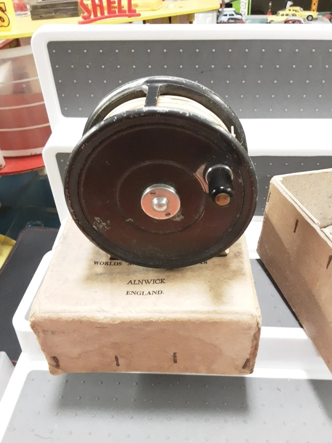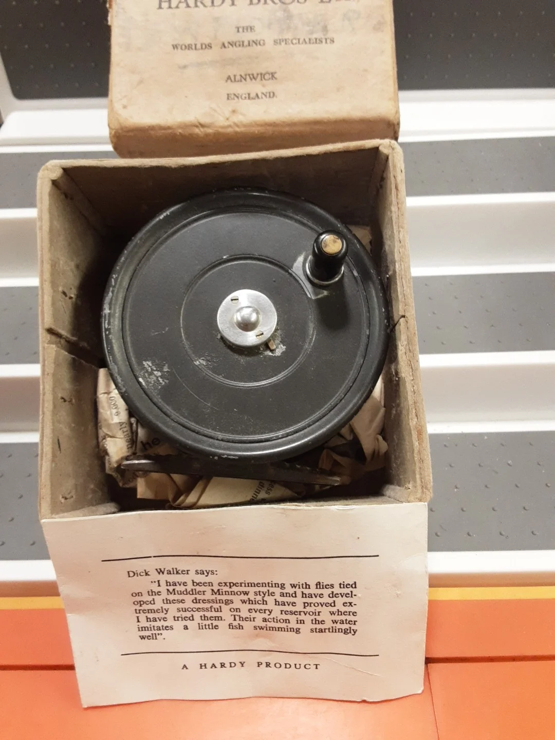 The Hardy Bros LTD Antique 3 3/4 Fly Fishing Reel UNIQUA is a vintage piece of sporting gear that hails from the renowned Hardy brand. This classic fly fishing reel, designed for the sport of fishing, is a piece that exudes both style and functionality. The original box adds to its collectible charm, making it a must-have for any fly fishing enthusiast looking to add a touch of history to their gear collection.this a old reel I've pulled line of and would line back on but don't know if you can still fish with it