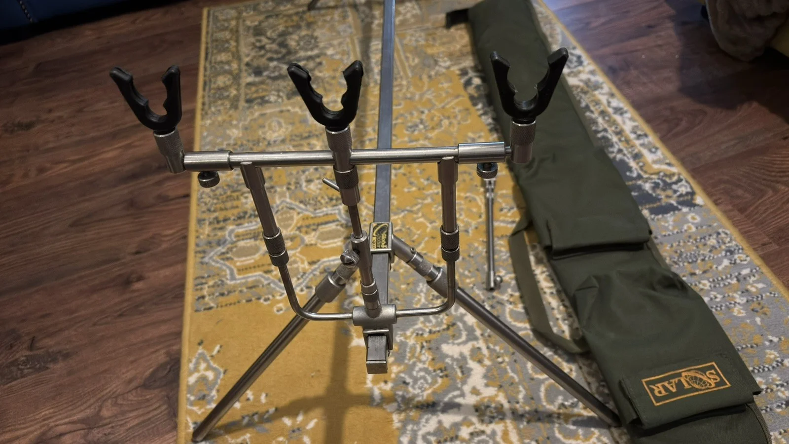 Solar globetrotter rod pod.Very good sturdy condition.One adjustable leg is ever so slightly shorter than the other 3 , but this doesn’t cause any issues (see very last photo)Please see all 23 photos, as this is everything you will receive.Please choose Evri couriers when selecting a courier as it will be too long for other couriers & I will not be able to post, many thanks