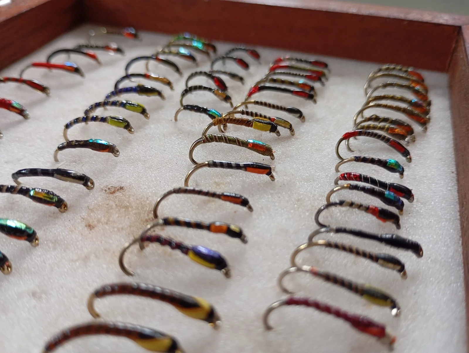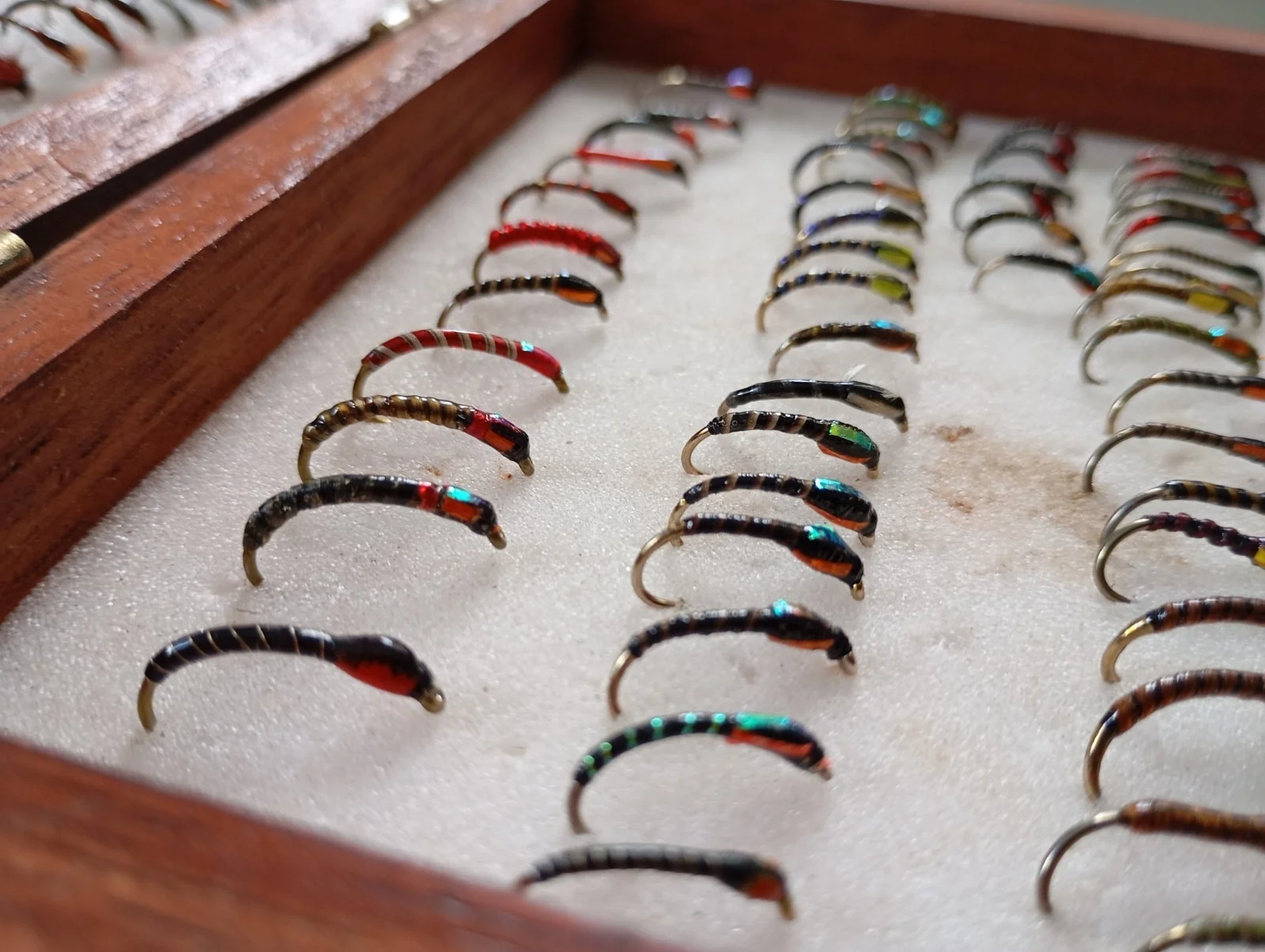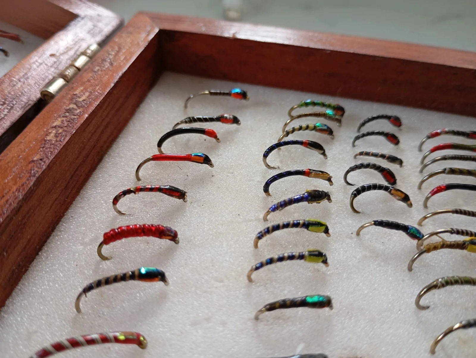 A fantastic selection of flies in a Quality hardwood Bob Church double sided fly box.Some fabulous buzzers, lures and nymphs included. Check out the images.All flies on quality hooks, a mixture of sizes. Over 225 flies included!Box measures approximately 14x13x8cm. Catches have rust but still function like the day they were made. Plenty of life left in them.Everything you see in the pictures is included.Any questions, please get in touch.Just 99p starting price. No reserve!Please check out my other listings too including other incredible fly boxes stuffed with flies!