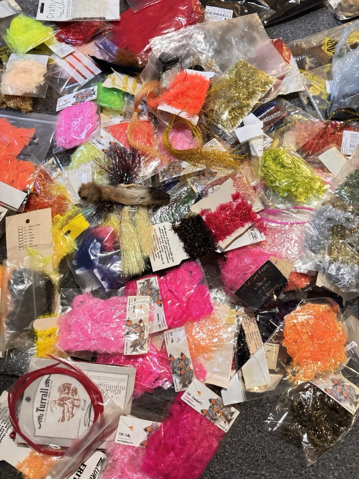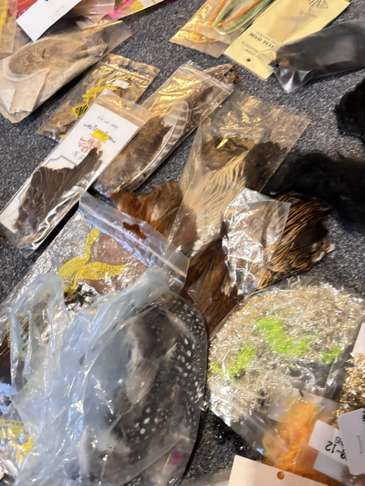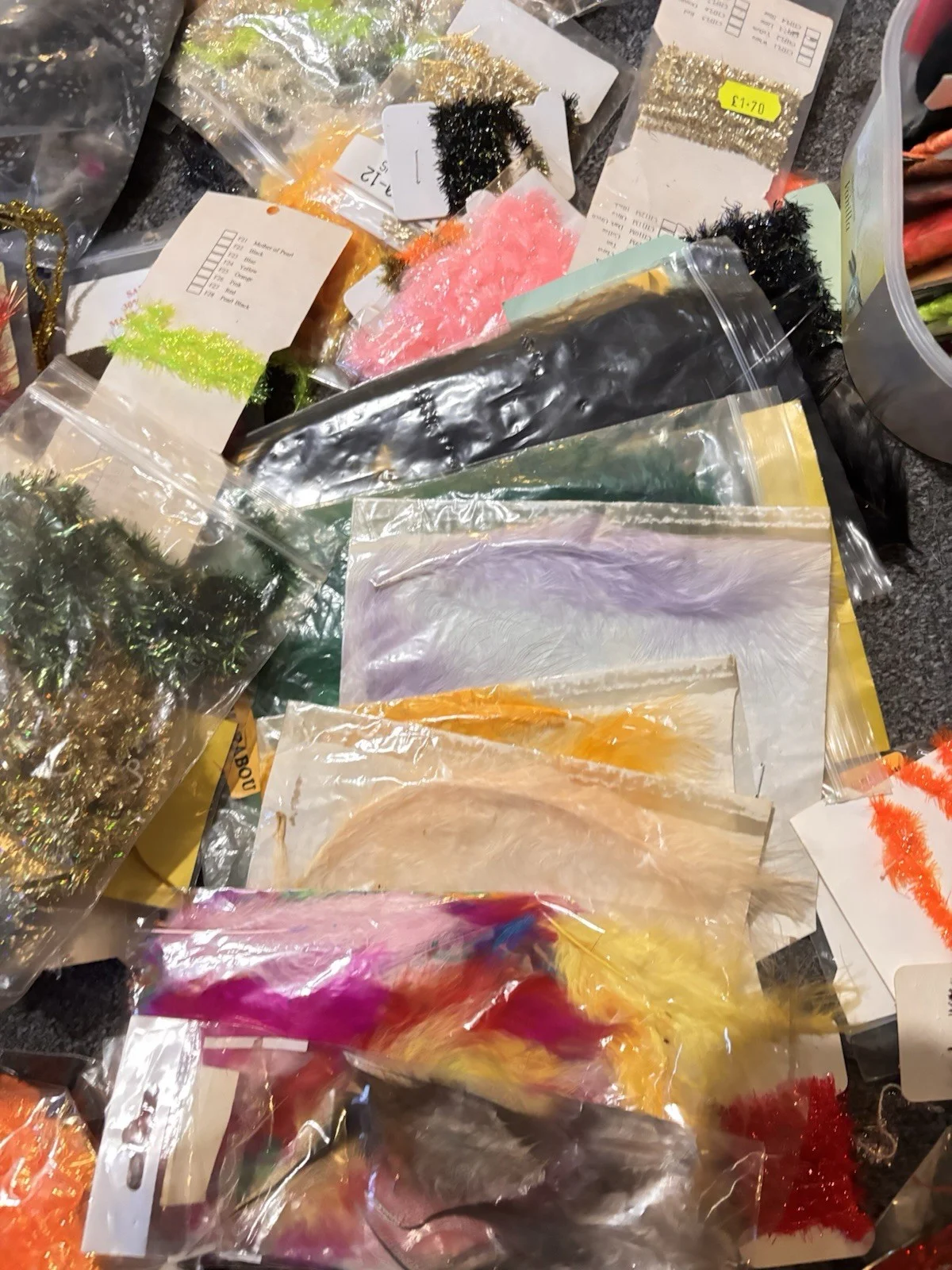 Loads of fly tying materials, everything in the picture, feathers, hackles, wings, loads of fritz material etc etc