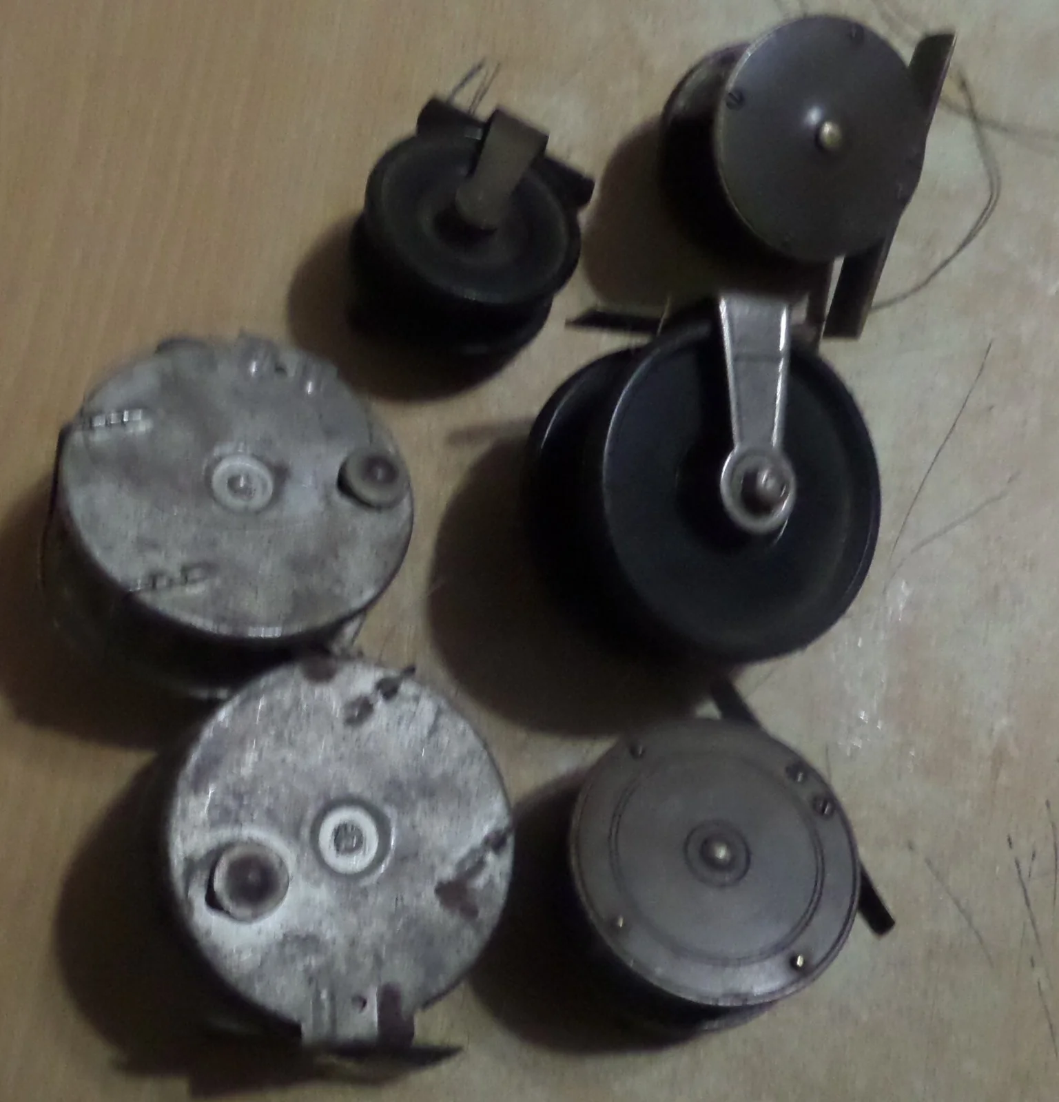 the listing is for a quantity of 6 unnamed vintage fishing reels 2 off brass 2" & 2 3/8" - 2 off bakelite 2" & 2 3/4" & 2 off steel 2 7/8" - all good condition - see photo's - if further info required please email or mobile 07957238225 thank you.