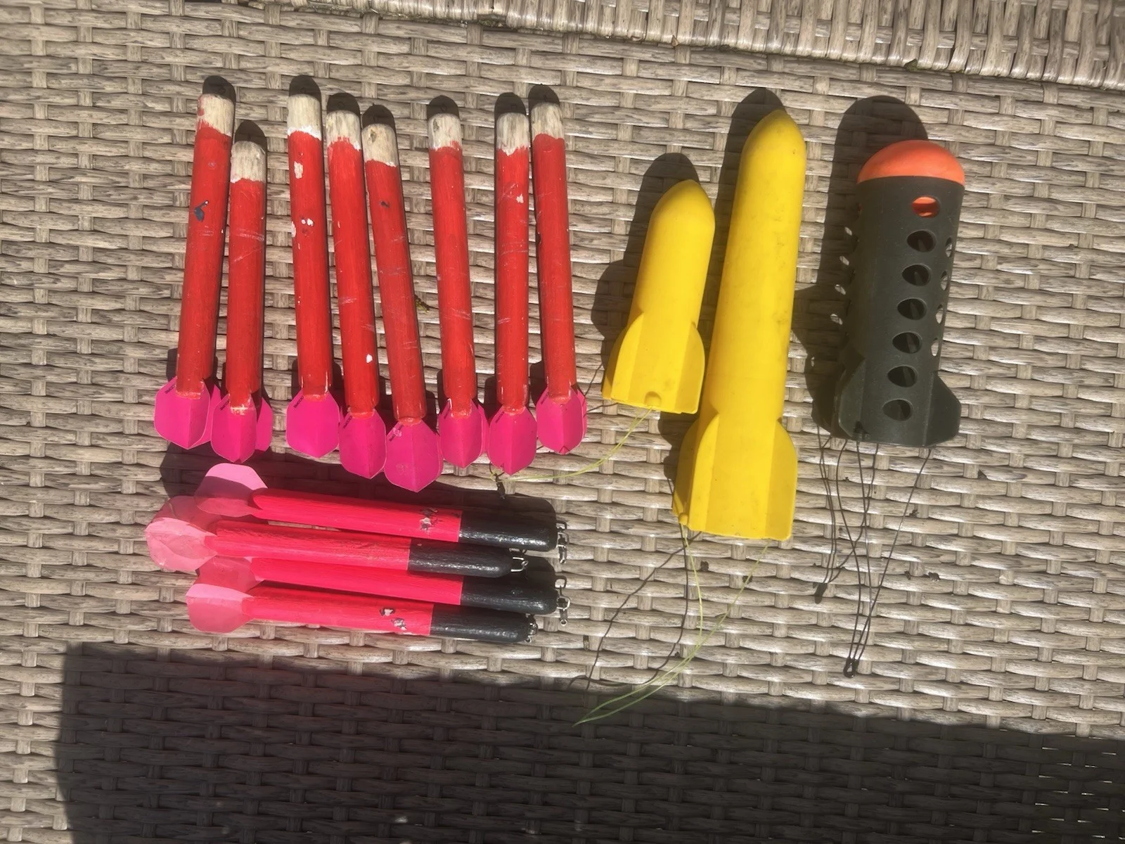 Selection of Carp/Cat fishing marker floats and Spods. Includes 12 homemade Marker floats and 3 different Spods. 1 Korda Skyliner Spod, and 2 Gardner Pocket Rockets in different sizes.