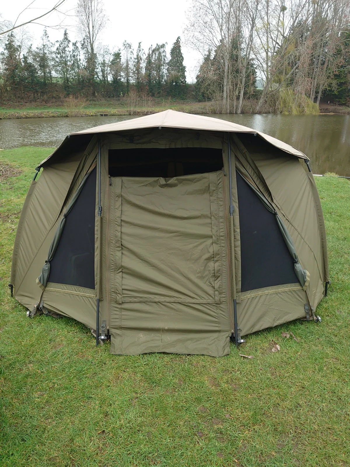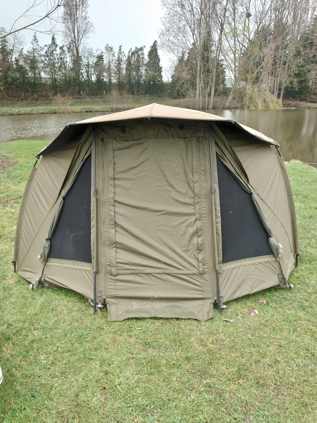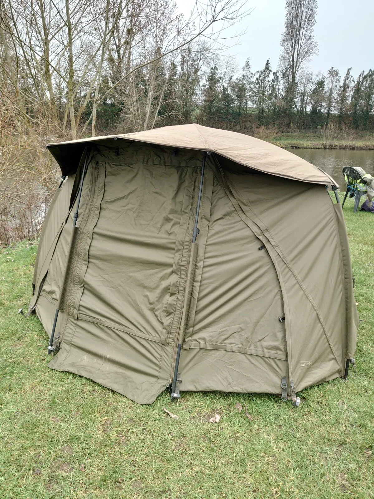 Trakker Tempest 100 Bivvy, includes skull cap, zip in front panel, ground sheet (small split in sheet) easy repair, pole 5 (middle rear) needs a fix.. see pics of damage, there's small split at the very bottom of the door flap but doesn't affect use, also a small piece missing from where the zip caught it again doesn't affect use as it's under the peak, it has new storm poles, excellent cheap bivvy for start up angler, just needs a wipe over, easy fast set up and pack down. See pics of repairs needed.Only serious bidders bid.I will repair what I get time to do. Sold as seen. Can be seen up if required for piece of mind.Advertised elsewhere.Cash and collection only.