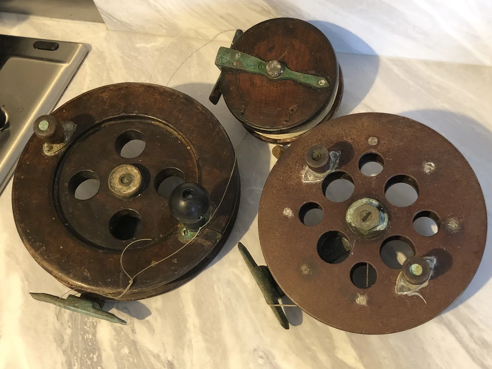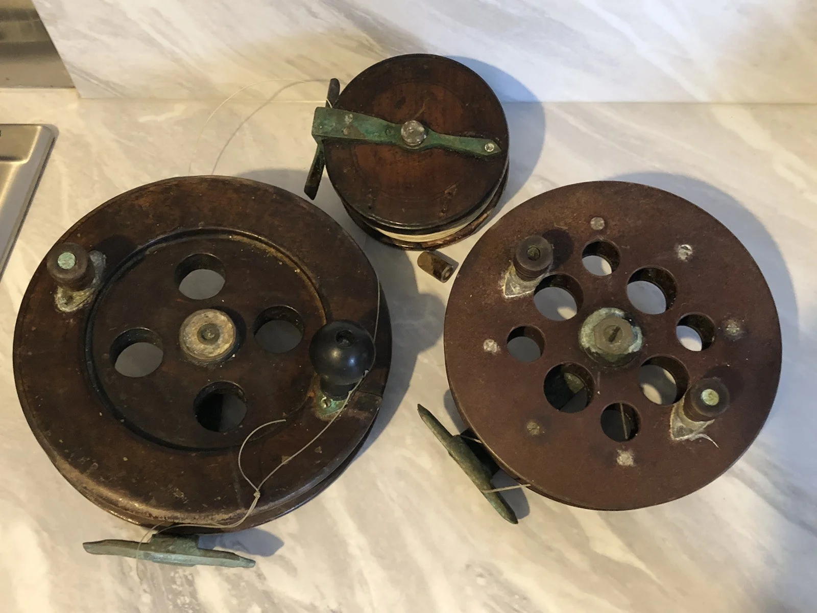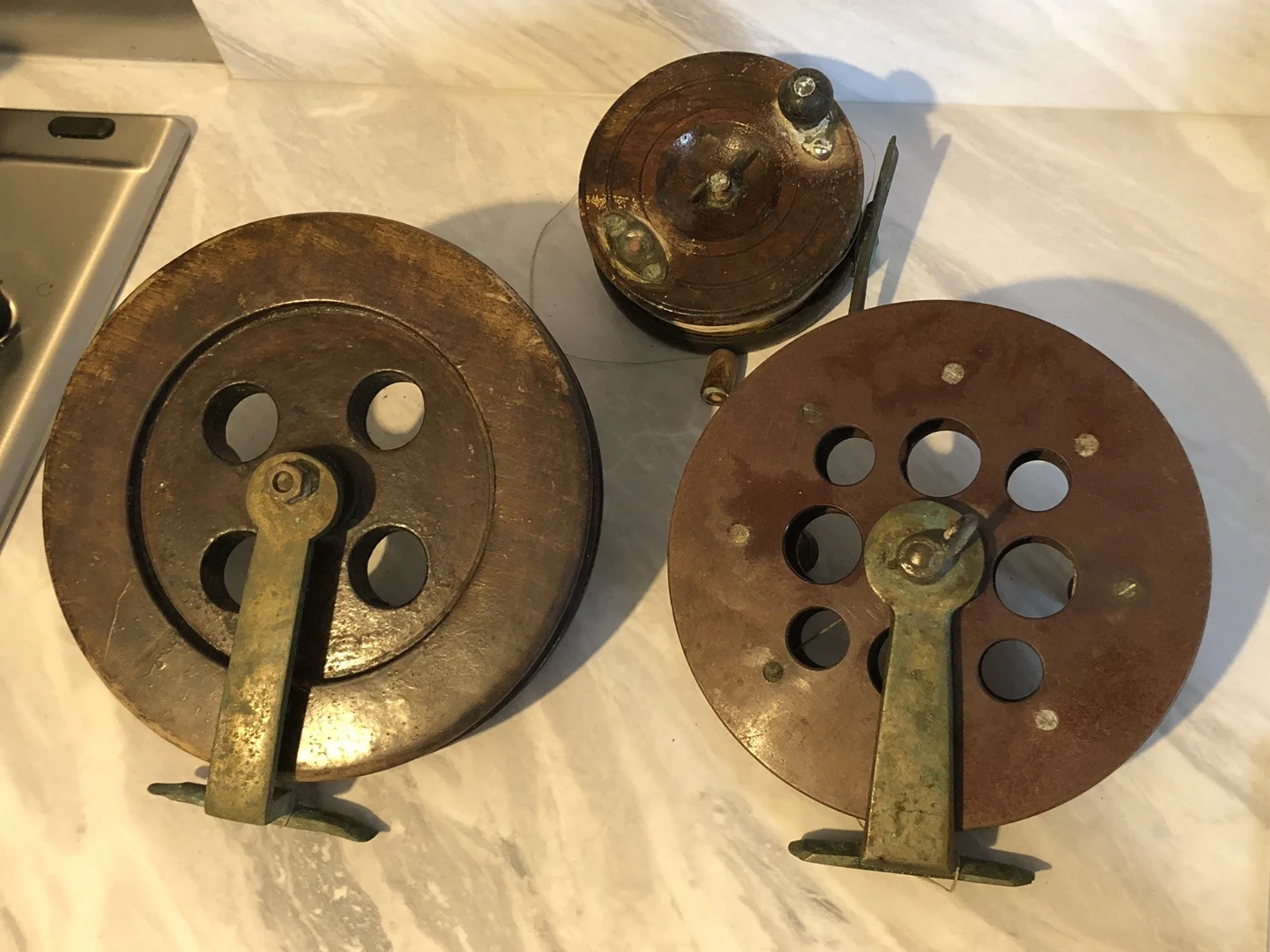 Job lot of 3 antique reels as pictured the large two are in perfect working order but the little one has a handle broken and it doesn’t want to turn.Thank you