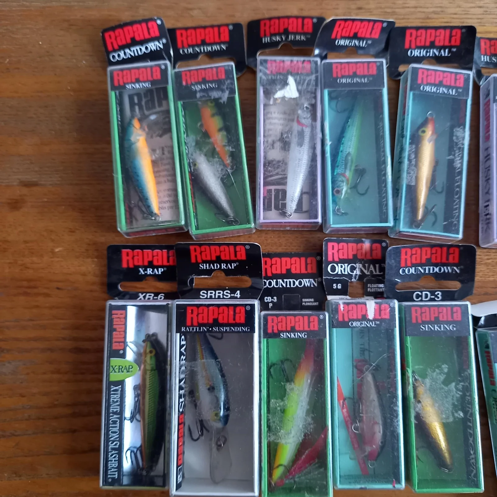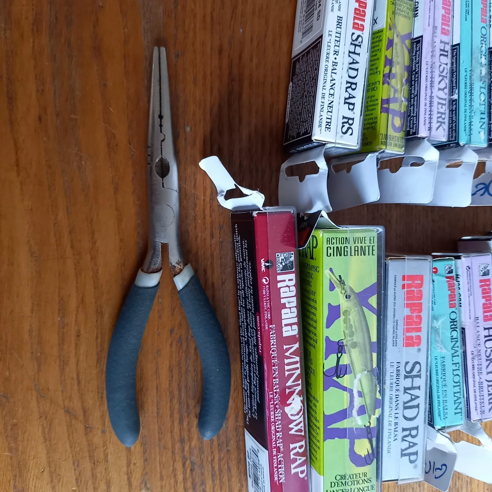 A selection of lures and lure fishing equipment.UK ONLY PLEASE(1) 18 Rapala lures (yes, I know there's only 17 in the photo)of various sizes and models.(2) 12 miscellaneous spinners (in 2 plastic boxes)(3) 4 Vibrax spinners (in their packets) (4) 3 Toby types lures (in their packets)(5) 1 Mepps in packet (not used)(6) 2 misc. lures (in their packets)(7) 1 Fladen spinner (in packet)(8) One lure holder (unused)(9) One large plastic box with 10 misc. lures (spinners, poppers, tobys), 5 pkts hooks, and pack of trebles(1) 1 pr Rapala pliers (slight corrosion)